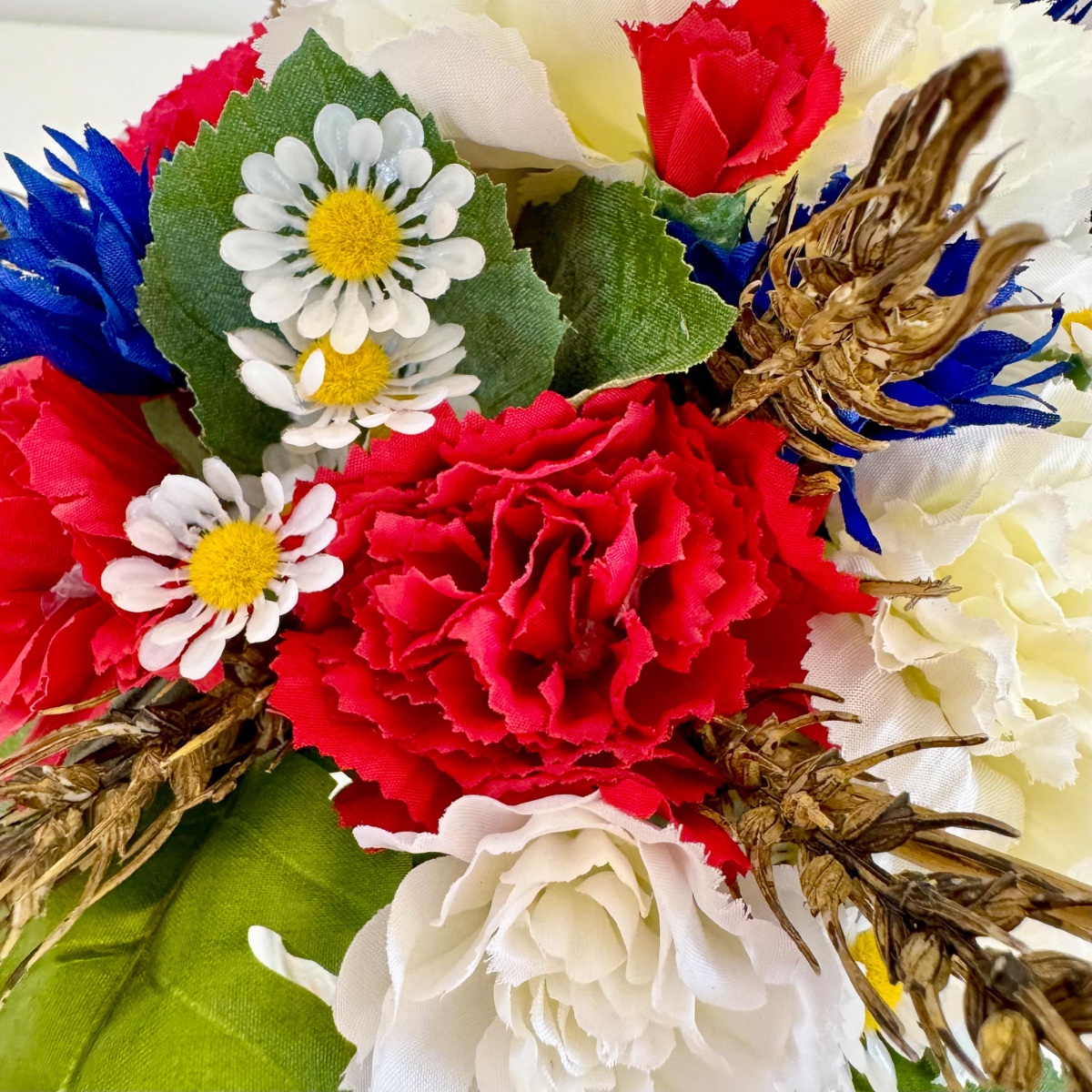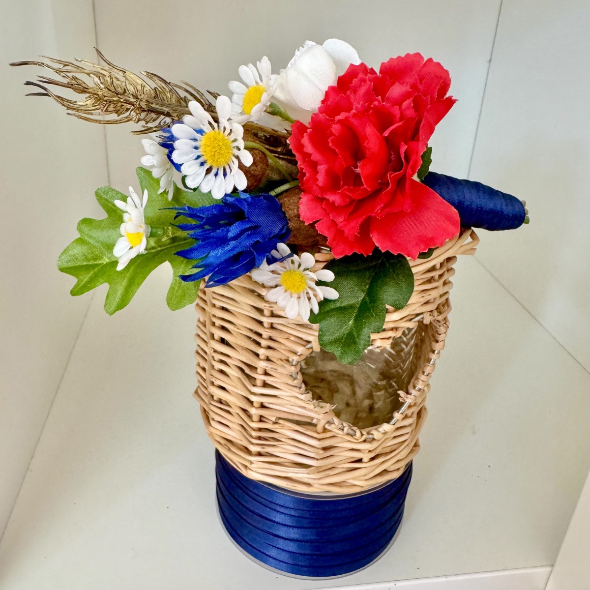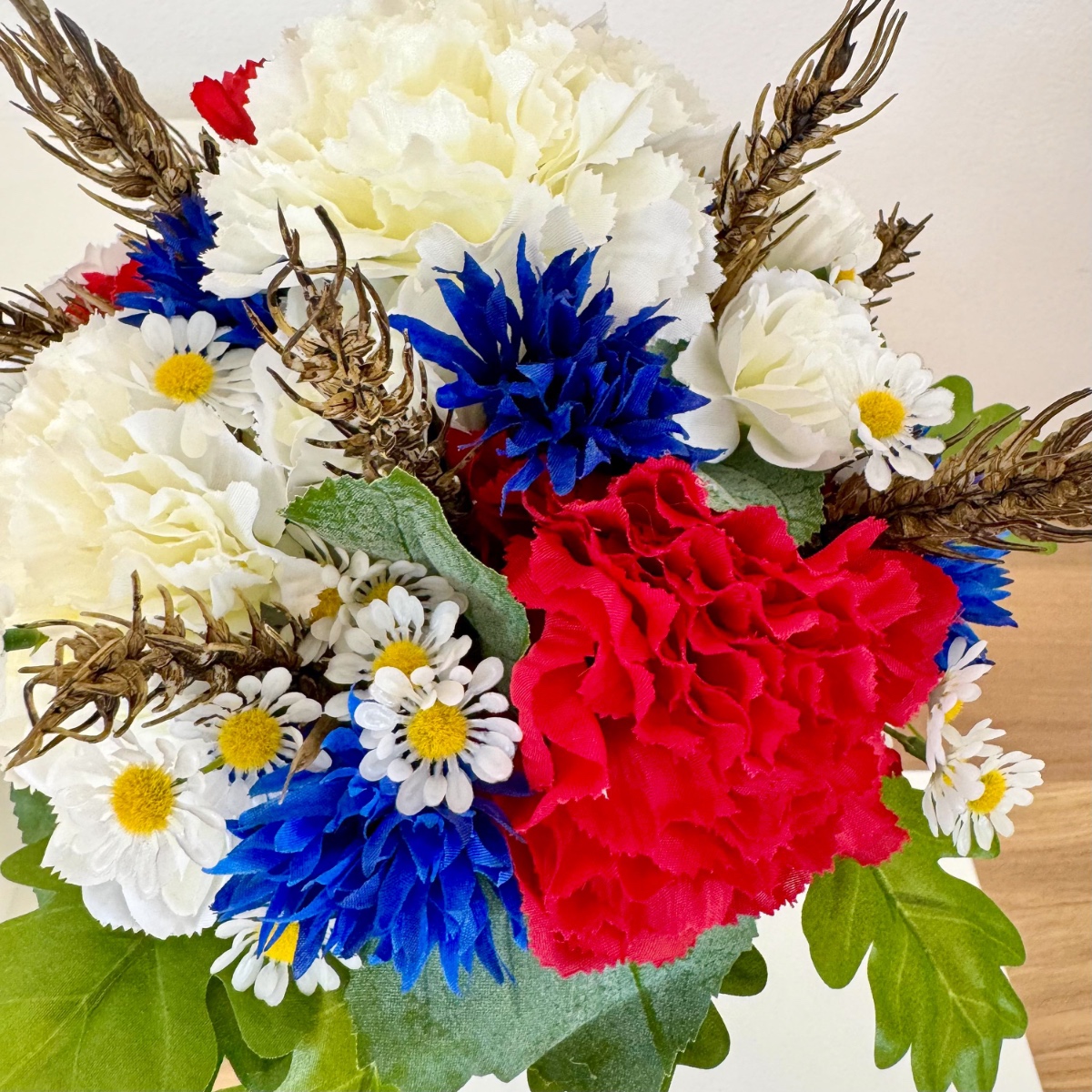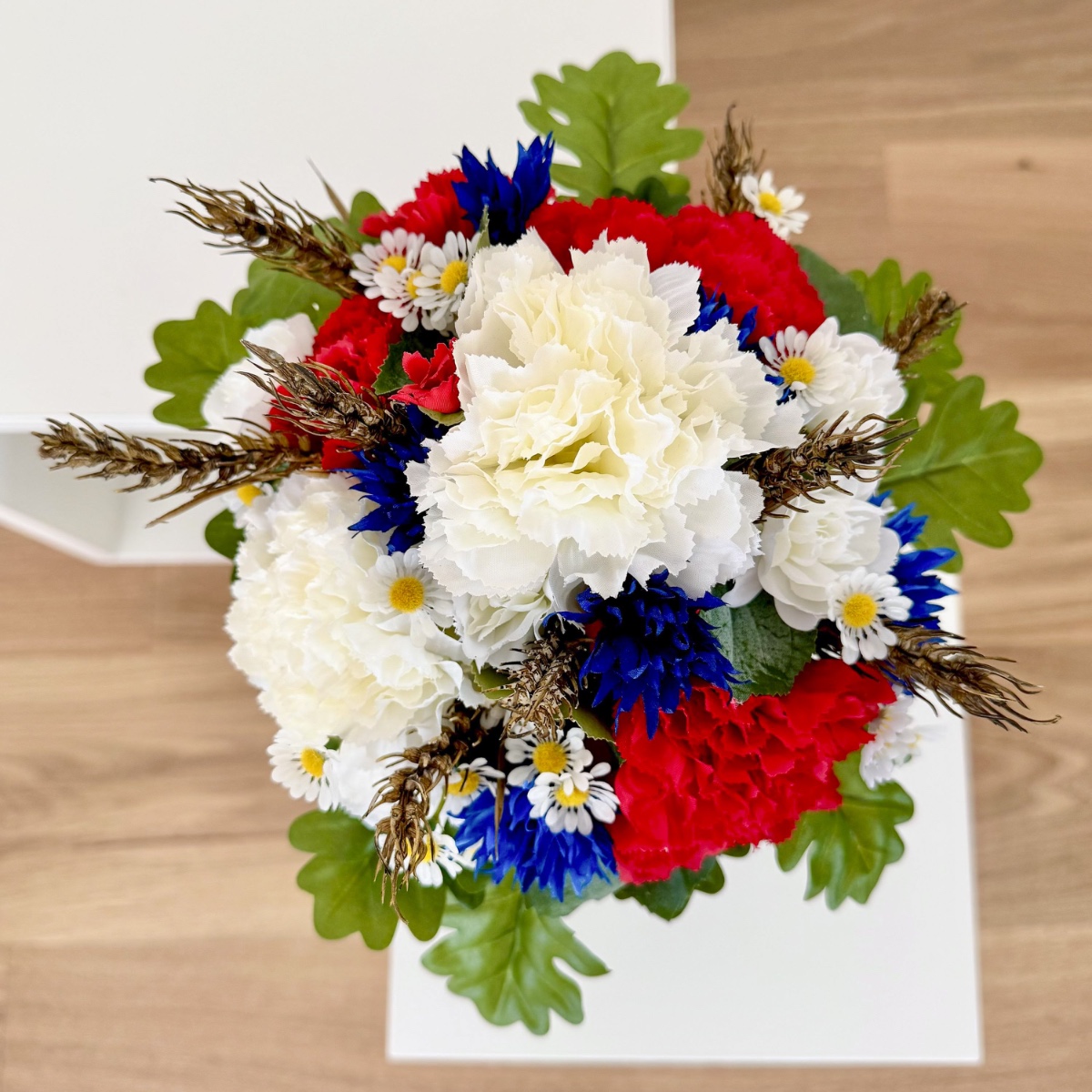Un bouquet empreint d'amour, de force et d'attachement à ses racines ! Pour son mariage, Tina souhaitait un bouquet de mariée doté d'une symbolique particulière. Au centre de la composition, on trouve des œillets rouges et blancs très expressifs, ainsi que des bleuets bleus comme fleurs principales. Les œillets rouges symbolisent l'amour passionné et le dévouement, tandis que les œillets blancs représentent la pureté, la fidélité et un attachement sincère. Le bleuet complète la composition en apportant des notions de naturel, d’espoir et de constance. La délicate camomille, utilisée comme fleur de remplissage, confère une douce légèreté au bouquet et symbolise traditionnellement le calme, la modestie et la force intérieure. Les épis de blé dorés apportent non seulement une touche chaleureuse et structurante au bouquet, mais symbolisent également la fertilité, la prospérité et un avenir commun. La verdure est dominée par des feuilles de tilleul et de chêne : les feuilles de tilleul symbolisent l'amour, la sécurité et la communauté, tandis que les feuilles de chêne incarnent la force, la fermeté et la constance. Ensemble, elles créent une base puissante et proche de la nature. Le bouquet de mariée est complété par un ruban bleu foncé, qui symbolise la profondeur, la fidélité et la sérénité, et confère à l'ensemble une touche élégante et classique. Des boutons de manche floraux assortis au bouquet de mariée ont également été créés pour le marié et les invités. Le bouton de manche du marié reprend la symbolique principale du bouquet de mariée et relie les éléments centraux en un détail compact et significatif. Pour le témoin, l'accent est mis sur la combinaison de bleuets et de feuilles de chêne – une expression de loyauté, de force et d'amitié fidèle, complétée par de la camomille et du blé comme éléments fédérateurs. La boutonnière de la demoiselle d'honneur met en avant les thèmes de l'amour, de la cordialité et de la solidarité avec un œillet rouge et des feuilles de tilleul, également complétée par de la camomille et du blé pour un ensemble harmonieux. L'ensemble du look allie avec élégance symbolisme, amour de la nature et profondeur émotionnelle – un concept floral qui rend visibles et palpables les valeurs et les souhaits de la cliente. Shop the Look!