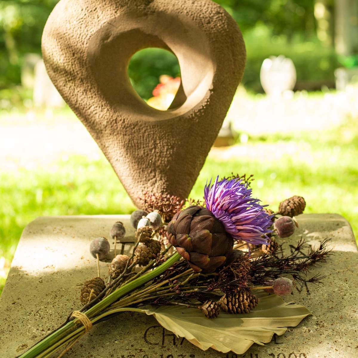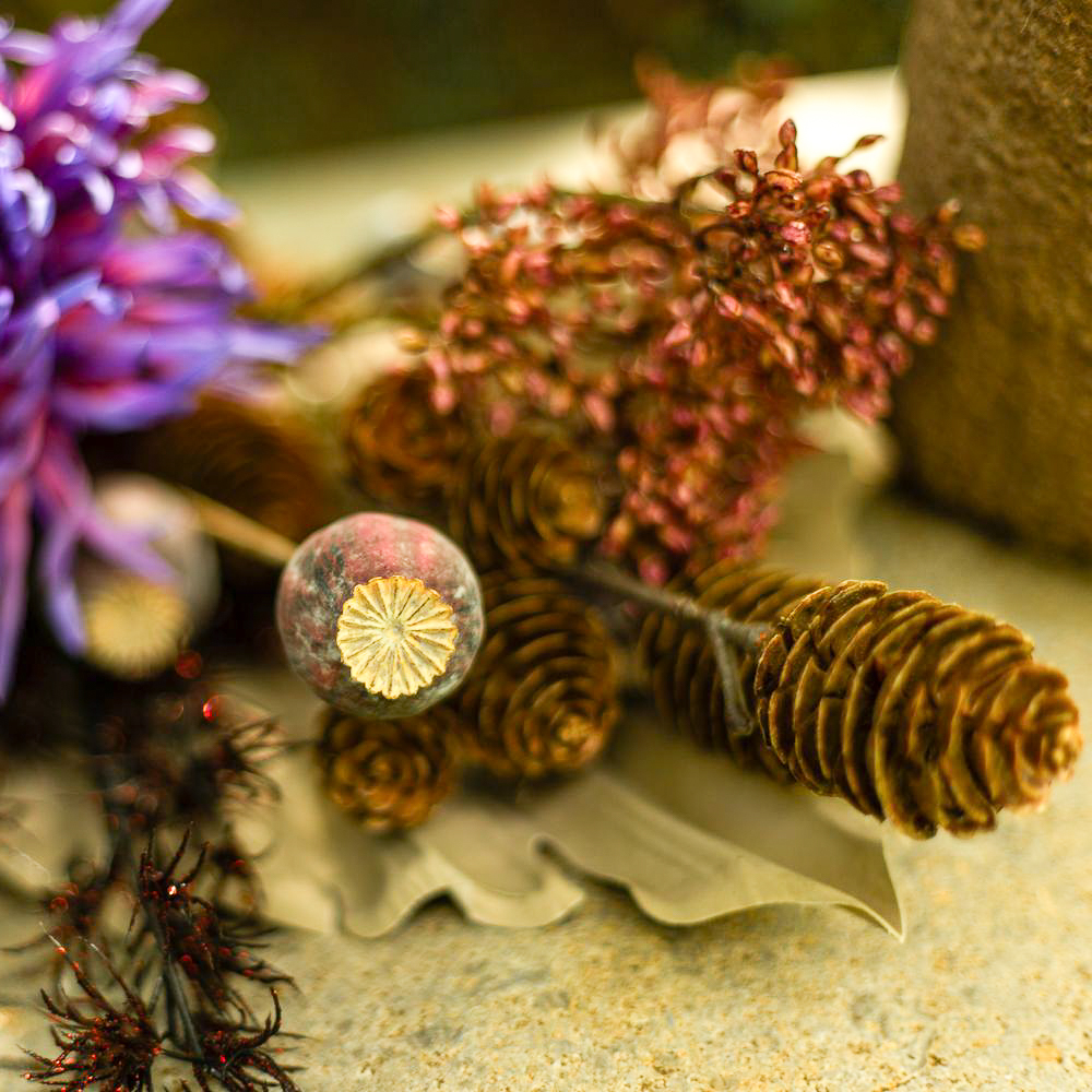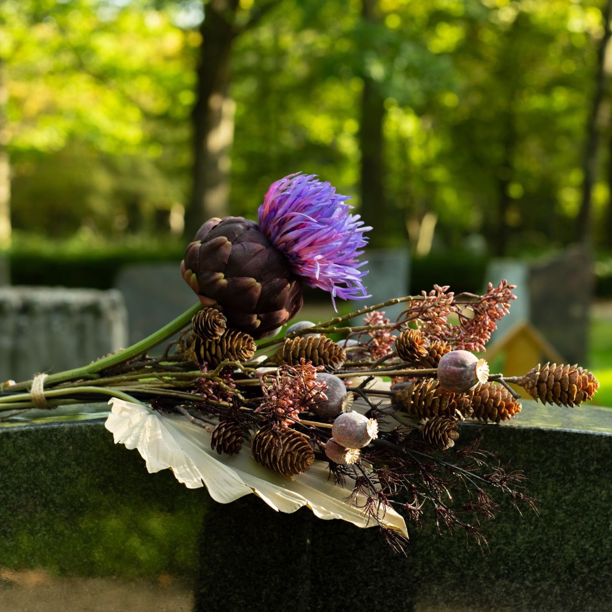 Les couleurs du deuil ! Lorsque l'on perd un être cher, la vie change de manière significative. Ce qui reste, c'est le souvenir. À la Toussaint, nous rendons hommage aux défunts et nous nous souvenons des moments merveilleux de leur vie. Les tombes sont entretenues et fleuries. Il est donc très pratique que les fleurs ne se fanent pas et embellissent durablement la tombe. Pas de flétrissement, pas d'arrosage - et un effet vraiment naturel. Le violet mystérieux de la fleur d'artichaut brille dans l'obscurité de l'atmosphère du cimetière et produit un effet à la fois moderne et intemporel devant le feuillage de palmier de couleur taupe. Shop the look!