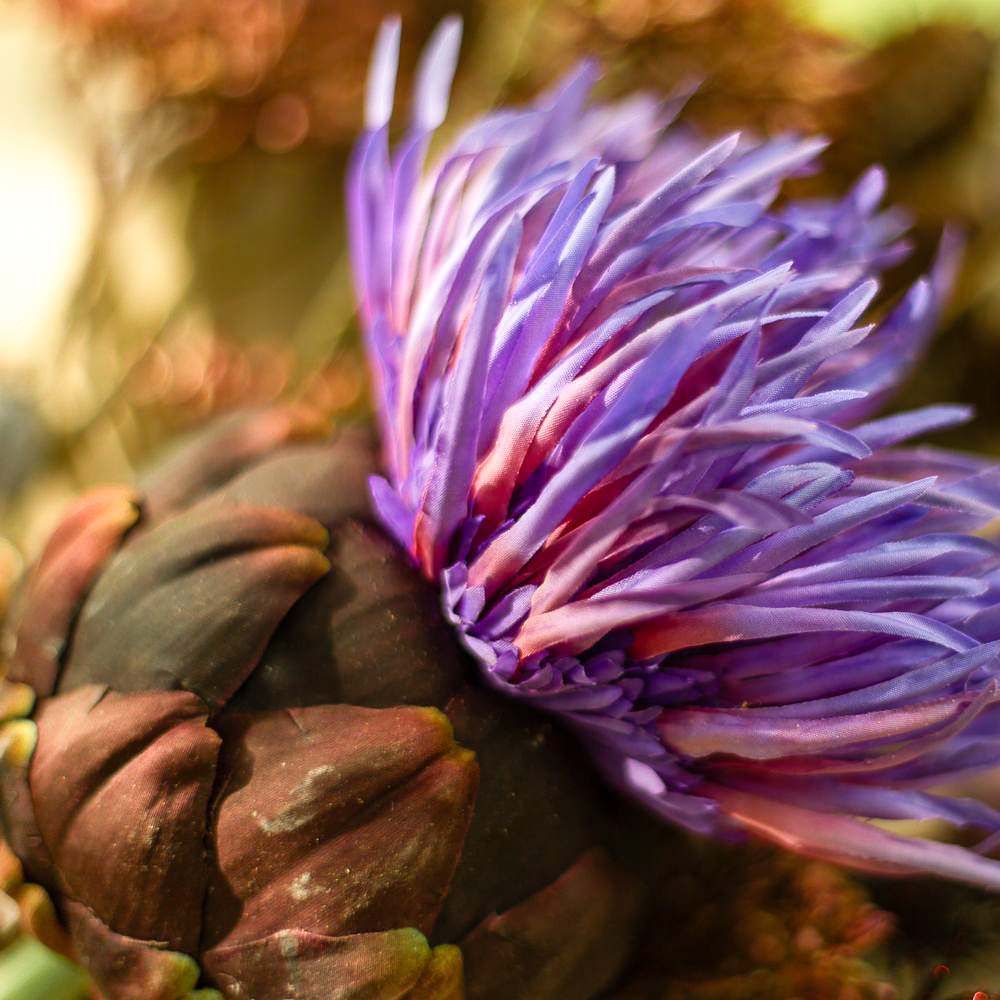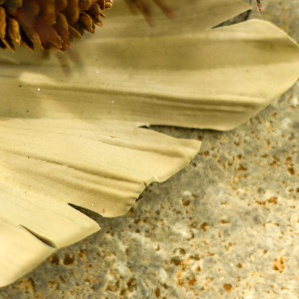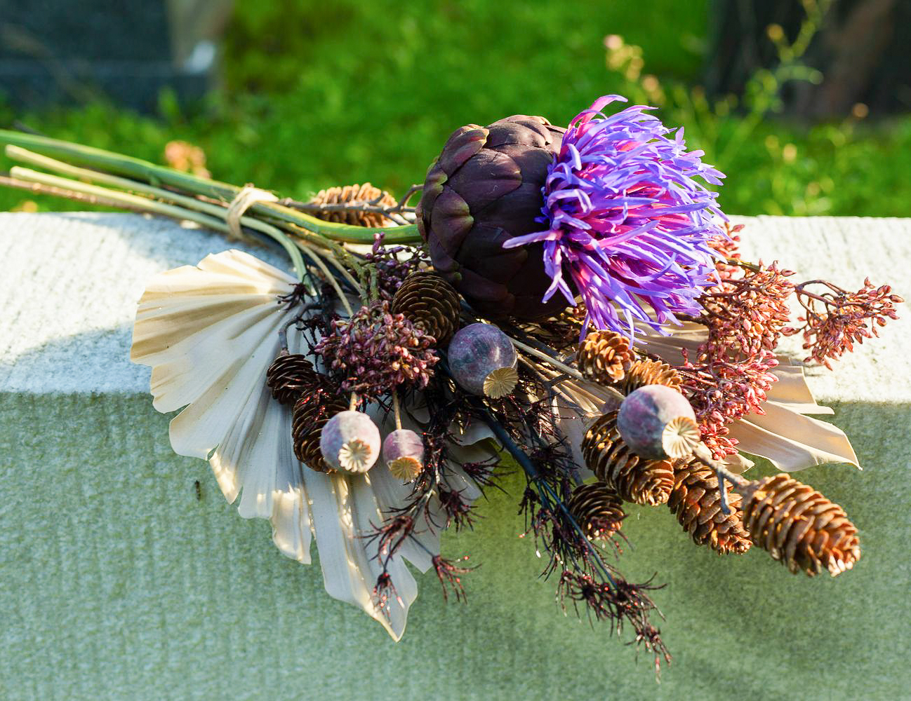 Conseil d'aménagement : Disposer la fleur primaire (la fleur d'artichaut) au premier plan et la feuille de palmier à l'arrière-plan. L'accessoire est placé entre les deux et doit encadrer discrètement la fleur d'artichaut.