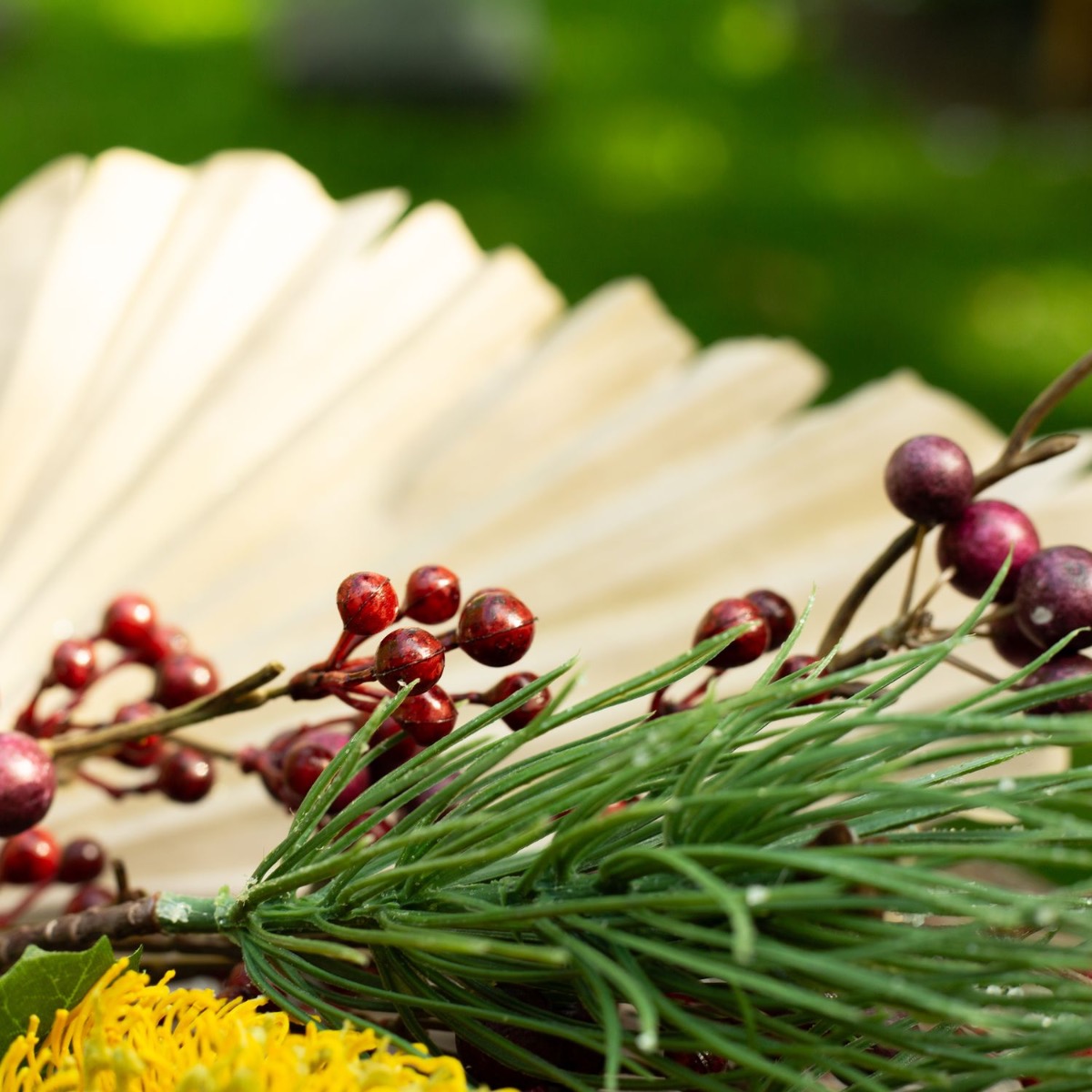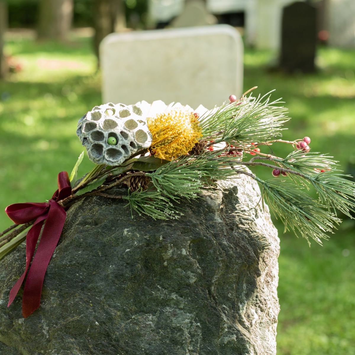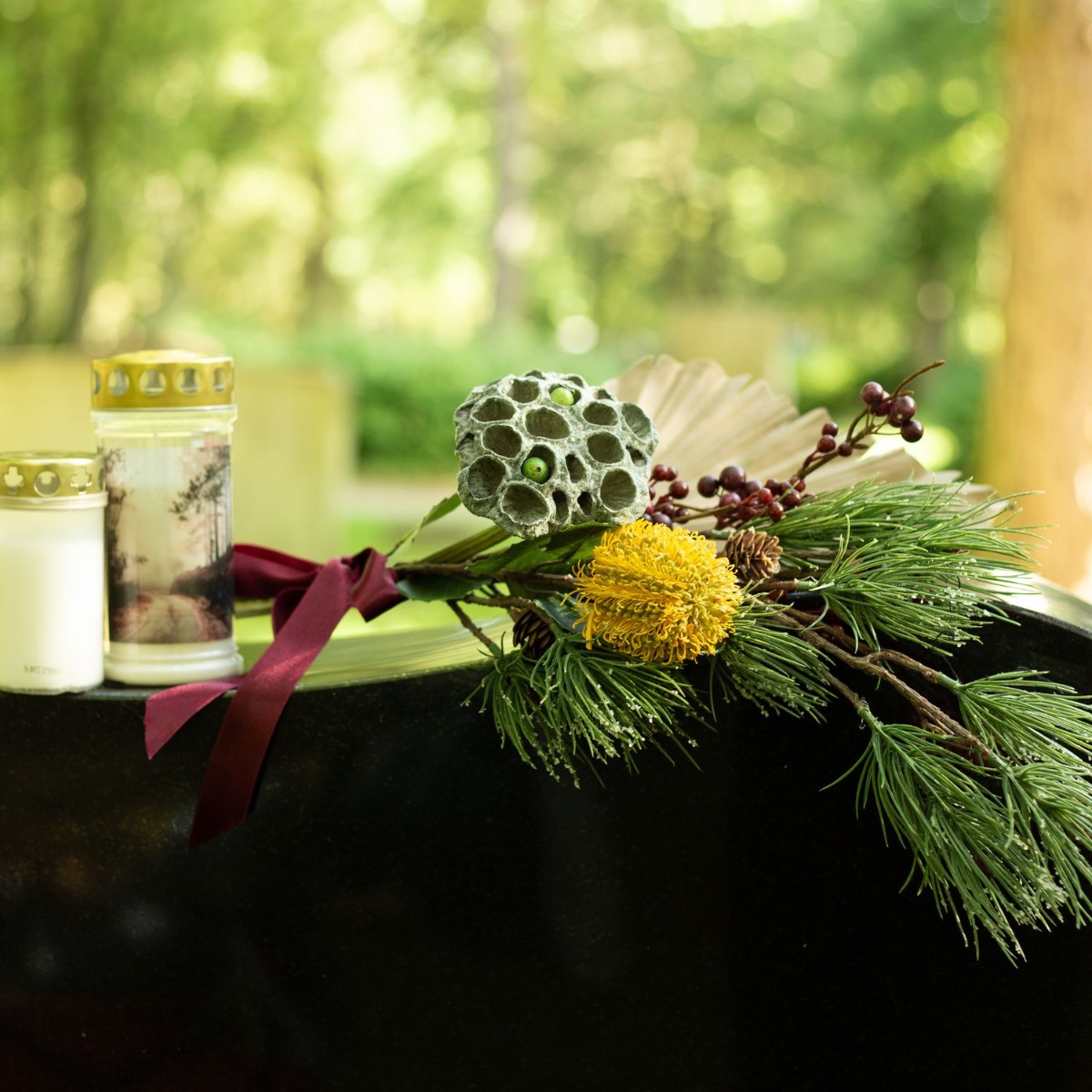 Conseil d'aménagement : Comme il n'y a qu'une seule branche par bouquet, il est relativement facile de l'attacher. Les fleurs sont disposées de manière bien visible dans la partie avant. Veillez à ce que les fleurs soient disposées à différentes hauteurs. Le fruit du lotus se trouve dans la partie avant, tout en bas, et la fleur jaune dans la partie centrale et la branche de symphorine complète l'ensemble. Le bouquet n'a qu'un seul côté visible et peut donc être facilement posé sur une tombe. Un vase funéraire en pierre n'est pas forcément nécessaire. Un ruban de satin donne au bouquet un aspect encore plus noble.