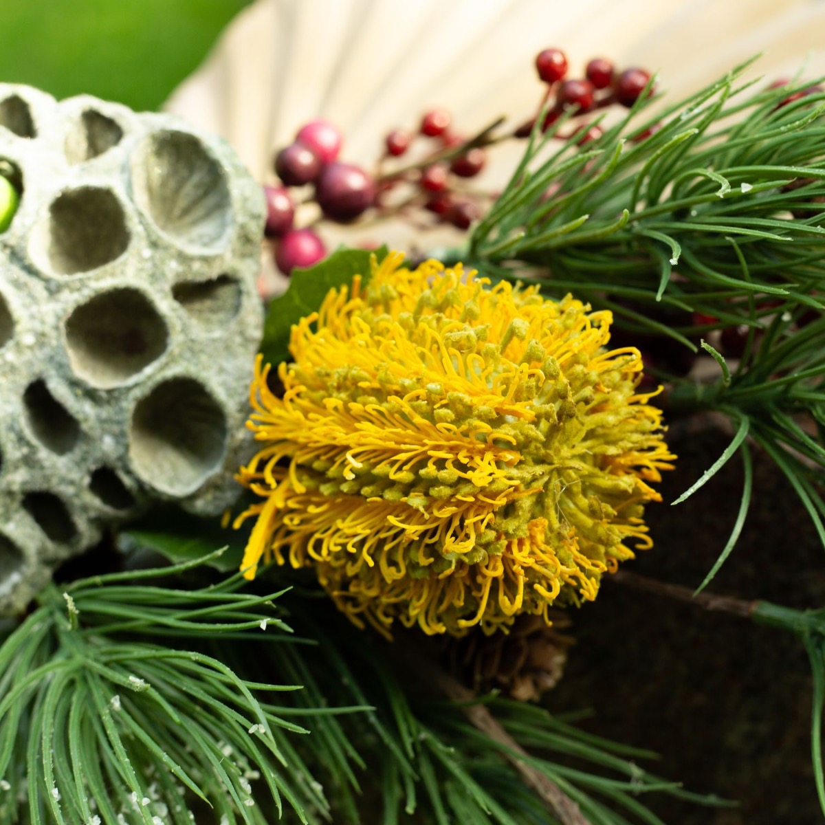 Les couleurs du deuil ! Lorsque l'on perd un être cher, la vie change de manière significative. Ce qui reste, c'est le souvenir. À la Toussaint, nous rendons hommage aux défunts et nous nous souvenons des moments merveilleux de leur vie. Les tombes sont entretenues et fleuries. Il est donc très pratique que les fleurs ne se fanent pas et embellissent durablement la tombe. Pas de flétrissement, pas d'arrosage - et un effet vraiment naturel. La fleur jaune de Banksia brille merveilleusement dans ce petit bouquet et donne à ce bouquet d'automne un aspect exceptionnel. La branche de sapin, de symphorine et le fruit du lotus sont encadrés par la feuille de palmier de couleur taupe et créent un aspect unique. Shop the look!