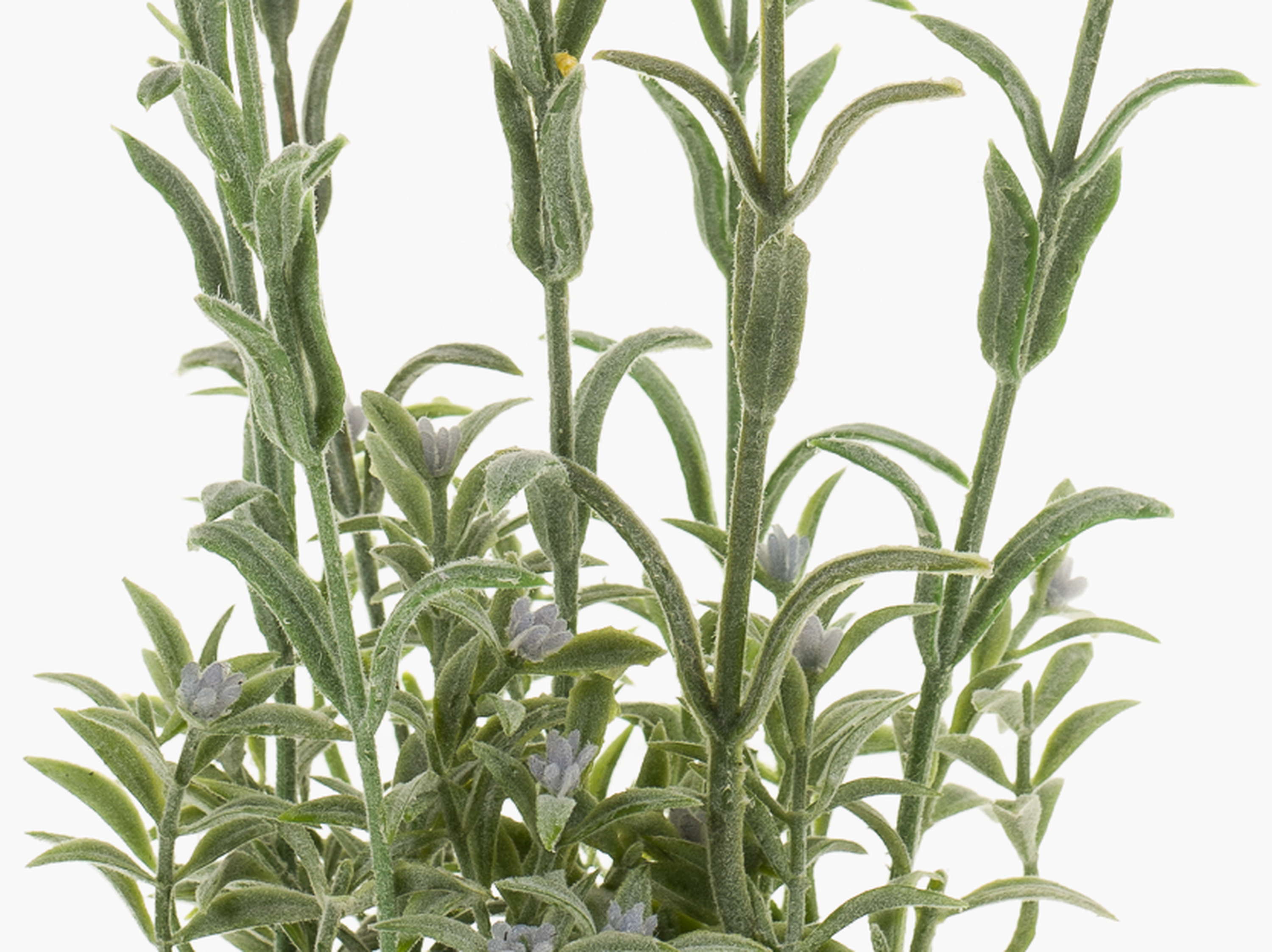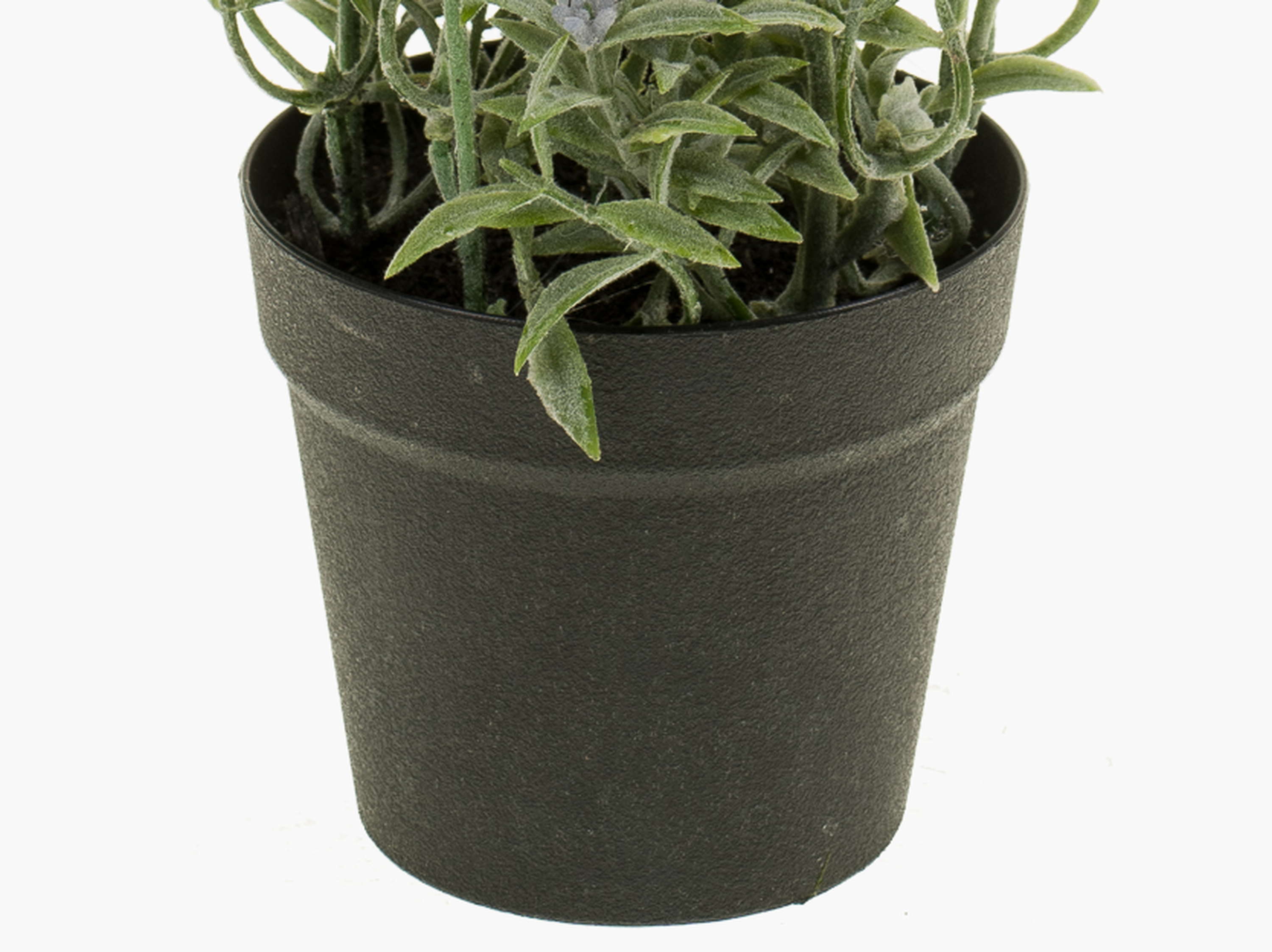 Fausse Lavande en pot en matière plastique de couleur noire rempli de terre décorative noire. La plante décorative en pot a une hauteur totale d’env. 29 cm.