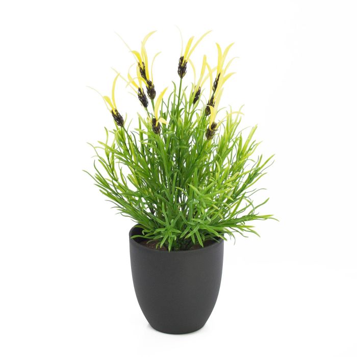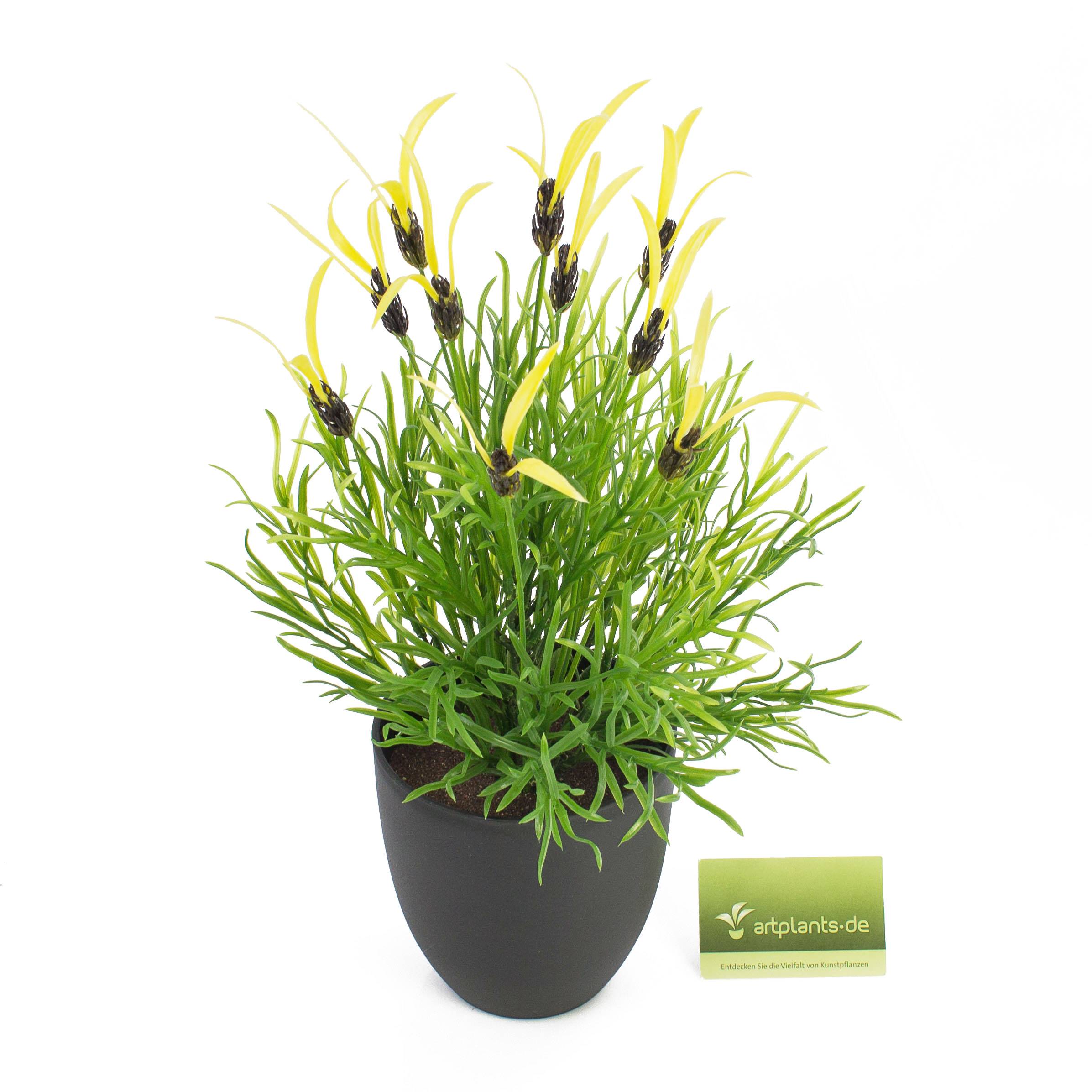 Lavande papillon artificielle dans une belle coupe décorative. Cette lavande est ornèe de nombreuses fleurs jaunes et mesure au total environ 40 cm de haut.