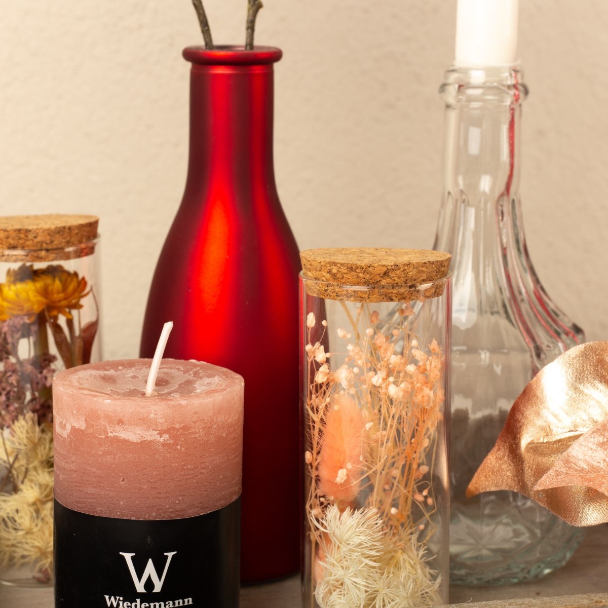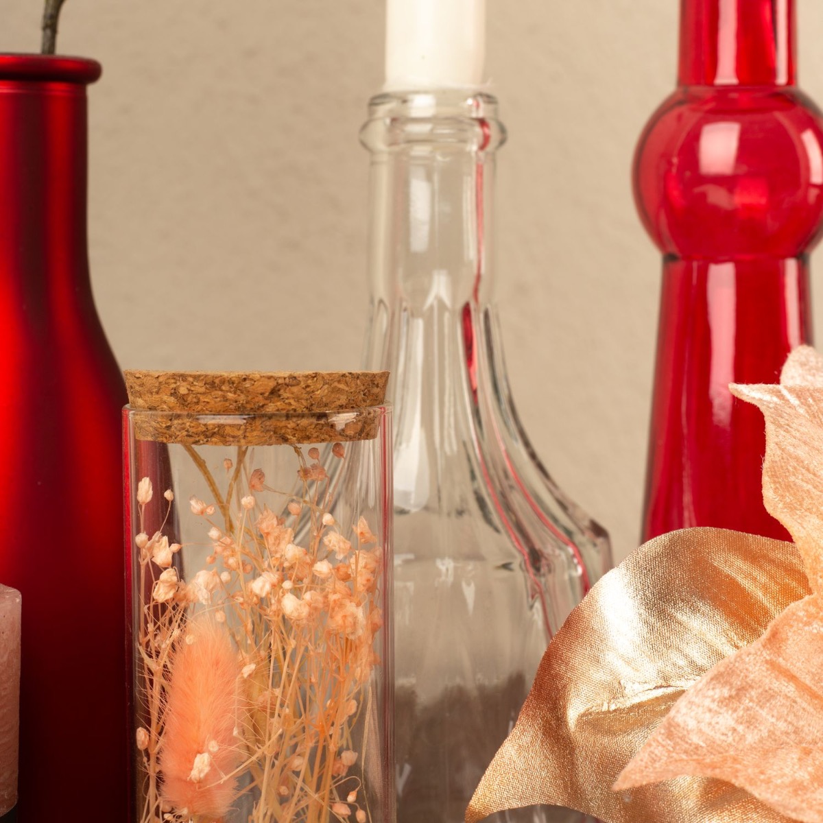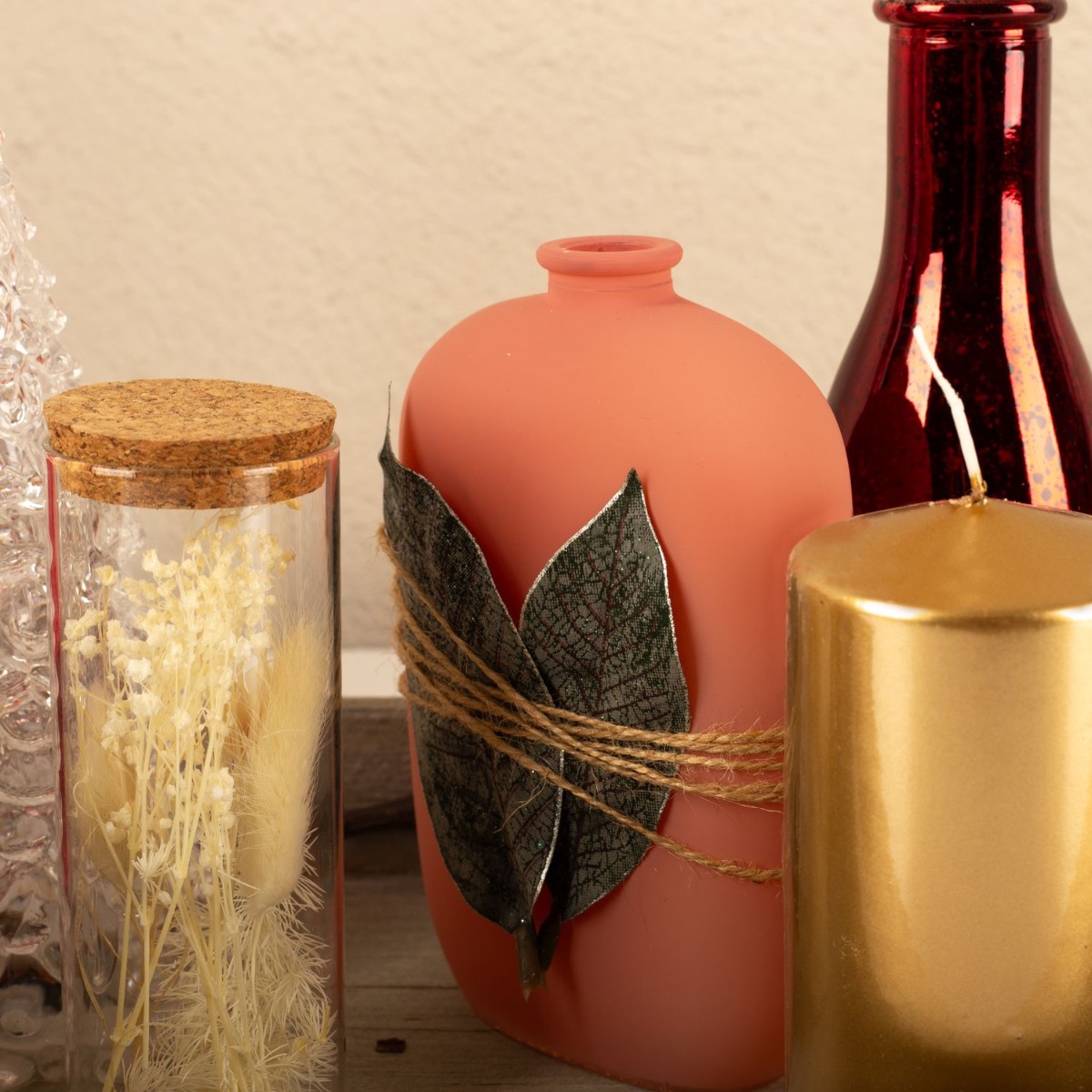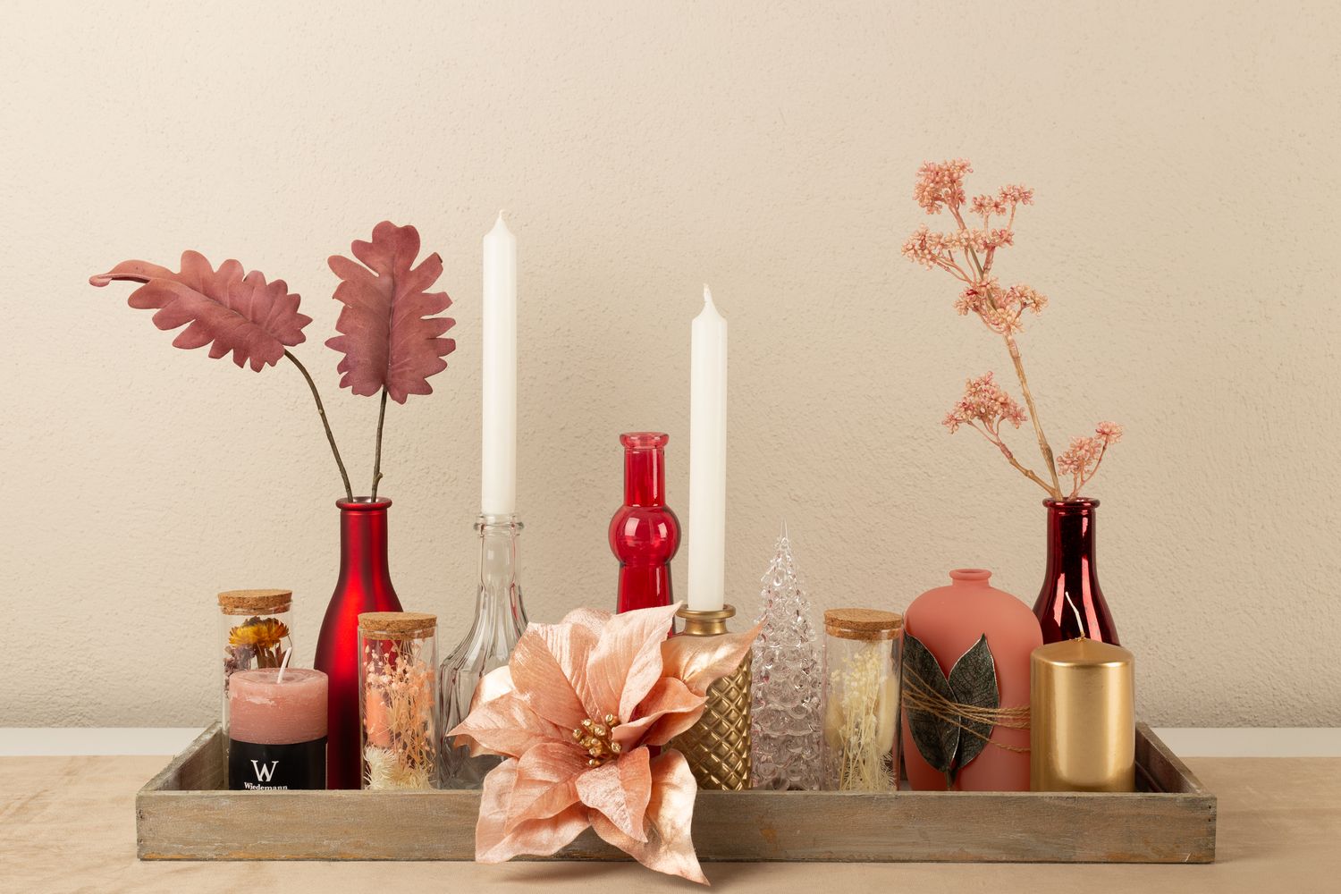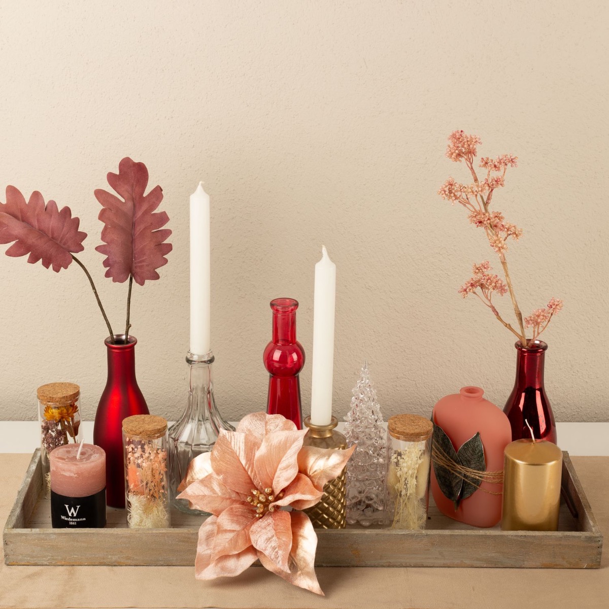 Conseil d'aménagement : Répartir les différents éléments, comme les bouteilles et les bougies, sur le plateau en veillant à ce que les bougies aient des hauteurs différentes. Plier les branches et, si nécessaire, les raccourcir à la taille du vase. Le poinsettia doit être placé au premier plan. La bouteille rose a été entourée de deux feuilles et d'une ficelle de paquets.