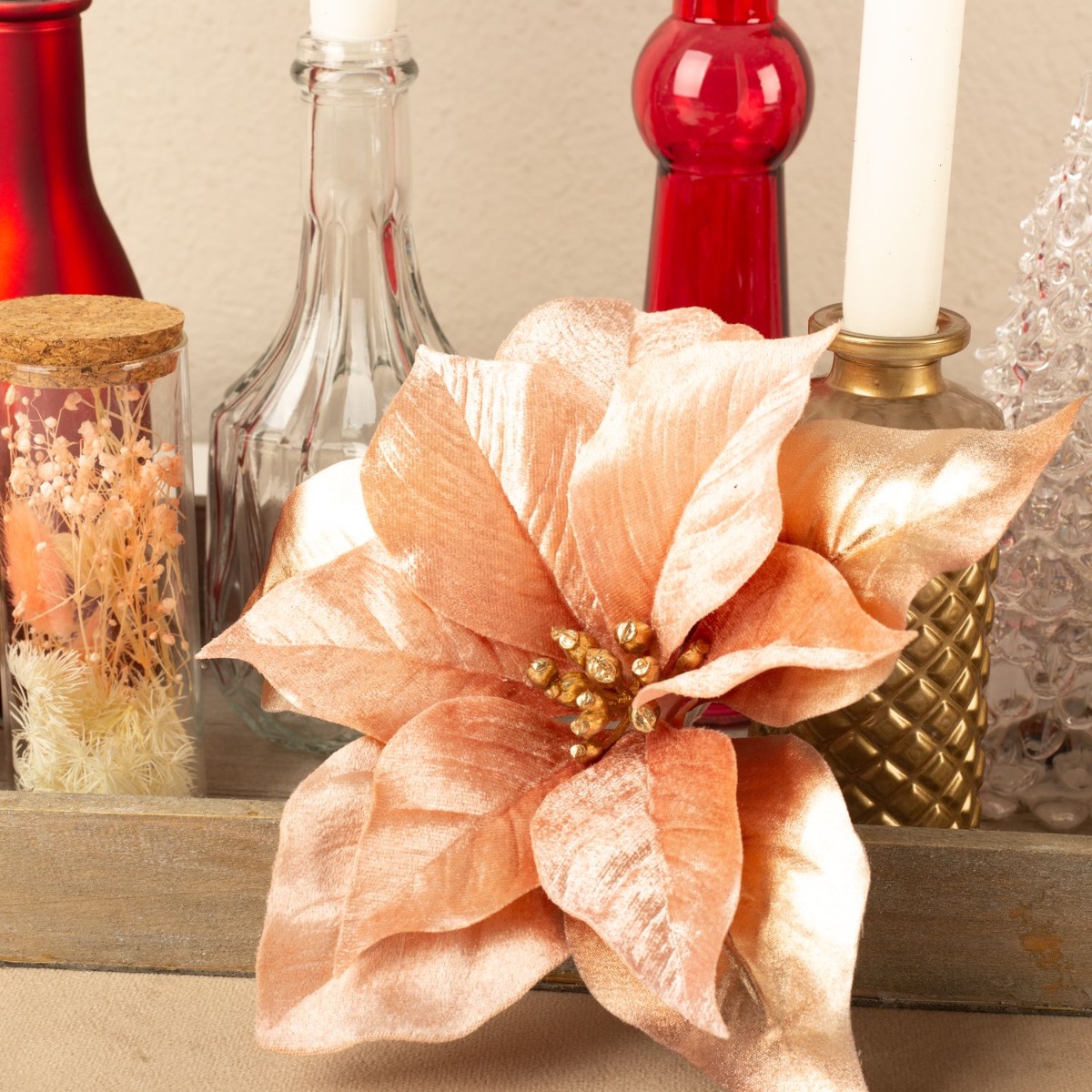 Le rose et l'or ! Ce look de l'Avent est une toute nouvelle approche de la période de l'Avent. Les seules choses qui rappellent une couronne de l'Avent classique sont les quatre bougies qui sont allumées chaque dimanche de l'Avent et le poinsettia velouté que l'on voit partout pendant la période de Noël. Les nombreuses petites bouteilles peuvent être remplies de différentes branches. Nous avons opté pour des éléments atypiques, comme la feuille de philodendron vieux rose ou le callicarpe rose. En effet, ce look est toujours transformable et peut continuer à être conçu pendant la période de l'Avent. Ainsi, dans certaines bouteilles, il y a encore de la place pour élargir la décoration. Shop the look!