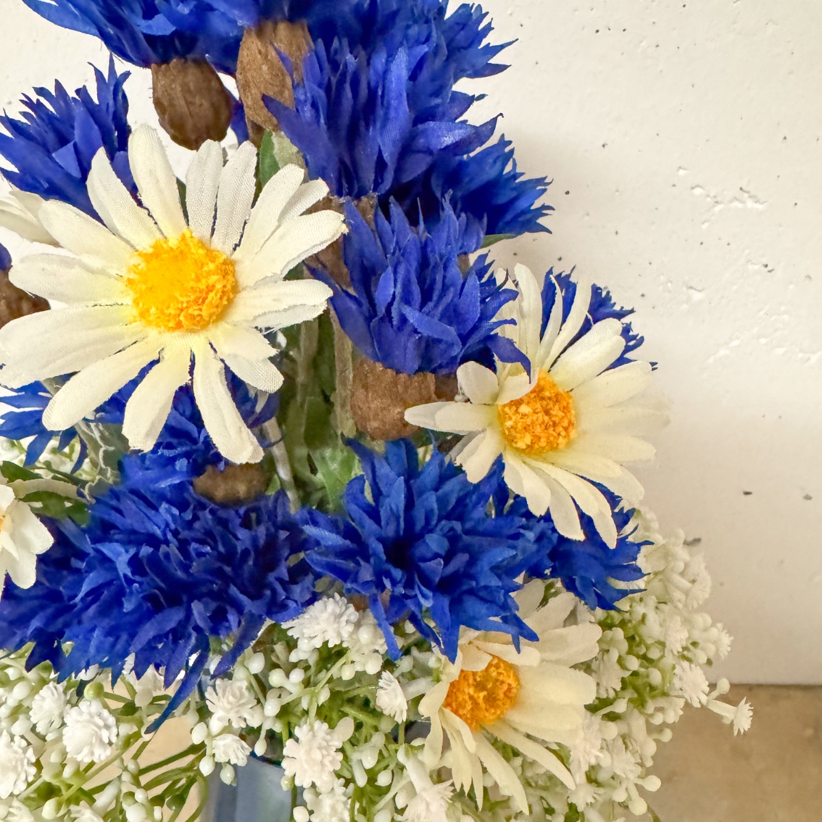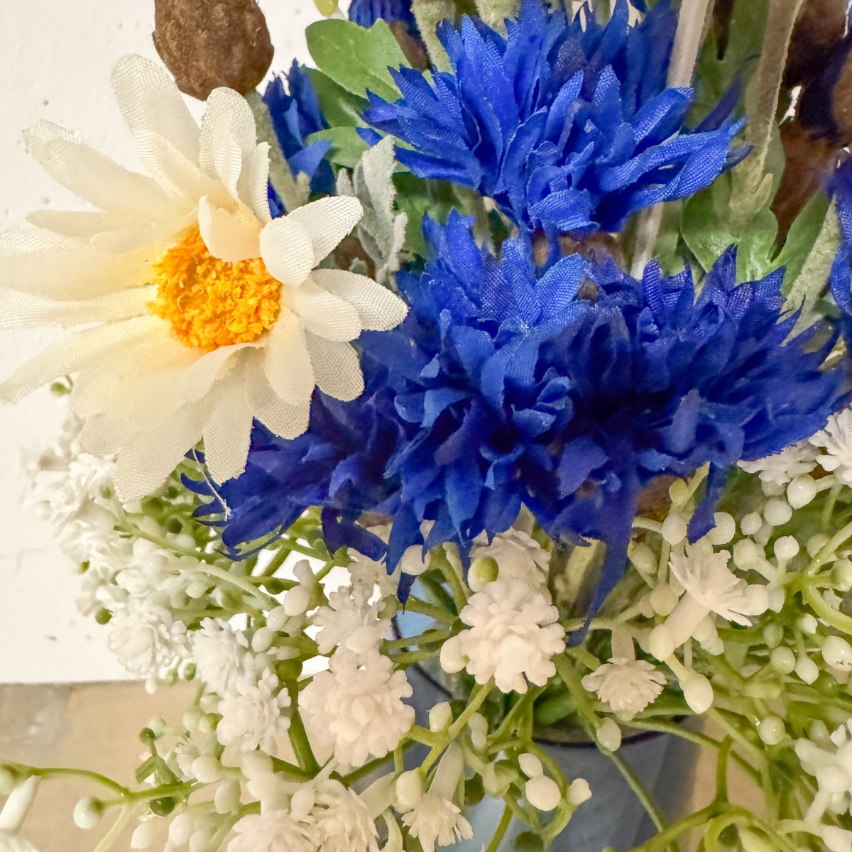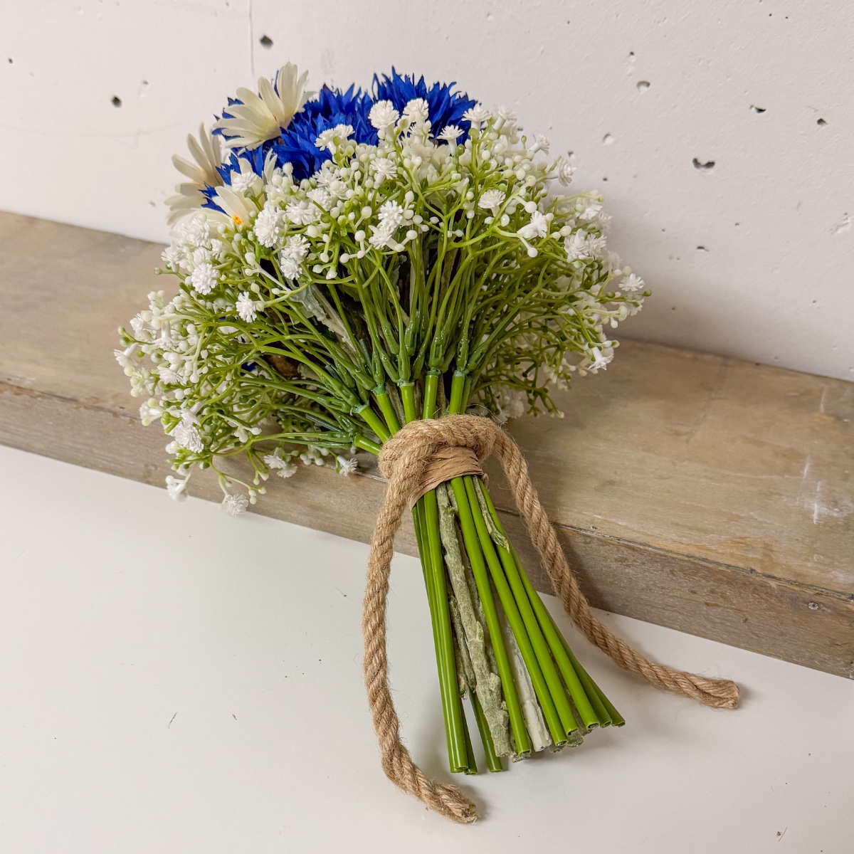 Bridal Love ! Voici à quoi ressemble un bouquet bavarois. Pour créer la surprise, nous avons été chargés de reproduire le bouquet de la mariée, malheureusement fané depuis, à partir de fleurs artificielles. Des bleuets d'un bleu éclatant, des marguerites délicates et de la gypsophile ornent ce bouquet de mariée en forme de pyramide et apportent une touche de romantisme à la fête. La gypsophile symbolise ici l'amour sincère. Les marguerites représentent la fidélité et les bleuets évoquent un avenir positif. Une cordelette en jute marron souligne le style champêtre. Shop the Look !