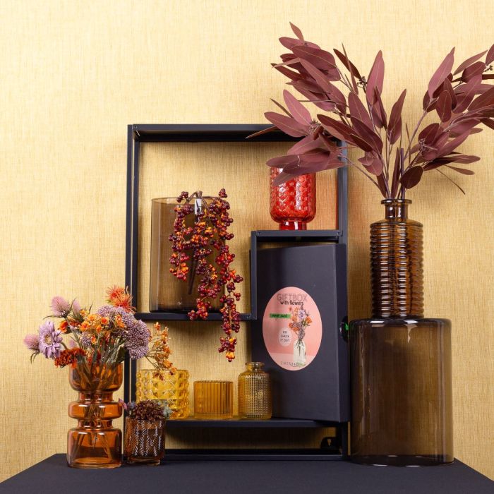 Le rouge, le brun et le jaune ! La fin de l'été est arrivée et les dernières fleurs ont fleuri. Il est temps de rafraîchir la déco ! Un adorable petit bouquet DIY d'Emerald orne le vase brun-orange. Dans notre grand choix de bouteilles et de verres colorés, nous avons pu facilement composer de jolis tons automnaux. Un jaune éclatant, un orange chaud, un rouge vif et un brun profond. Ce sont les couleurs de l'automne. Shop the look!