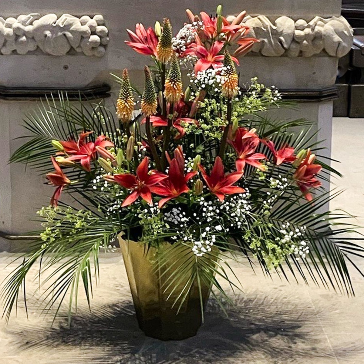 Des fleurs pour l'âme - Church Flowers ! Une composition florale luxuriante devant l'autel, arrangée avec art avec des lys symbolisant la renaissance et des lys torches représentant le courage et la force. Complétée par des feuilles de palmier et de la gypsophile blanche délicate, elle crée un ensemble harmonieux. Les fleurs de l'autel rappellent la beauté et la richesse de la création divine – un symbole floral d'espoir, de foi et d'unité. Shop the Look !