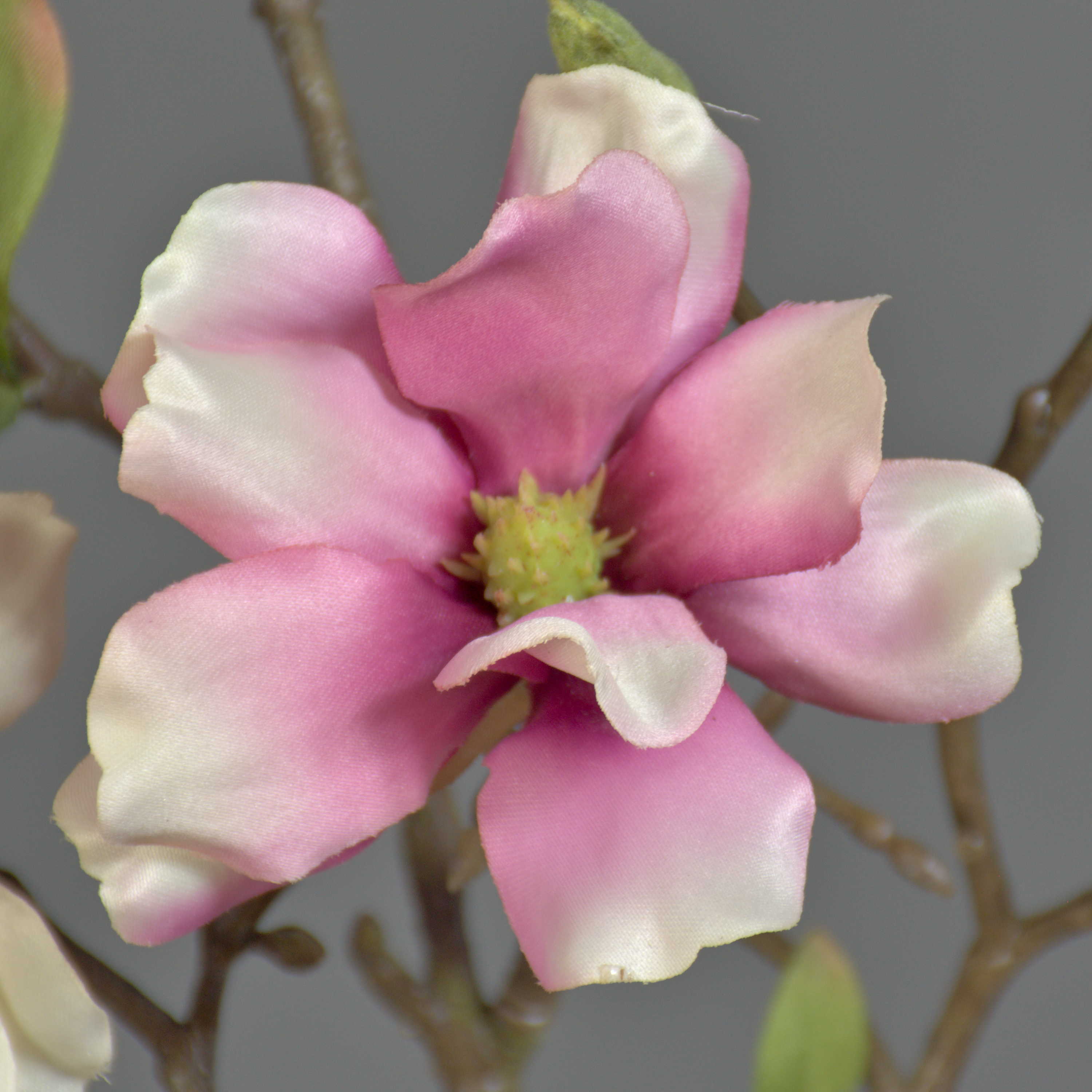 Branche de magnolia artificielle MARGA rose ornée de 4 fleurs et de nombreux boutons. Cette jolie branche fleurie mesure au total environ 80 cm de long.