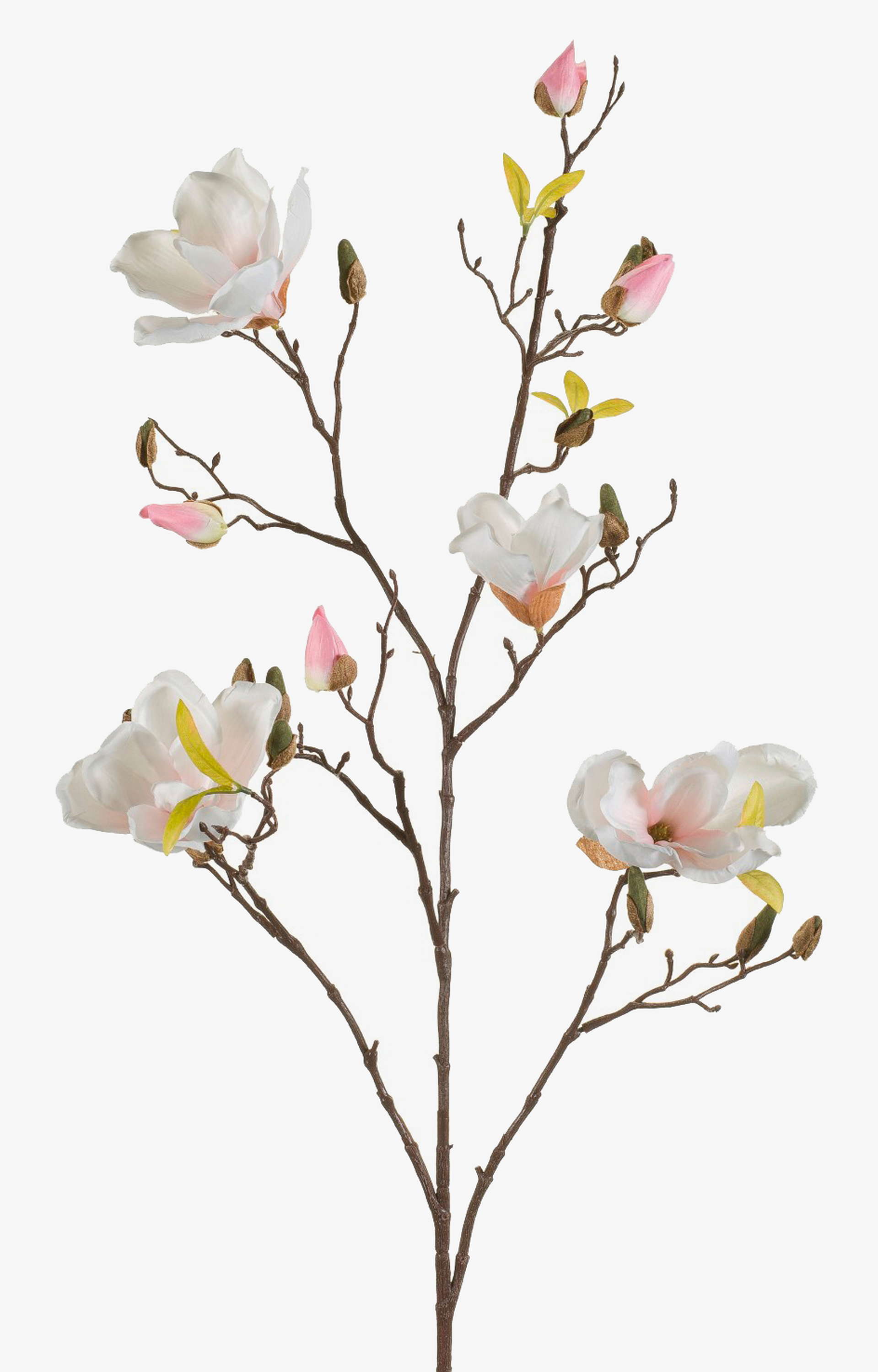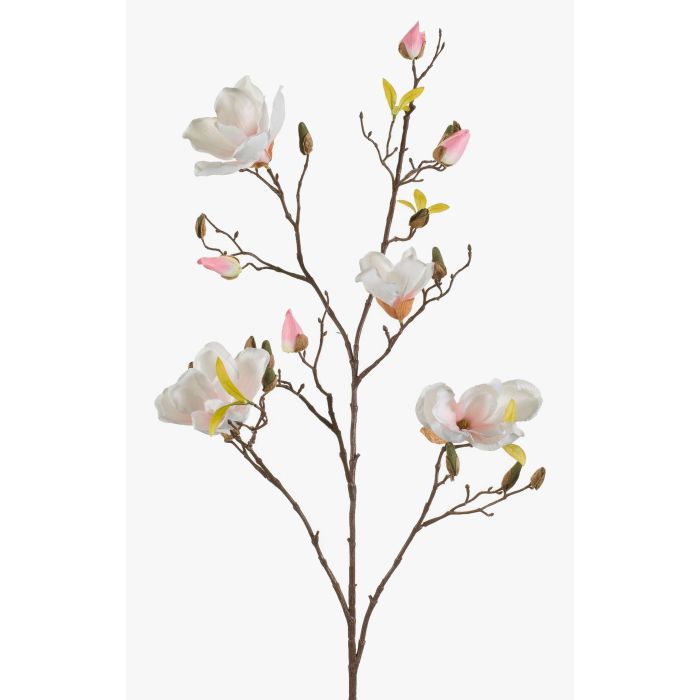 Tige de magnolia LILO ornée de 4 fleurs blanc-rose, quelques feuilles vertes et quelques boutons mesurant au total environ 110 cm de long. Cette branche décorative sera par exemple la décoration parfaite pour les occasions festives telles que les mariages, les fêtes d'entreprise, les communions et les baptêmes.