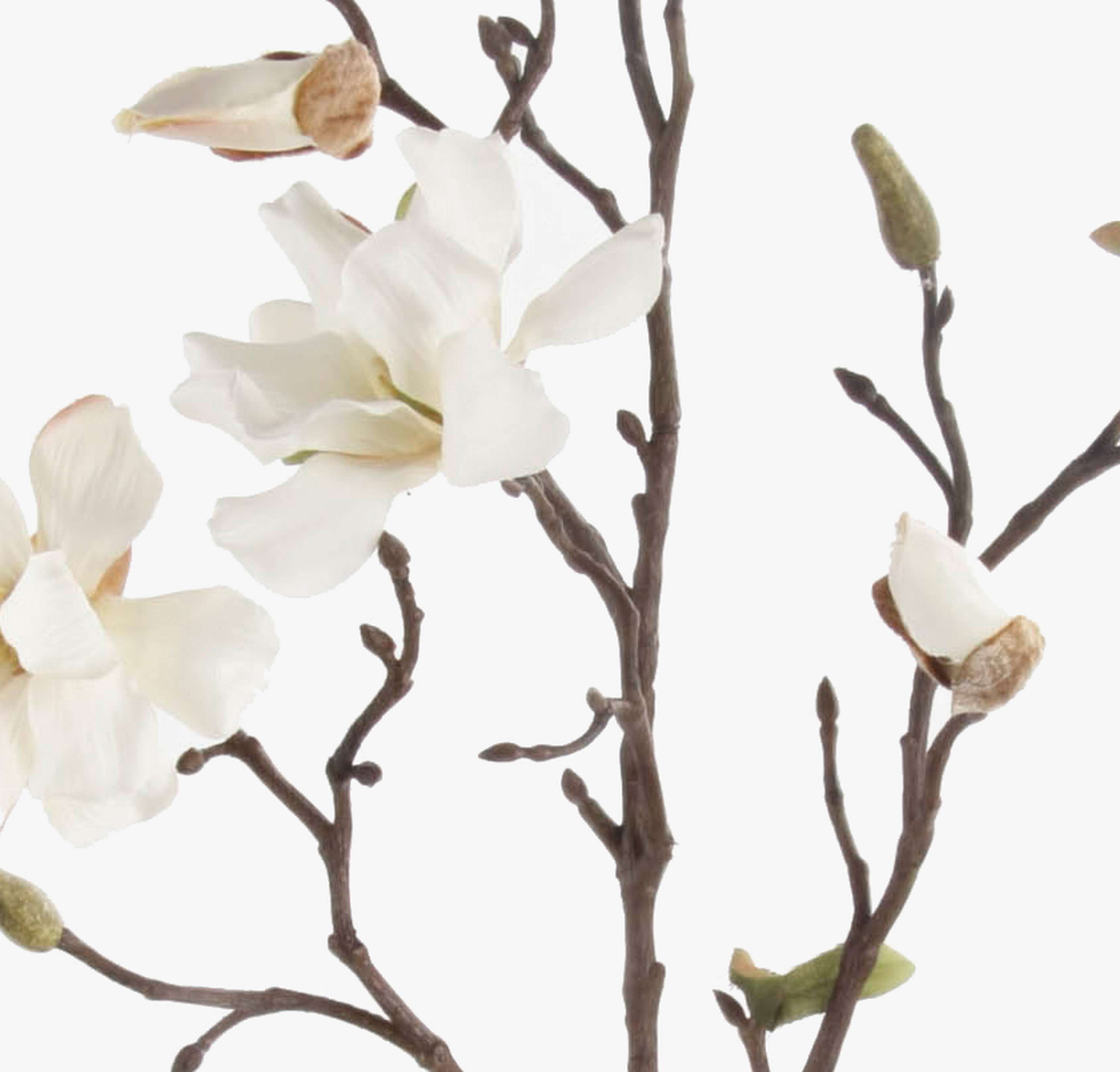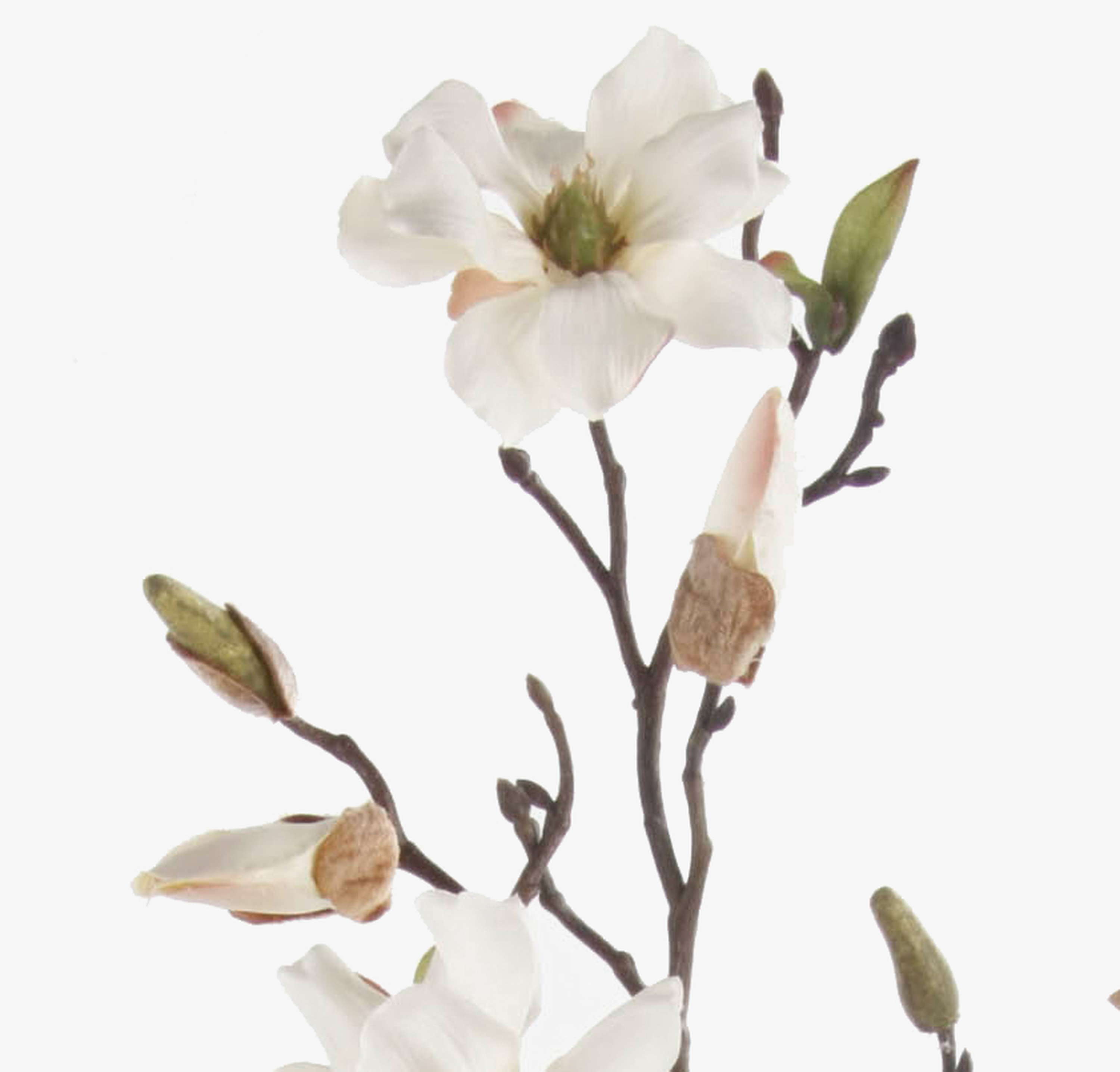 Tige de magnolia artificielle LILO ornée de 4 fleurs blanches, quelques feuilles vertes et quelques boutons mesurant au total environ 75 cm de long.