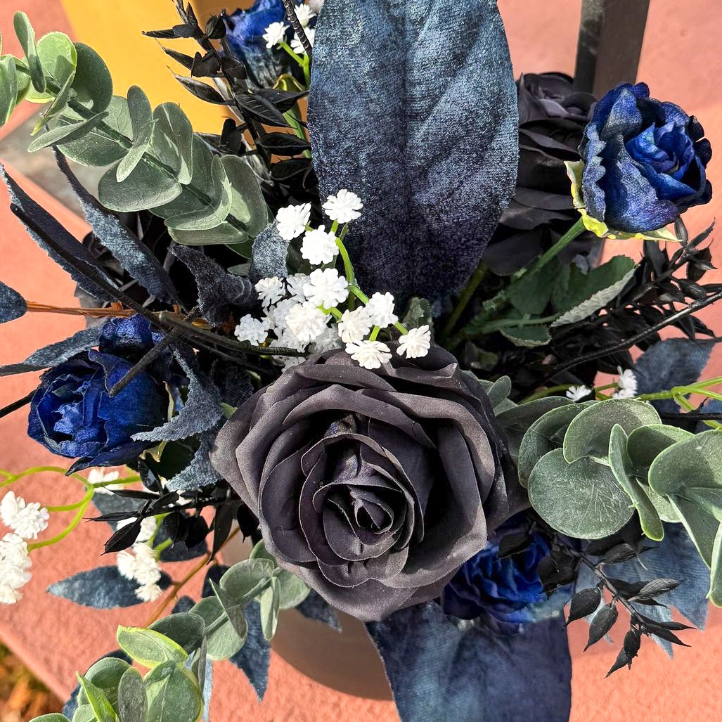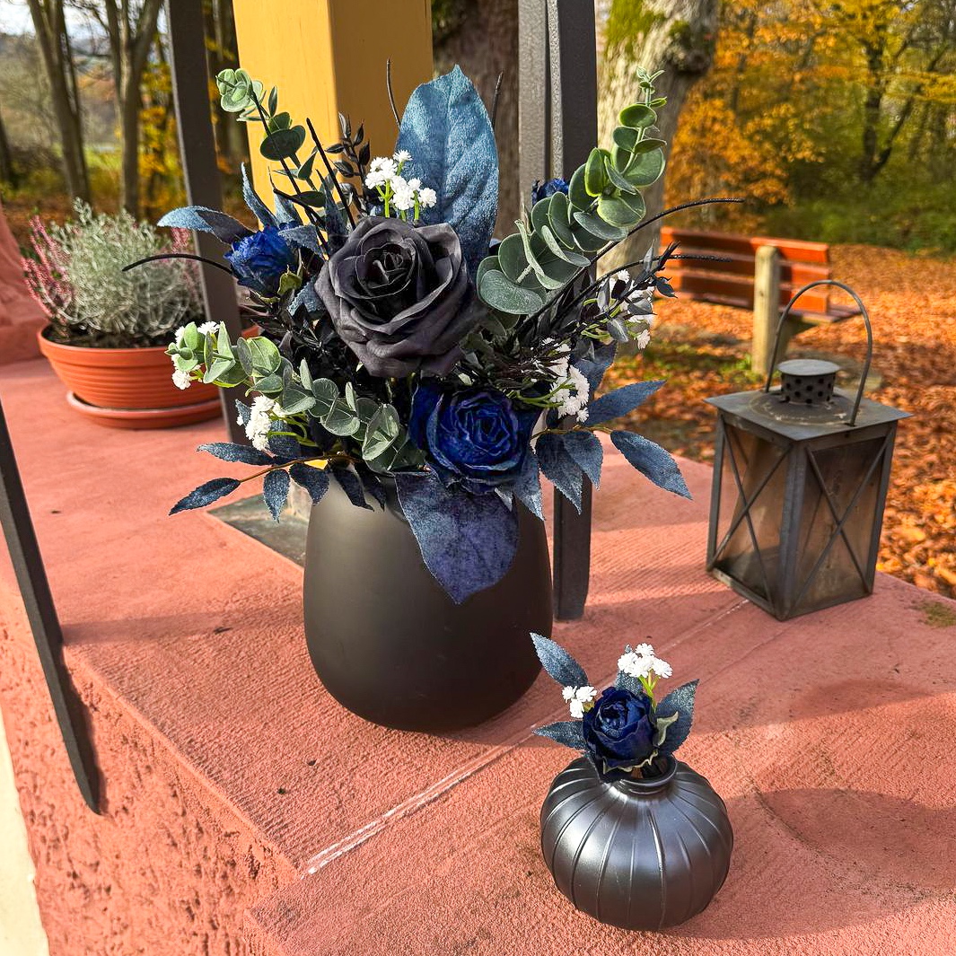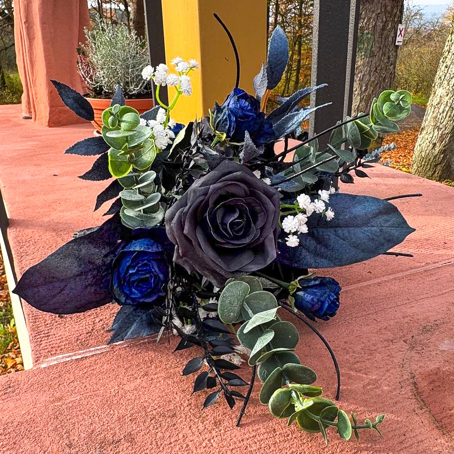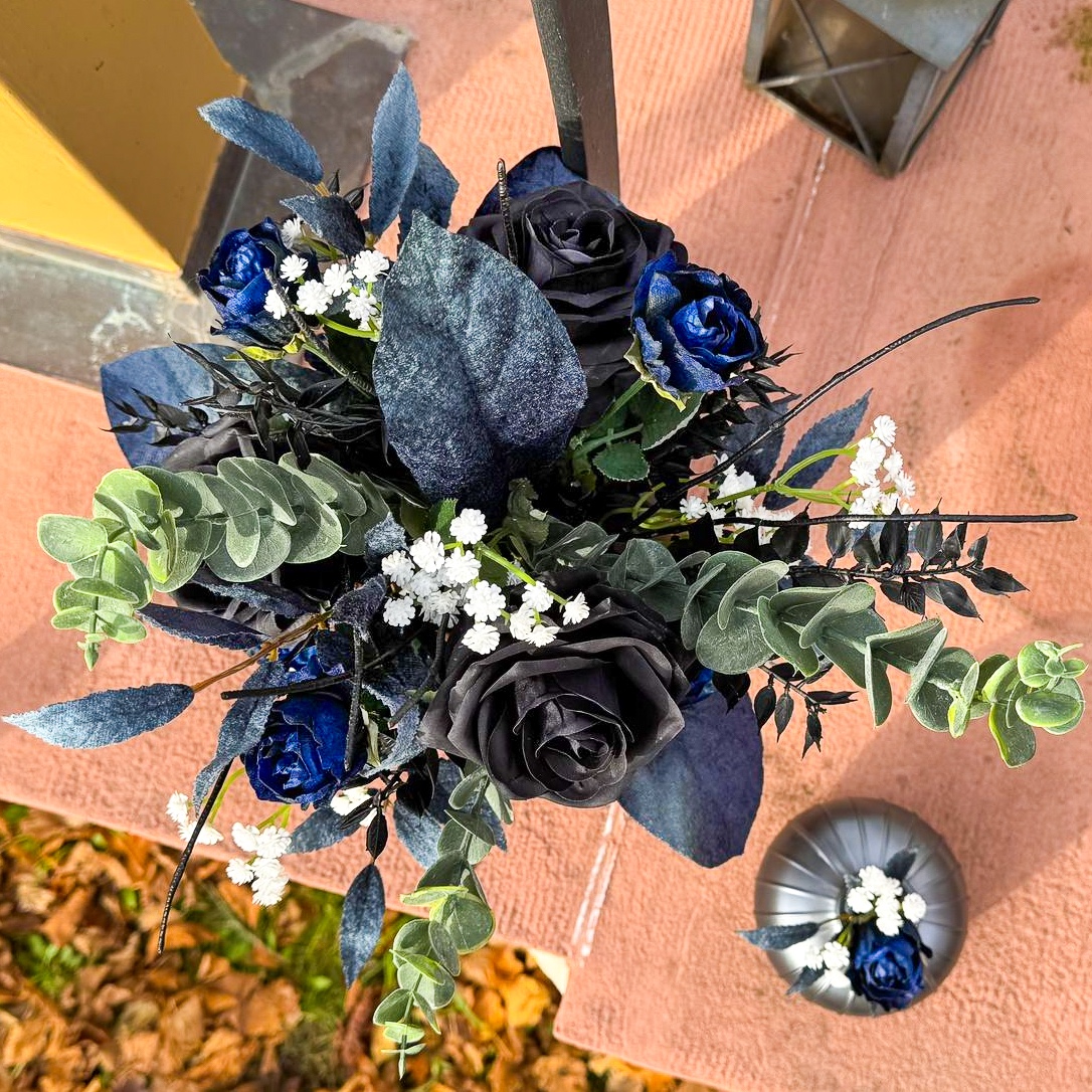 Quand l'art floral rencontre l'élégance intemporelle ! Nous avons eu le privilège de créer l'ensemble des compositions florales pour un mariage de rêve dans le sud de la France, sur une presqu'île idyllique. La cérémonie s'est déroulée à la mi-novembre, une période où l'élégance et la profondeur des couleurs sont particulièrement mises en valeur. La cliente souhaitait un concept moderne et raffiné dans les tons noir et bleu foncé, rehaussé de fines touches de blanc pour un mariage classique. Tous les éléments bleu foncé ont été dotés d'une surface veloutée qui dégage une impression de noblesse et de chaleur, particulièrement appréciable pendant la saison froide. Le bouquet de la mariée et la boutonnière assortie pour le marié constituent le cœur de l'ensemble du concept floral, harmonieusement coordonnés et déterminants pour le style de tous les autres arrangements. Vous souhaitez également célébrer votre mariage avec des fleurs artificielles ? Shop the Look !