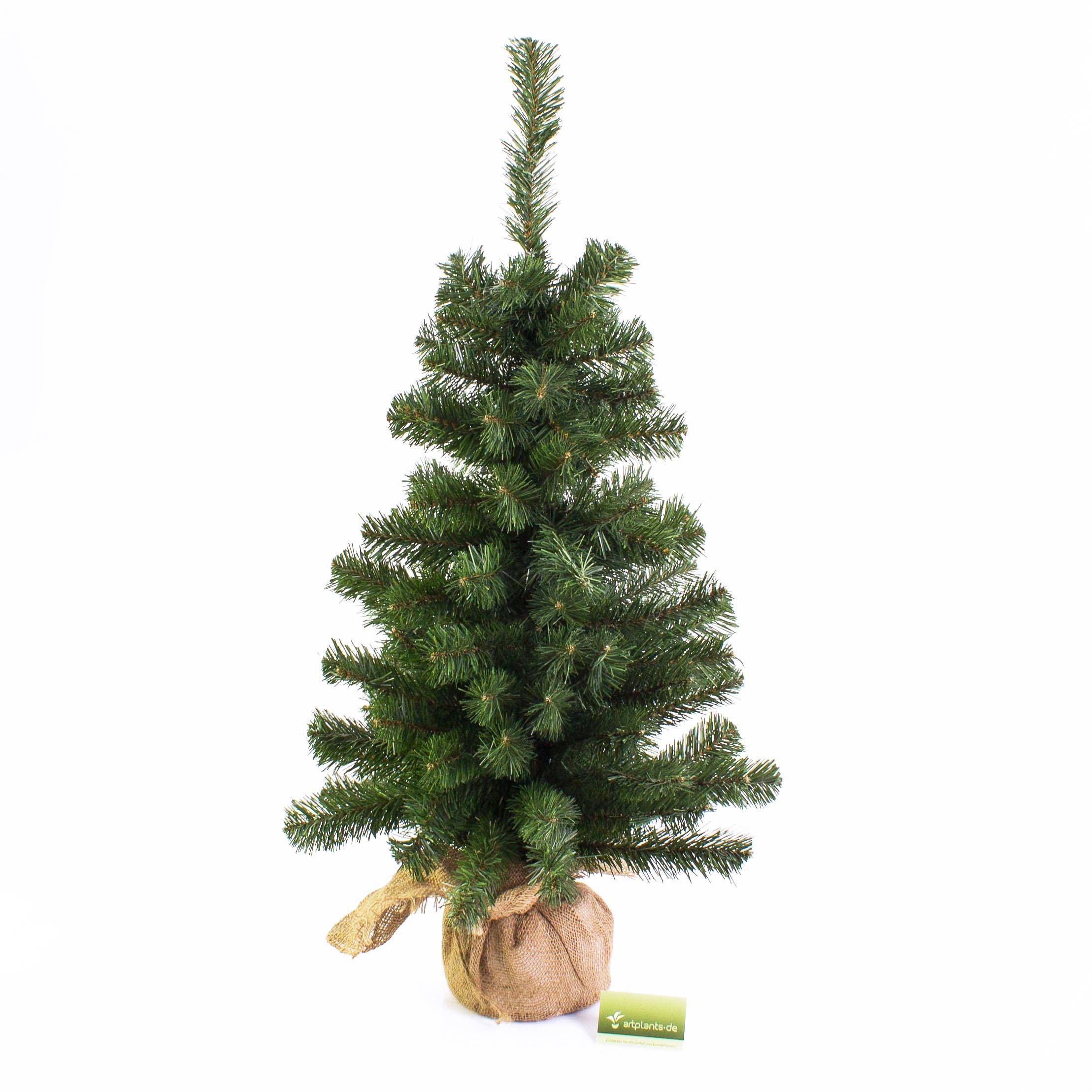Mini faux sapin VARSOVIE de la nouvelle collection artplants mesurant environ 90 cm de haut et 50 cm de diamètre. Le petit arbre est livré dans son petit sac en toile de jute. Les branches déjà fixées sur le tronc permettent une installation simple et très rapide du sapin.
