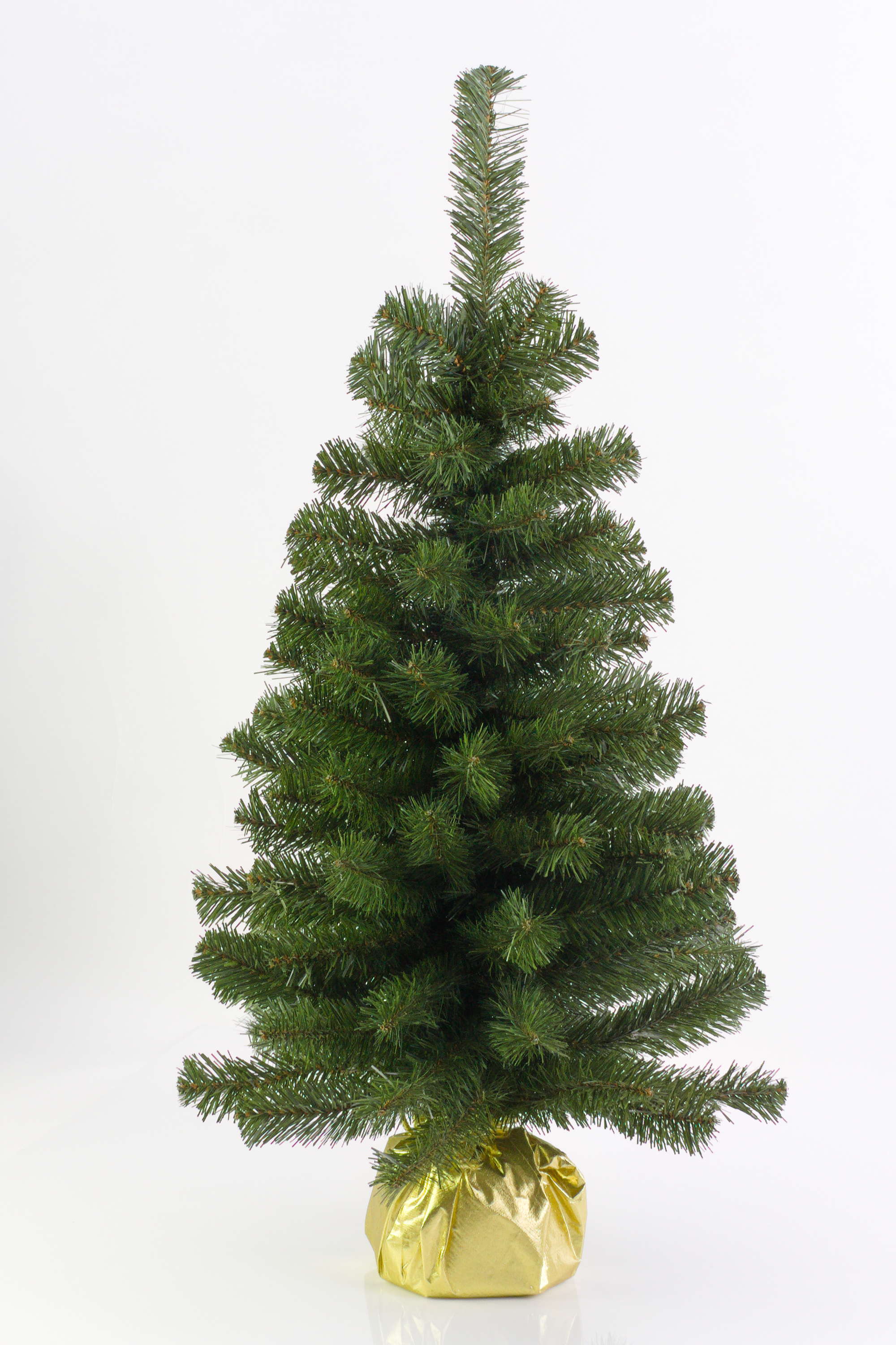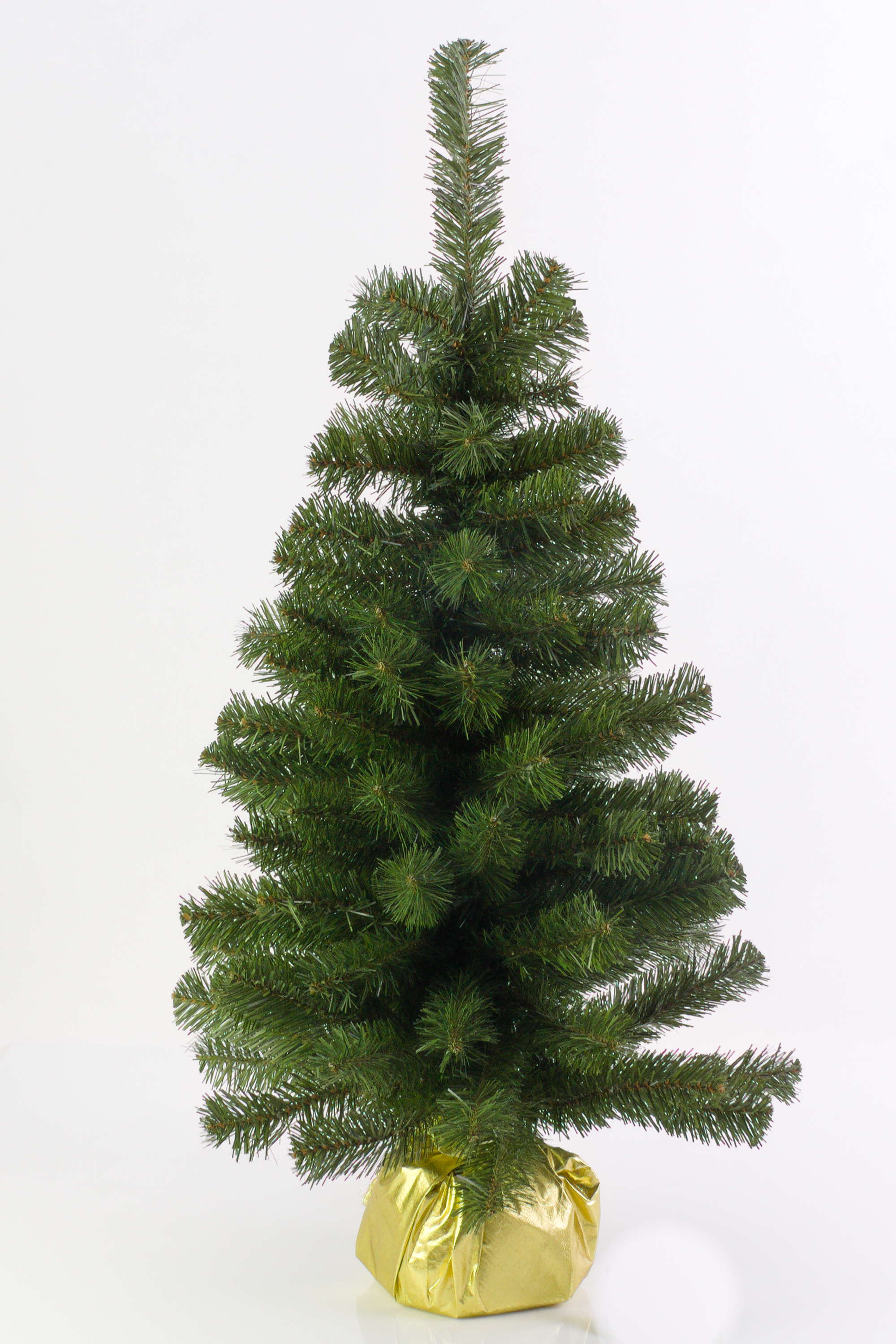 Mini faux sapin VARSOVIE de la nouvelle collection artplants mesurant environ 90 cm de haut et 50 cm de diamètre. Le petit arbre est livré dans son sac en tissu doré. Les branches déjà fixées sur le tronc permettent une installation simple et très rapide du sapin.