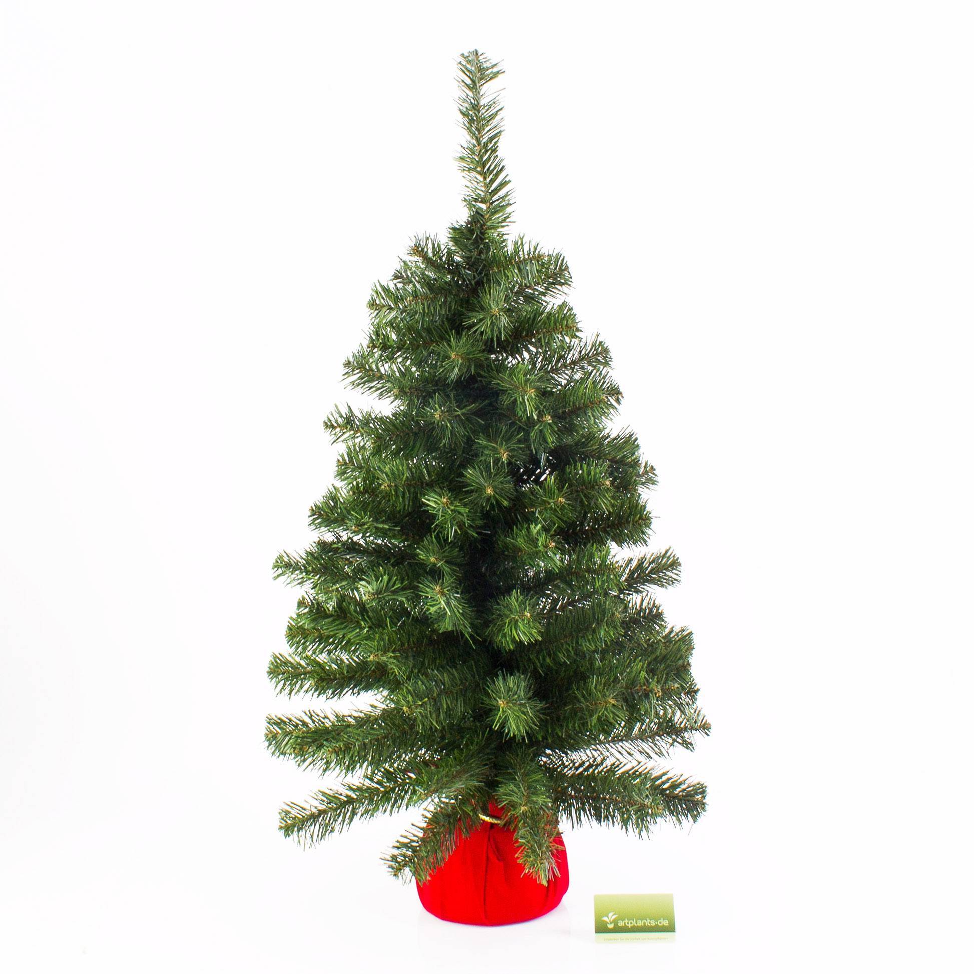 Mini faux sapin VARSOVIE de la nouvelle collection artplants mesurant environ 90 cm de haut et 50 cm de diamètre. Le petit arbre est livré dans son sac en tissu rouge. Les branches déjà fixées sur le tronc permettent une installation simple et très rapide du sapin.