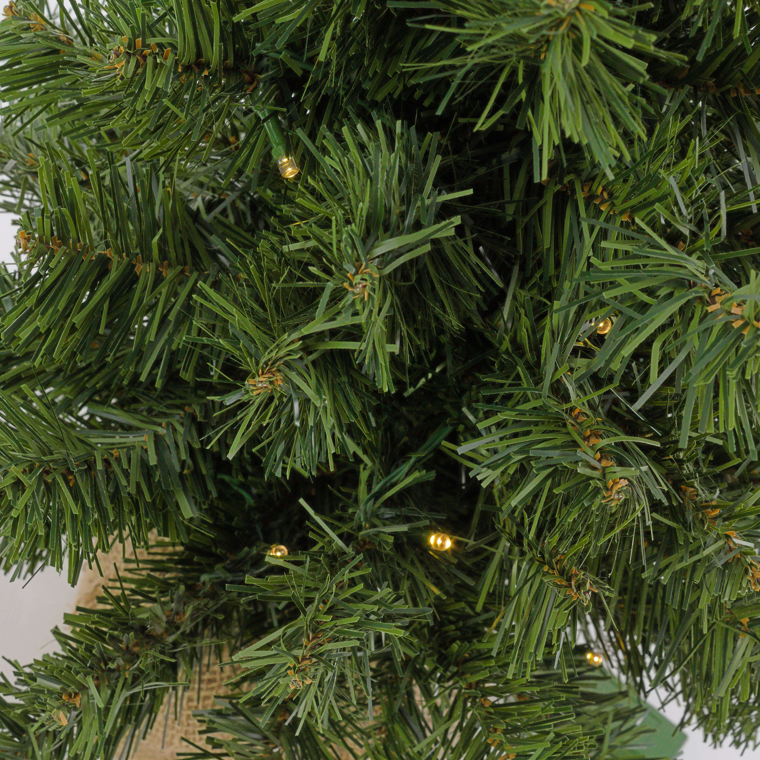 Mini faux sapin VARSOVIE avec guirlande lumineuse de la nouvelle collection artplants mesurant environ 90 cm de haut et 50 cm de diamètre. Le petit arbre est livré dans son sac rouge. Les branches déjà fixées sur le tronc permettent une installation simple et très rapide du sapin.