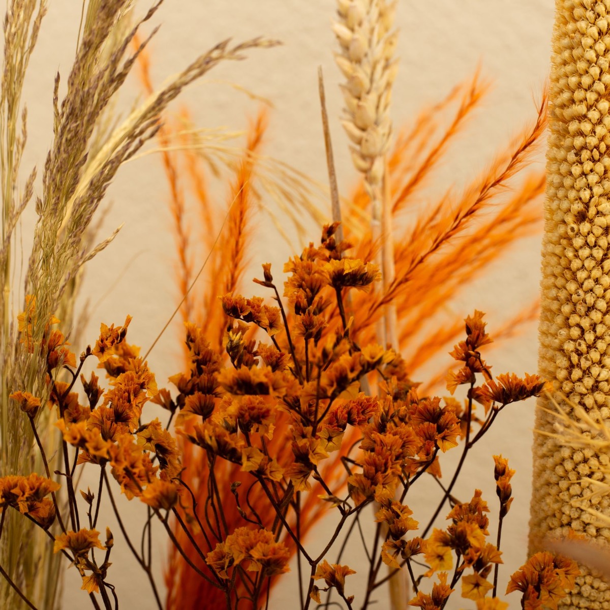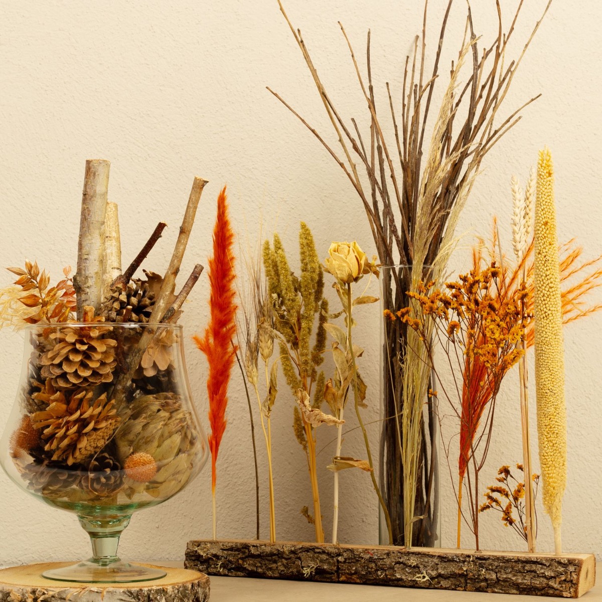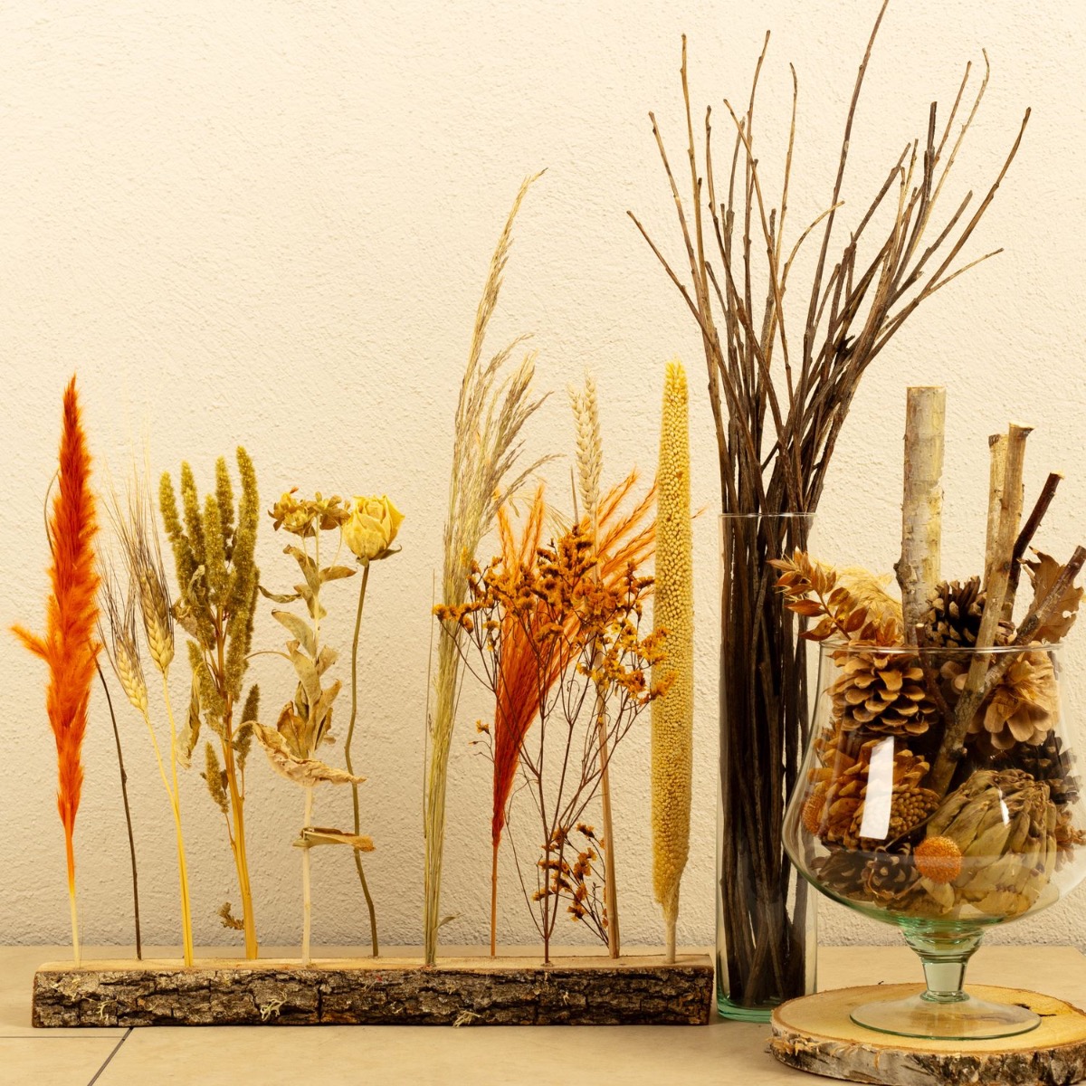 L'automne brille ! Aujourd'hui, nous présentons enfin un look de notre offre variée de décoration naturelle. Les fleurs séchées, les fruits d'arbres et les branches sont vraiment superbes pour faire entrer l'automne dans la maison. L'arrangement de fleurs séchées avec ses éléments orange vif est tout simplement magnifique à regarder et apporte de la couleur à la saison parfois grise. Shop the look!