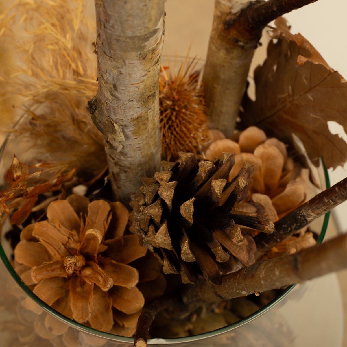 Conseil d'aménagement : Mettre le pot-pourri automnal de pommes de pin et de branches sèches dans l'immense verre à cognac. Les petites branches s'adaptent parfaitement au vase cylindrique et il suffit de les y placer. Très facile à reproduire !