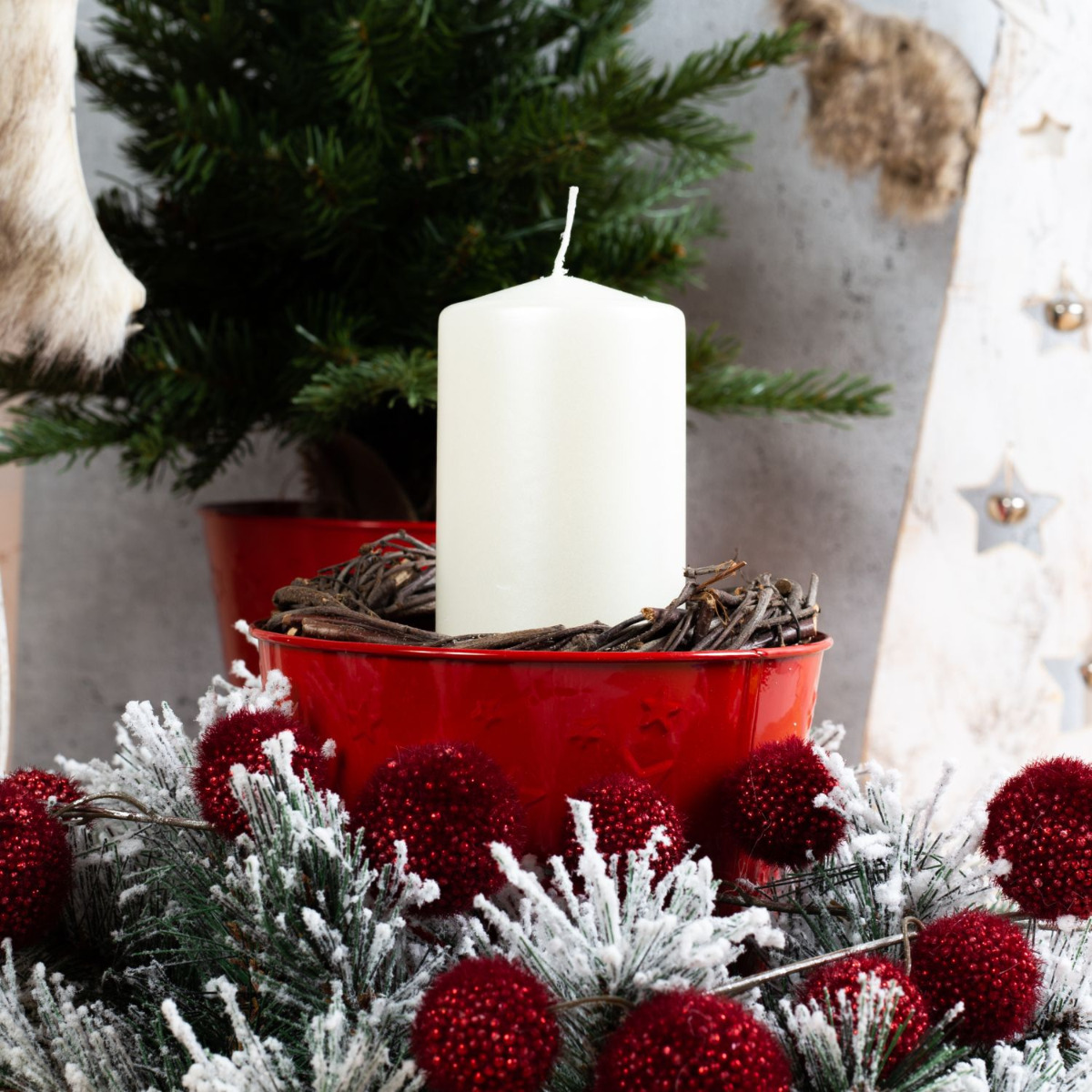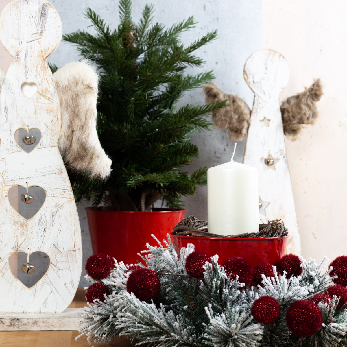 Une période contemplative avec les anges ! Tout en blanc, avec des ailes en fourrure synthétique et des clochettes, les anges annoncent la période de l'Avent. La couronne de sapin enneigée est ornée de branches de gomphocarpus rouges. Les pots en zinc rouges avec des étoiles découpées contribuent à l'harmonie de l'ensemble et maintiennent le sapin en place. Cela donne vraiment envie de fêter Noël ! Shop the Look !