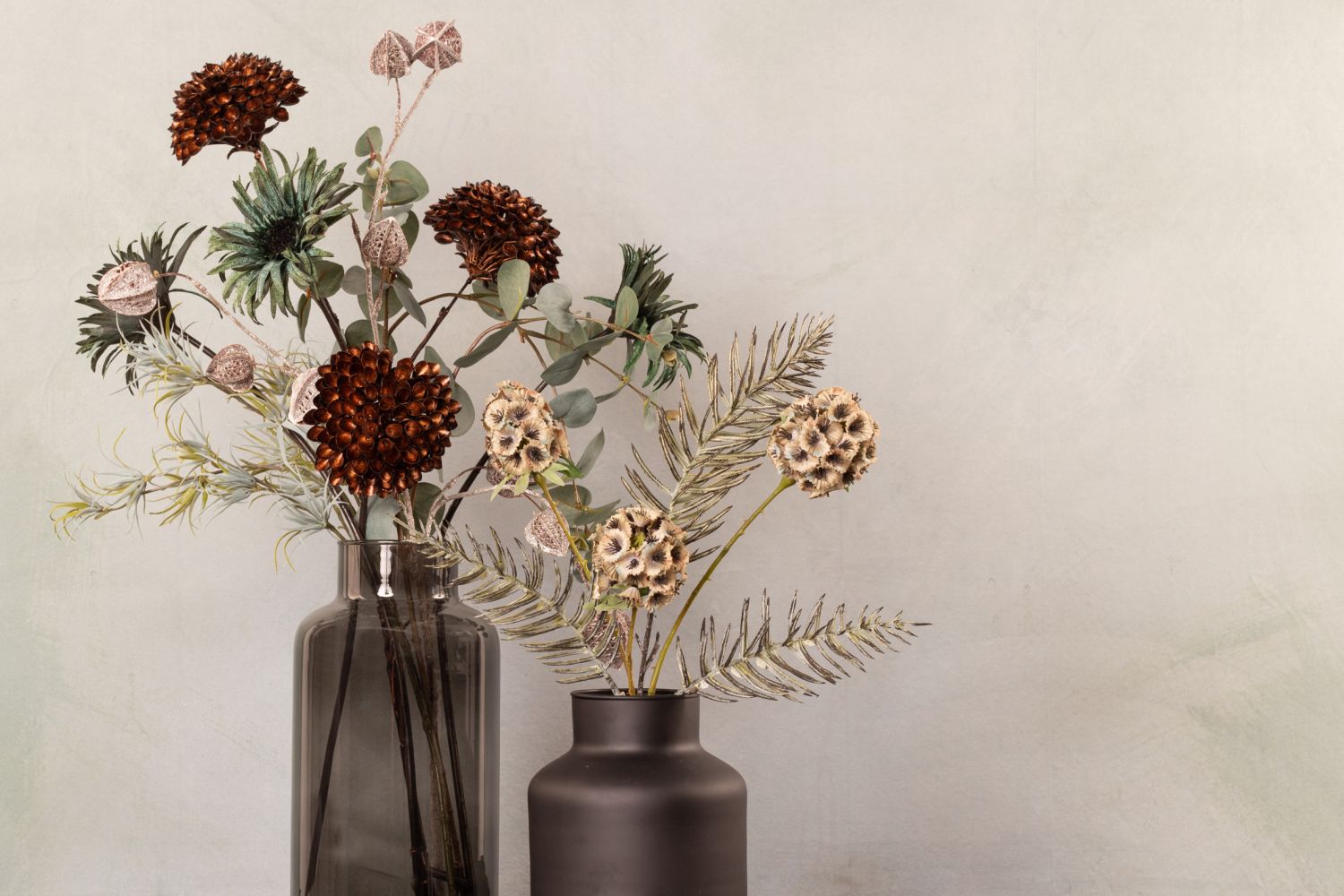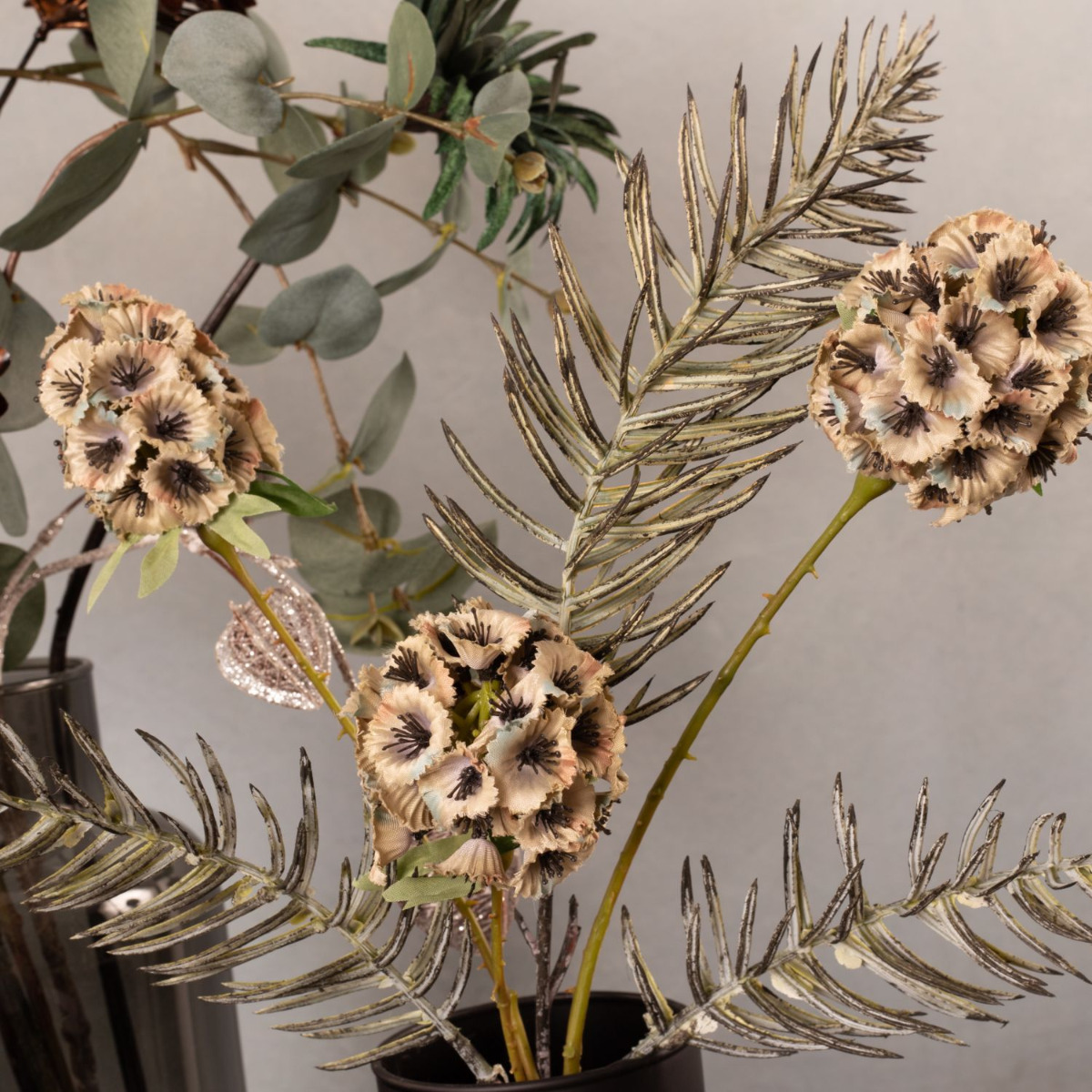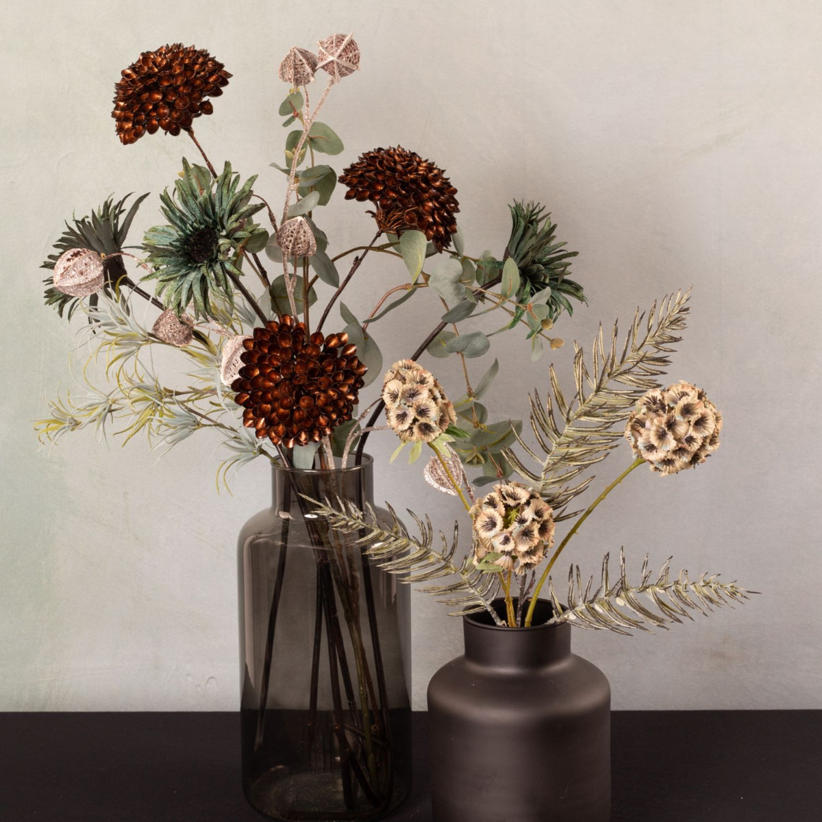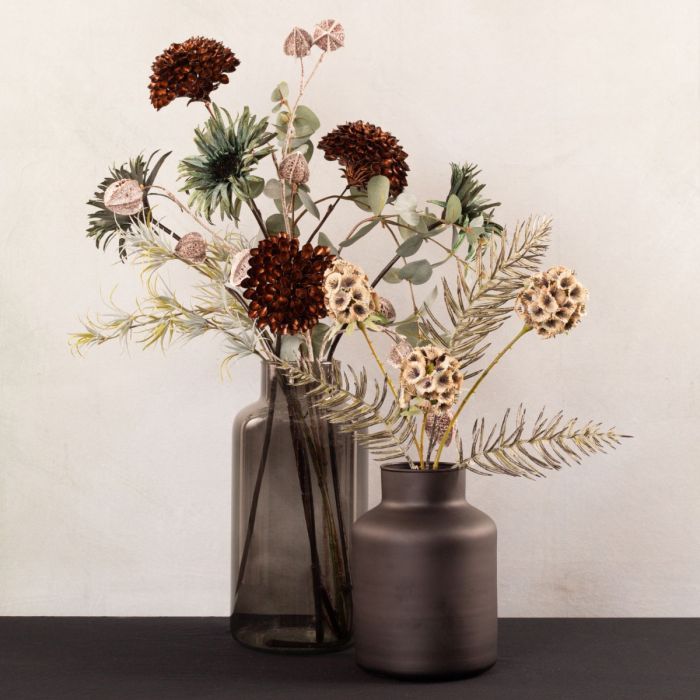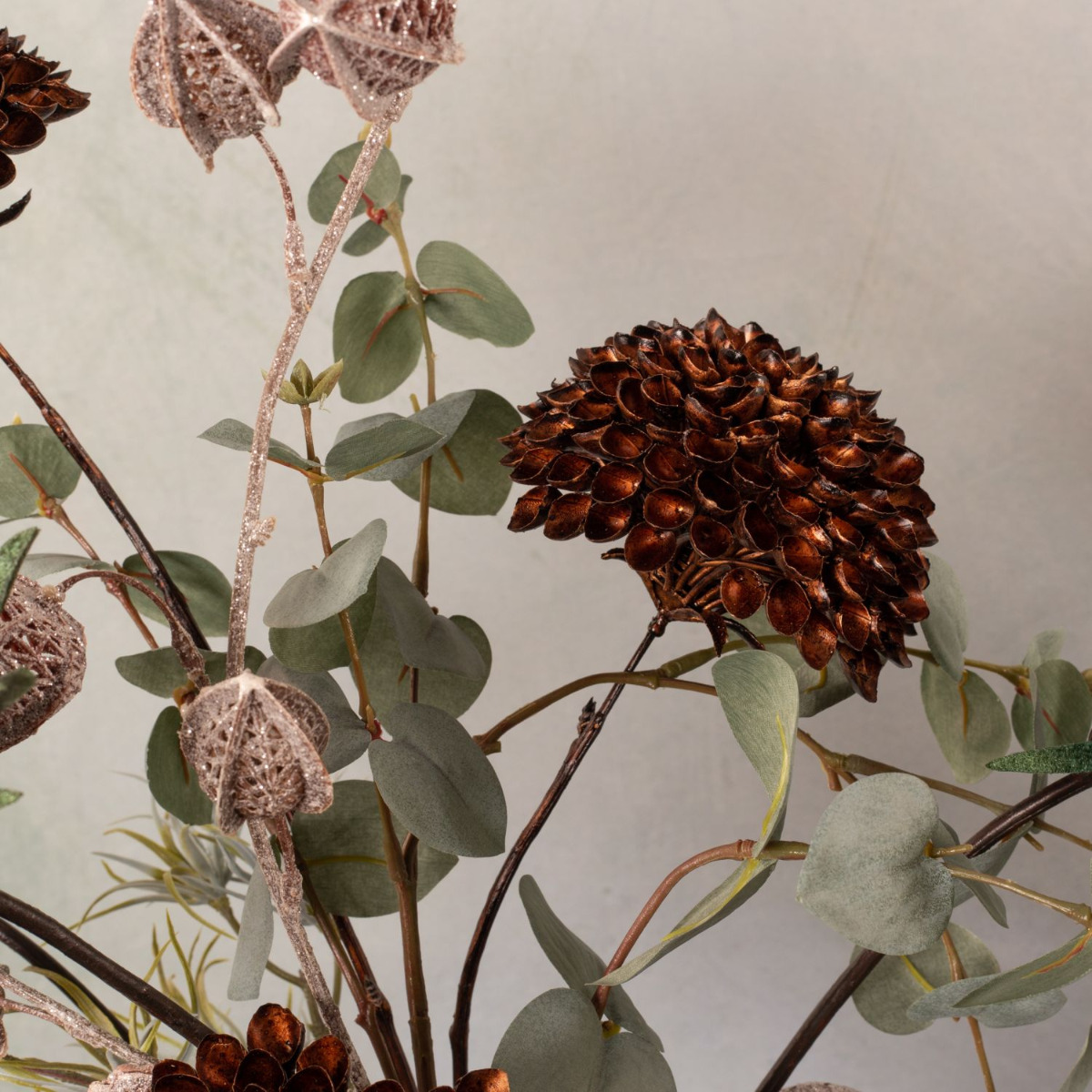 Elégance de Noël! Combinée avec notre look "L'élégance à la Art nouveau", cette composition crée une ambiance de Noël. Un physalis marron avec des paillettes argentées associé à des tons de pétrole tendres et vifs confèrent à ce look une toute nouvelle touche automnale. La surface veloutée du gerbera invite à se détendre. Des fleurs sphériques de scabieuse étoilée et un tillandsia épineux rappellent les boules de neige et les premières gelées qui vont bientôt arriver. Mais le look est particulièrement hivernal grâce à la branche de conifères de cyprès qui ne doit bien sûr pas manquer. Cela donne vraiment envie de Noël. Shop the Look!