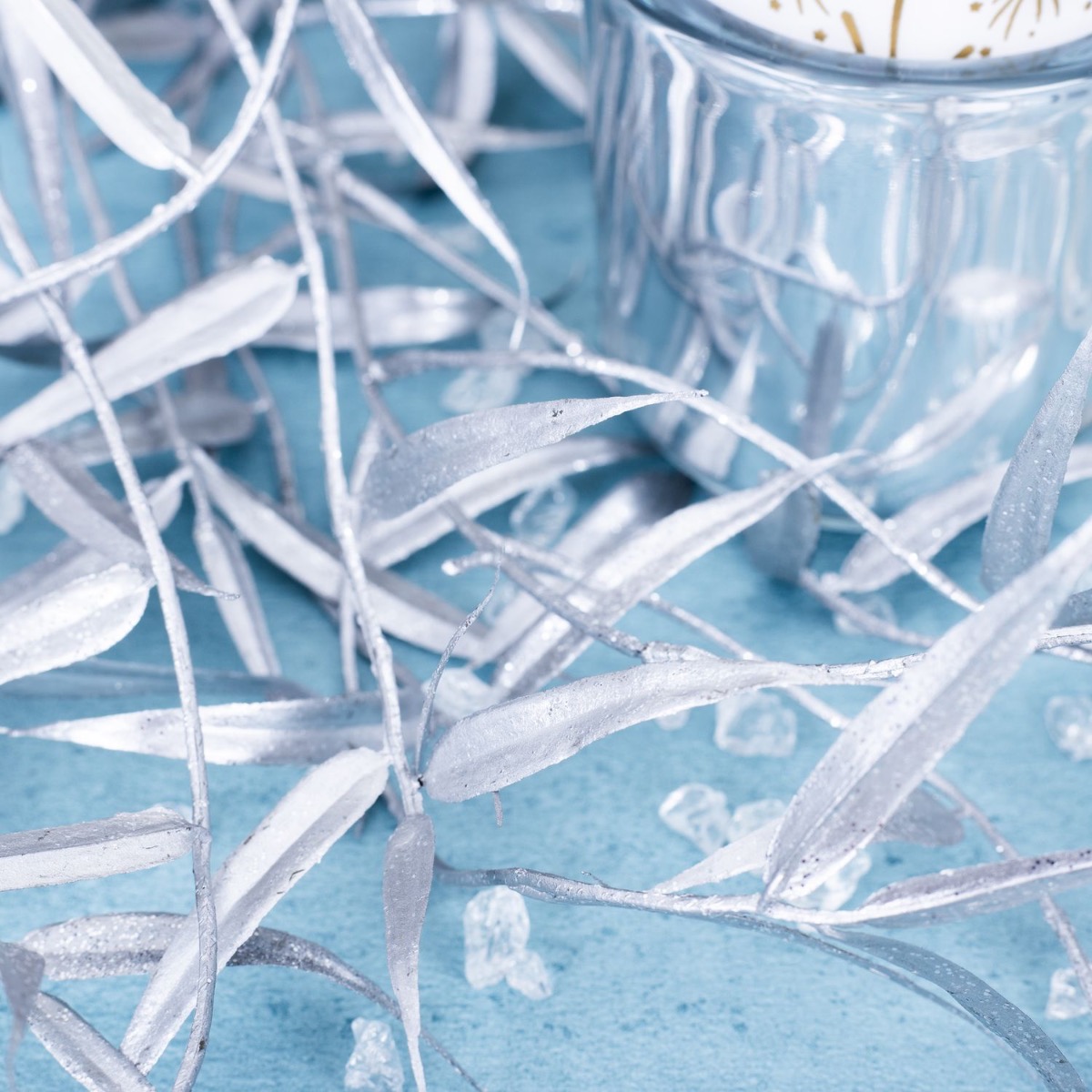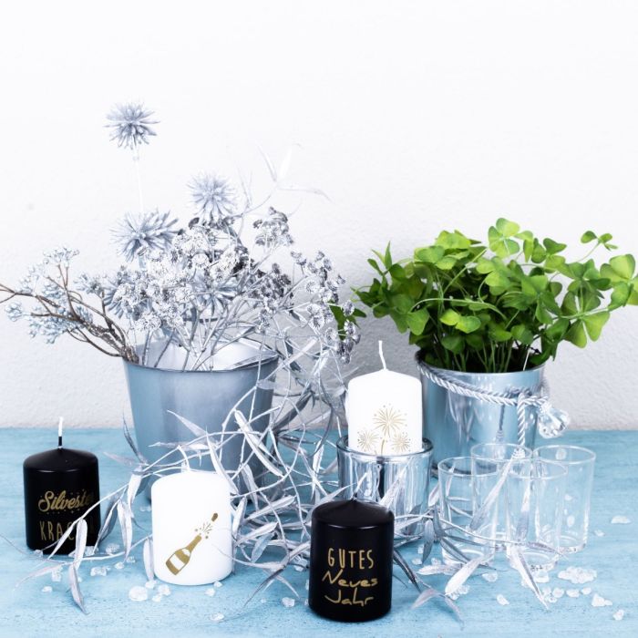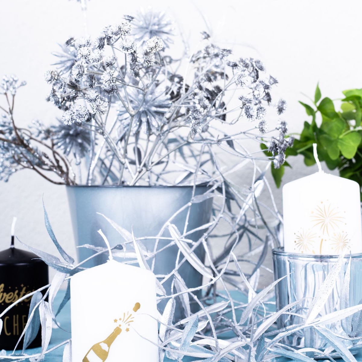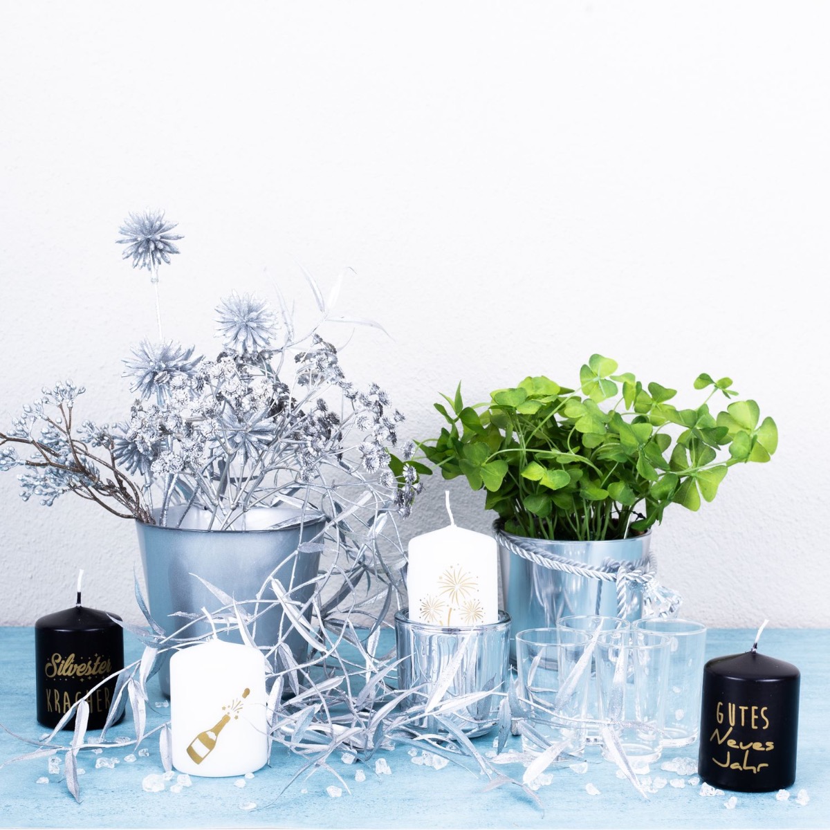 L'argent et des paillettes ! On aimerait terminer le dernier jour de l'année avec beaucoup de glamour pour commencer la nouvelle année avec une énergie renouvelée. Les verres à bougie et les pots en argent font ressortir le look de la Saint-Sylvestre. Le bleuet argenté, le saule, le gaultheria et le gypsophile créent un superbe effet de brillance qui fait resplendir la table dressée pour le Nouvel An. Le set de bougies de Nouvel An crée une ambiance appropriée pour la soirée à venir et apporte en même temps quelques bons vœux sur la table. Le trèfle à quatre feuilles ne doit pas manquer. Shop the look!