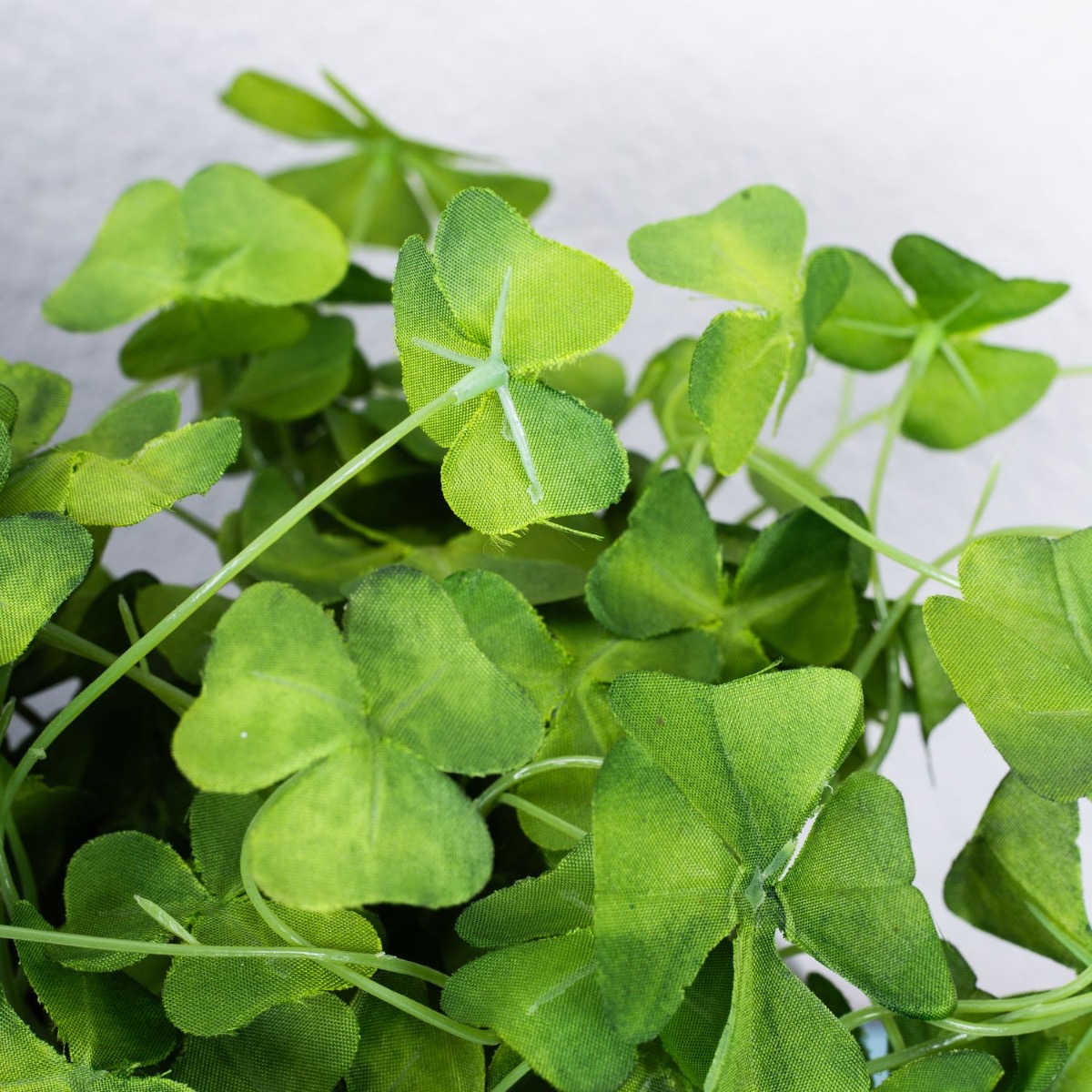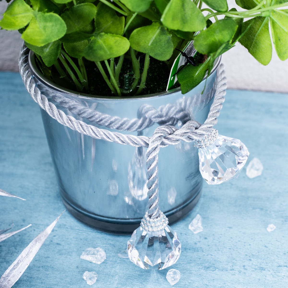 Conseil d'aménagement : Le trèfle porte-bonheur est tout simplement mis en pot. Les fleurs et les branches argentées sont raccourcies et pliées de manière à ce qu'elles se répartissent bien dans le pot. La branche de saule pleureur sort du pot et s'enroule autour des verres et des bougies. Attention à ne pas trop s'approcher des bougies. Facile à reproduire !