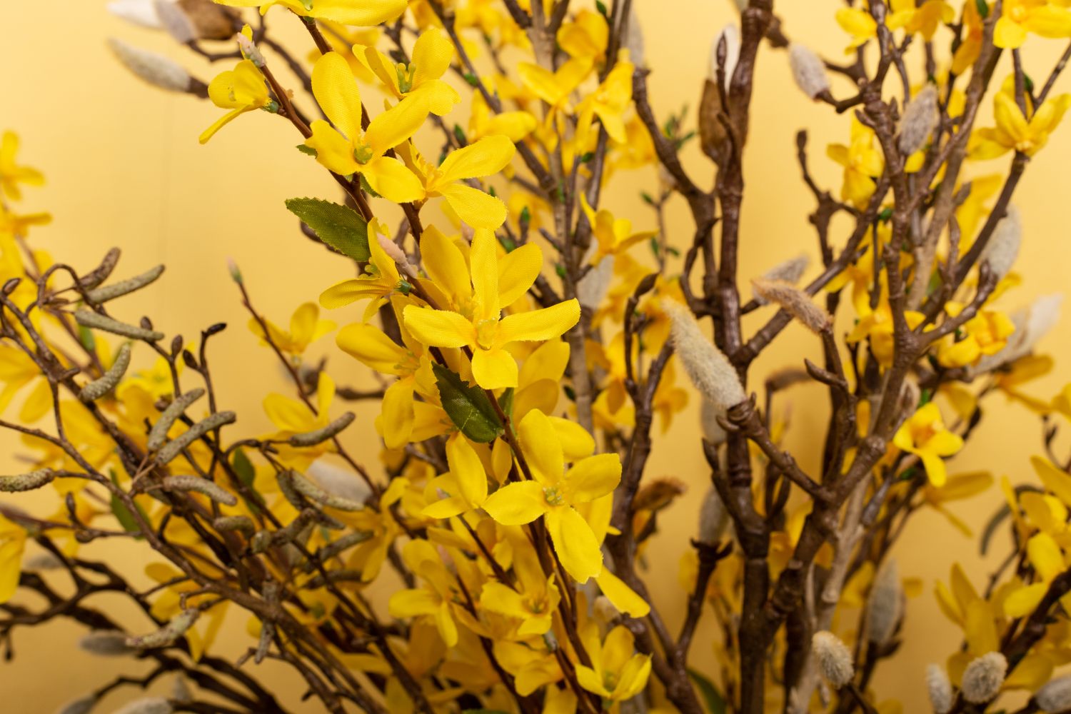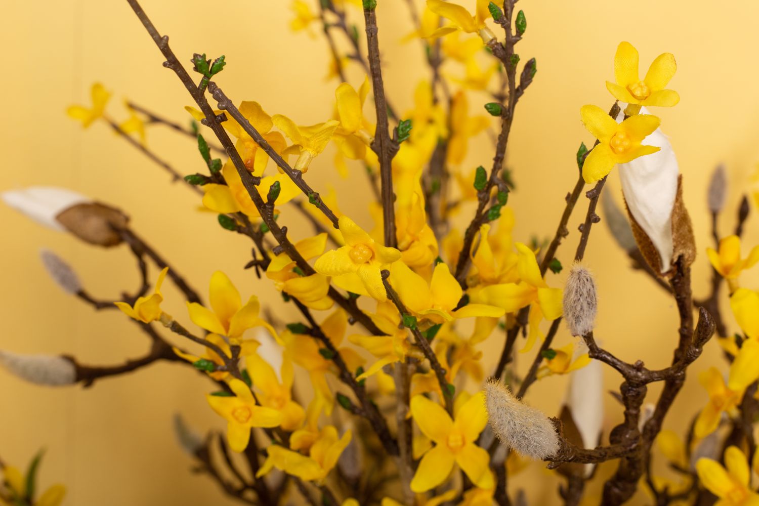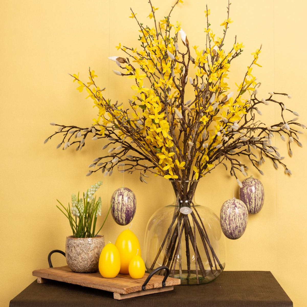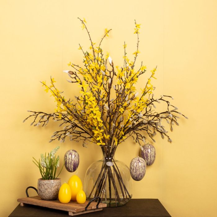 Simple et naturel!Le long hiver est enfin terminé et les premiers rayons de soleil font apparaître les premières fleurs dans la nature. Enfin, la chaleur revient ! Les magnolias et les branches de bouleau semblent avoir été cueillis et sont parfaits pour y accrocher quelques œufs de Pâques. Il est vraiment rare de voir des jacinthes blanches dans la nature. Ici, elles se marient particulièrement bien avec les bourgeons blancs et duveteux du magnolia. Nous avons complété ce look avec cinq branches de forsythia jaunes. On voit bien que Pâques approche. Shop the Look!