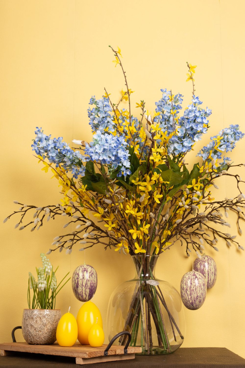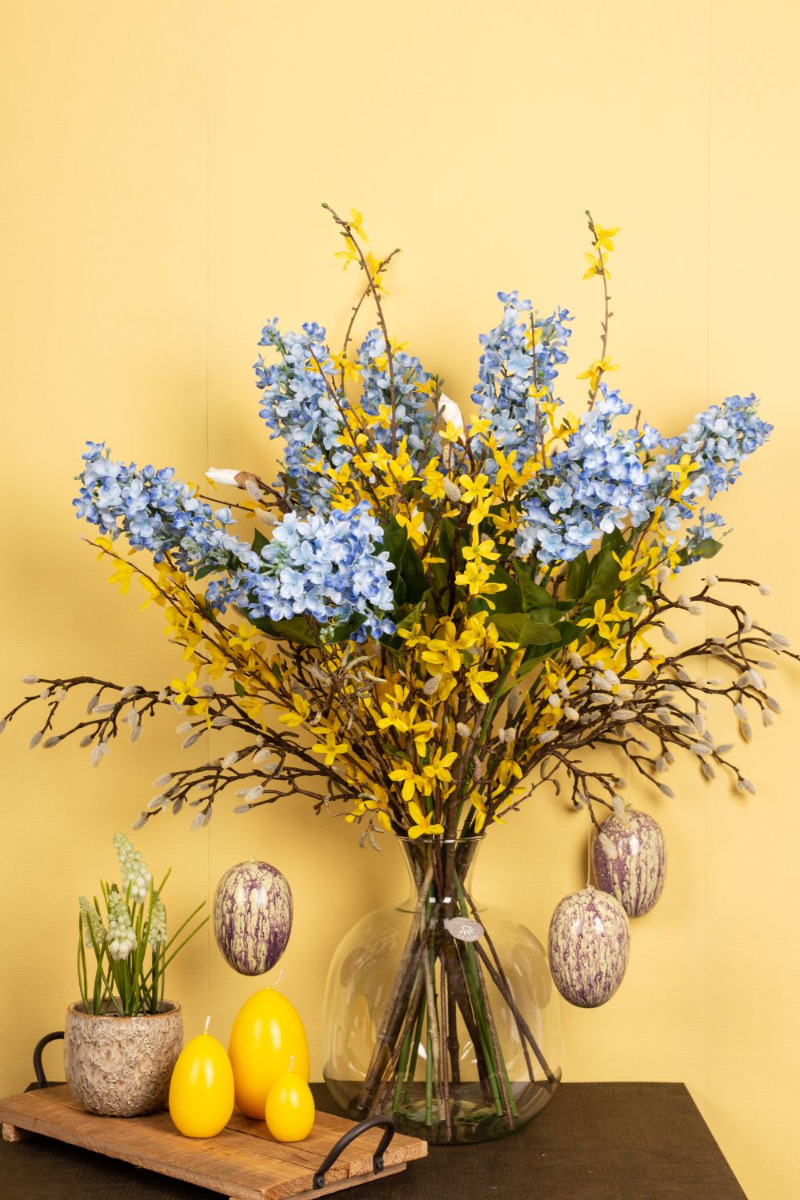 Simple et naturel! Le long hiver est enfin terminé et les premiers rayons de soleil font apparaître les premières fleurs dans la nature. Enfin, la chaleur revient ! Les magnolias et les branches de bouleau semblent avoir été cueillis et sont parfaits pour y accrocher quelques œufs de Pâques. Il est vraiment rare de voir des jacinthes blanches dans la nature. Ici, elles se marient particulièrement bien avec les bourgeons blancs et duveteux du magnolia. Nous avons complété ce look avec 5 branches de forsythia jaunes et du lilas bleu. La chasse aux œufs de Pâques peut commencer ! Shop the Look!