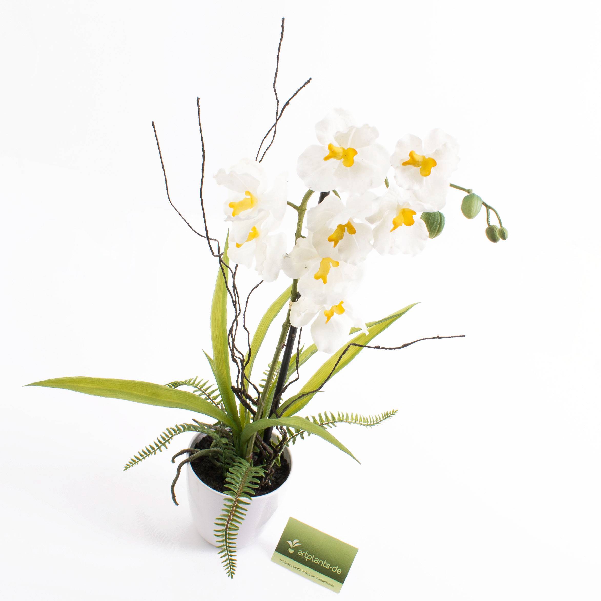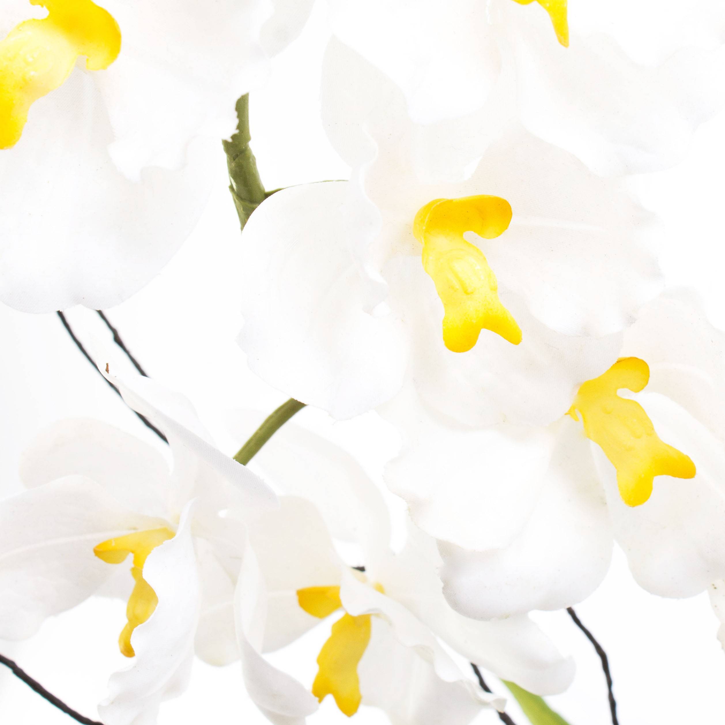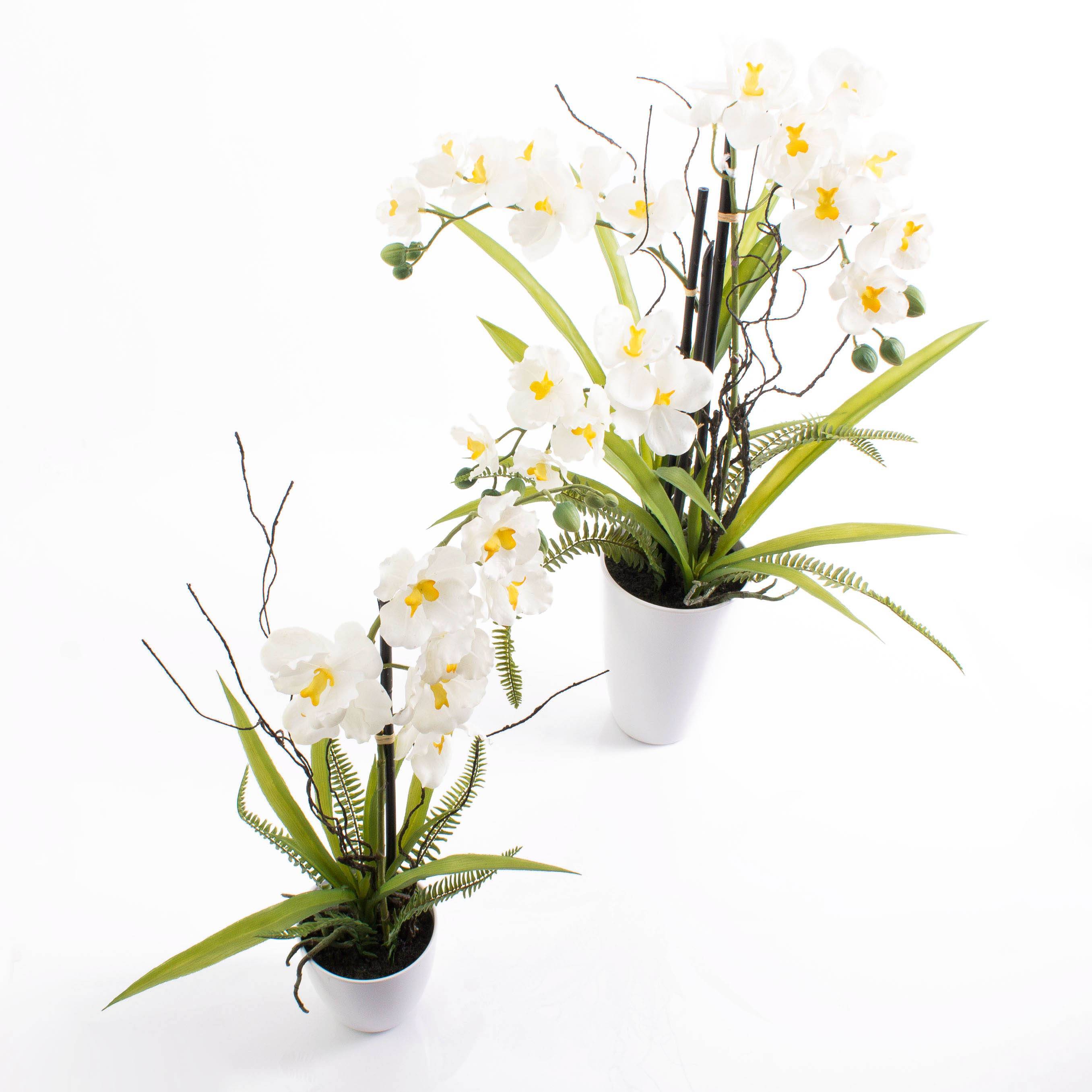 Orchidée Phalaenopsis artificielle MELINA avec des fleurs blanche. Cette orchidée artificielle mesure au total environ 65 cm de haut et est livrée dans un magnifique pot décoratif blanc.