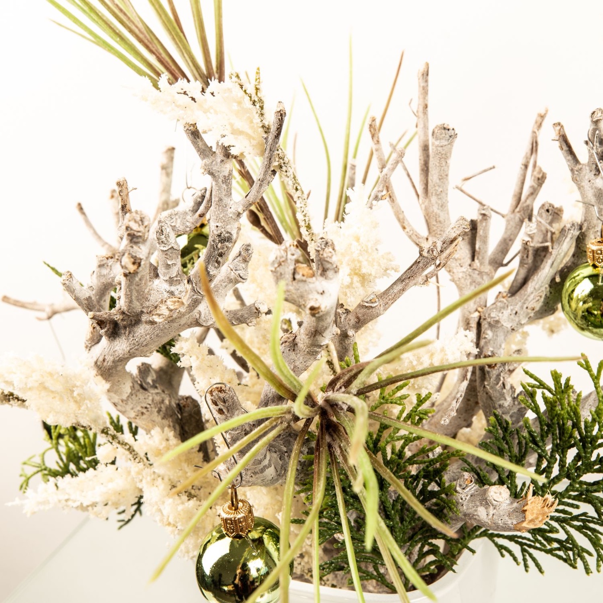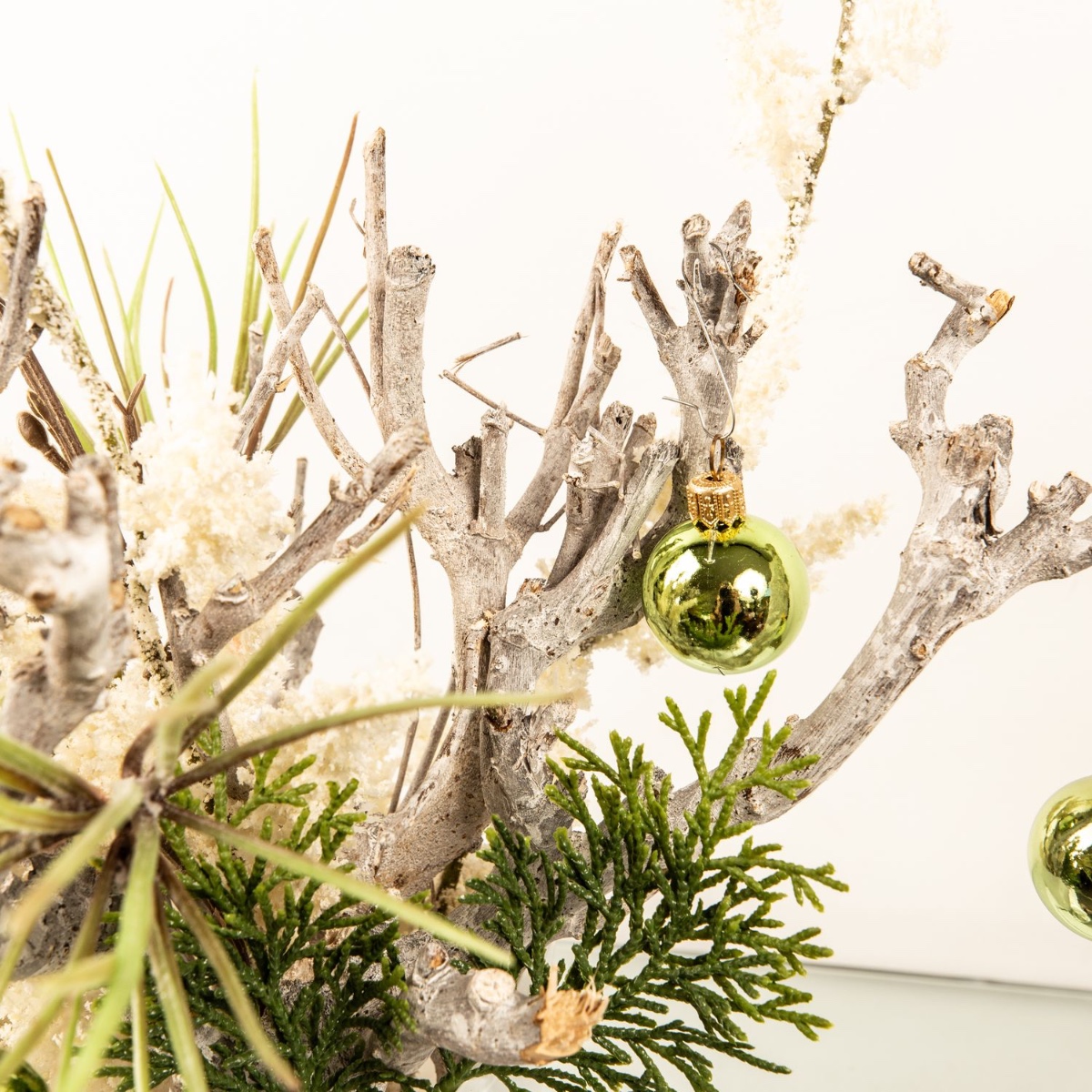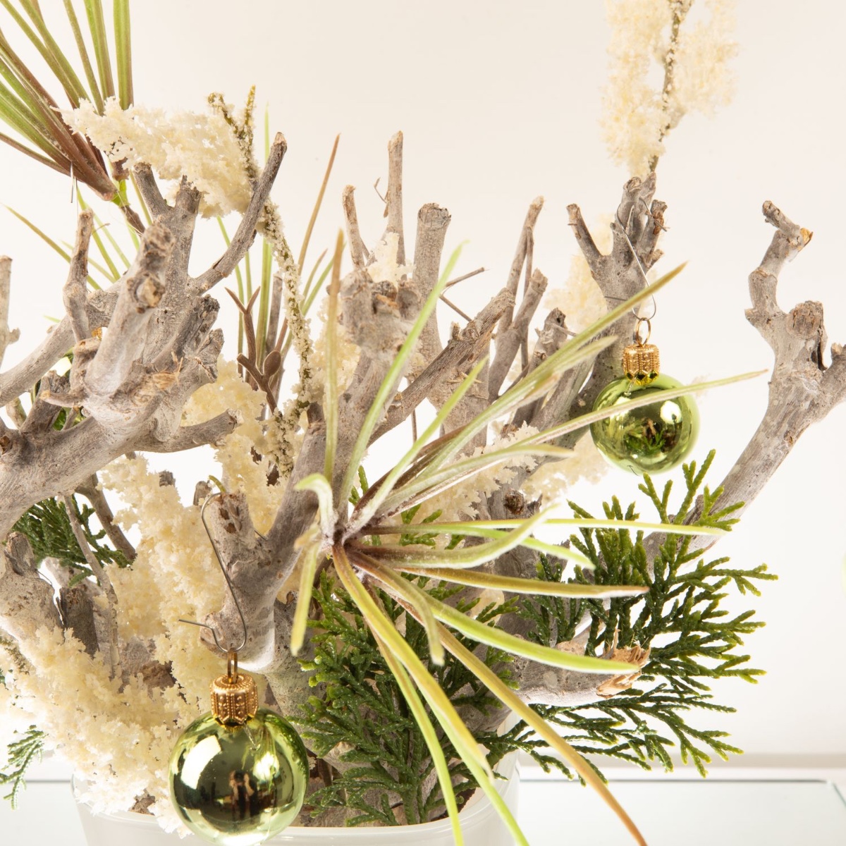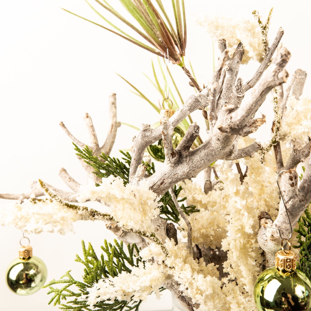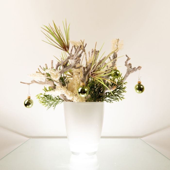 Blanc et vert ! Des branches blanchies à la chaux ont été utilisées comme base, puis disposées avec une branche de pin et une branche de cèdre pour créer un magnifique arrangement. Un pot d'orchidée blanc est parfait pour les courtes branches de bois. La branche de callune blanche, qui donne l'impression que la première neige vient de tomber, attire particulièrement le regard. Les boules vertes créent une ambiance de Noël. Shop the Look !