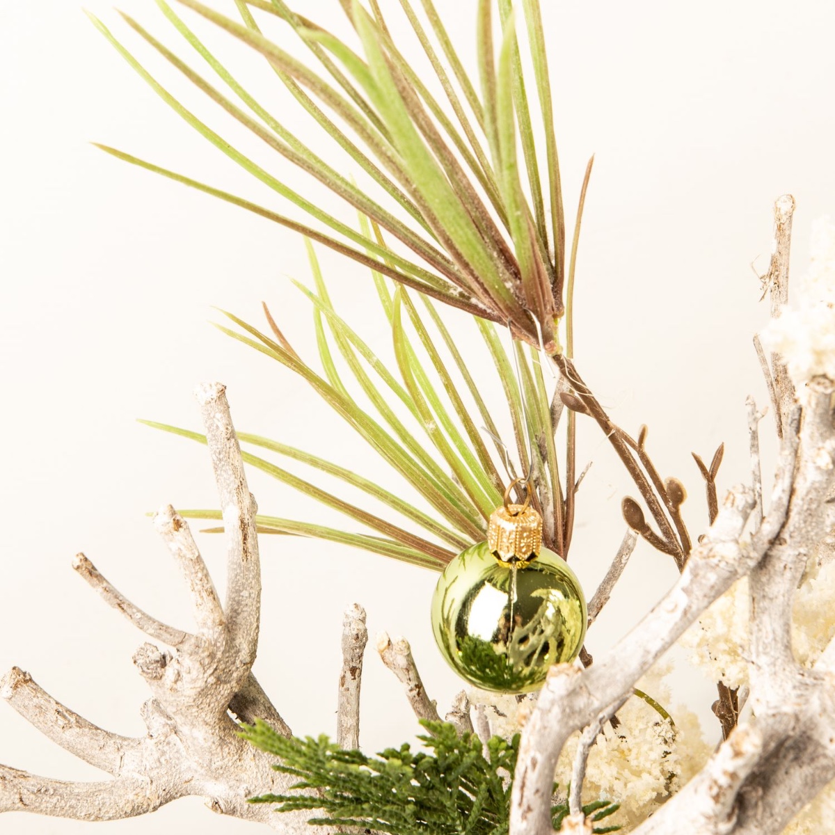 Conseil de création : commencez par placer les branches de bois dans le pot, puis disposez les branches dans les espaces vides. Pour finir, suspendez les boules.