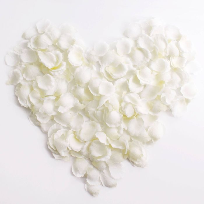 Environ 300 pétales de roses artificiels de couleur blanc crème en fibre textile de qualité supérieure livrés dans un sachet cellophane.