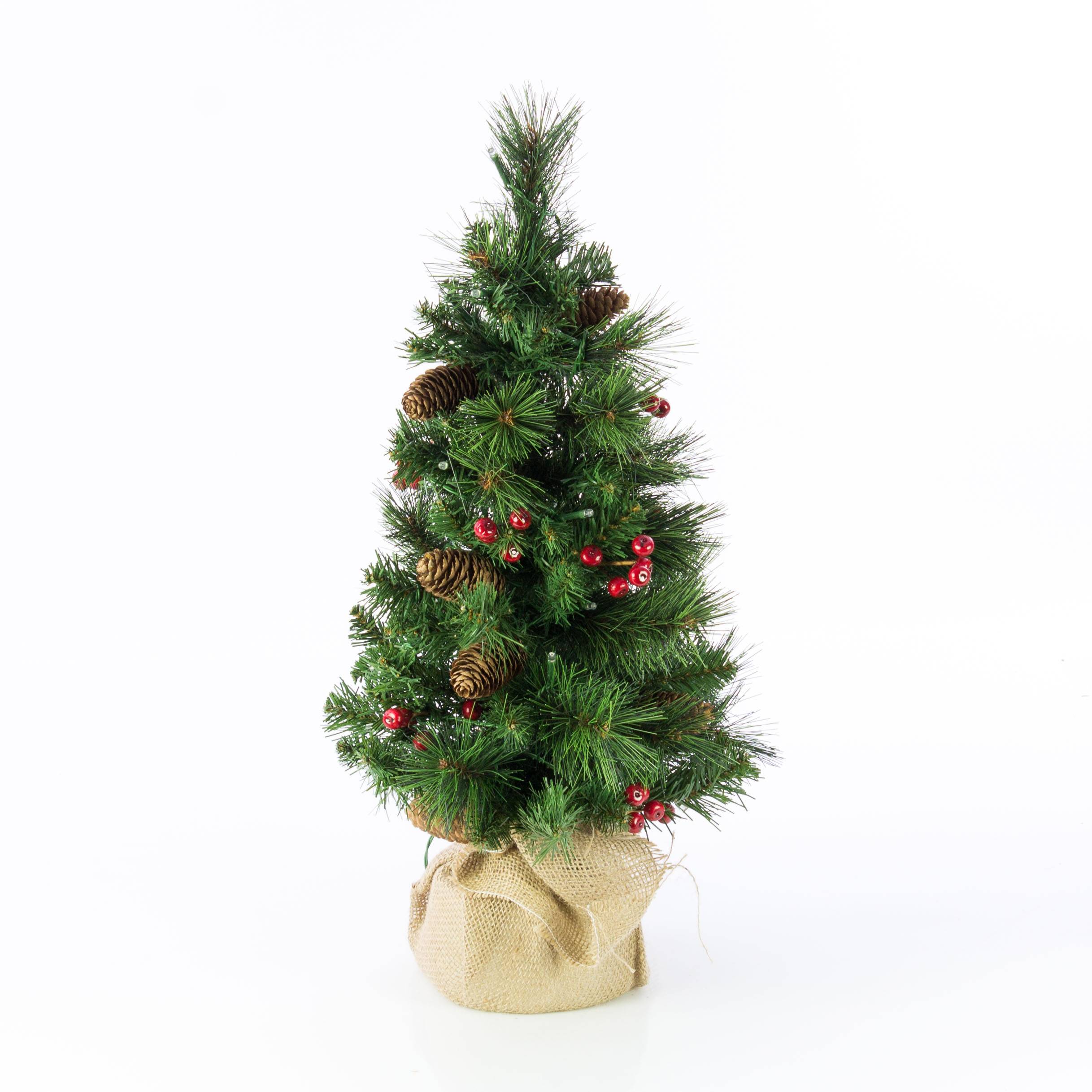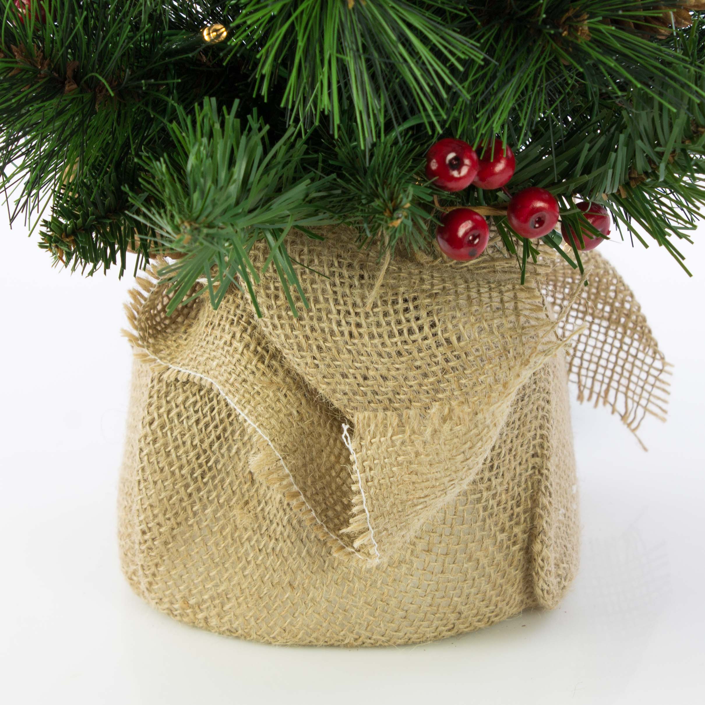 Petit sapin artificiel BUCAREST, sac de jute, décoré, LEDs, 60cm, Ø35cm