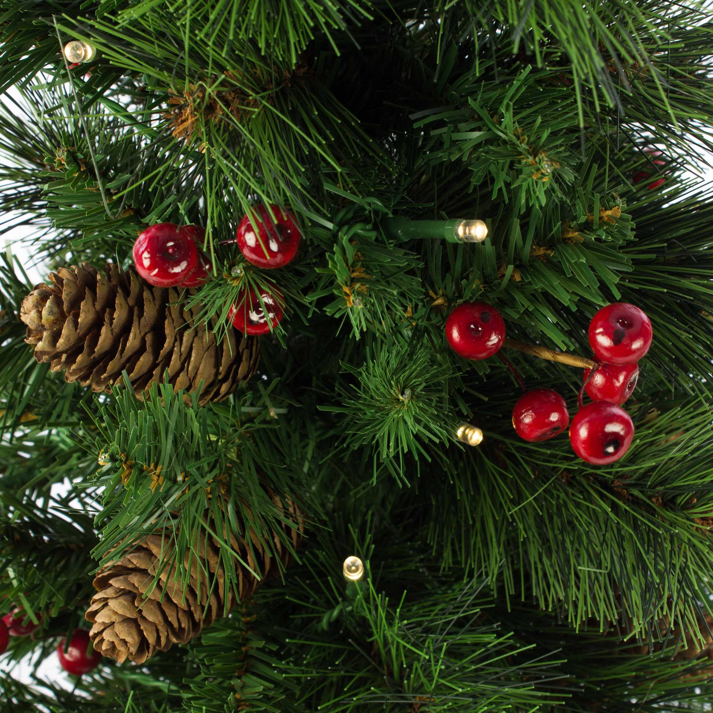 - Constitué d'env. 80 branches artificielles pliables de couleur verte, décoré de baies rouges, de pommes de pin et de 35 lumières