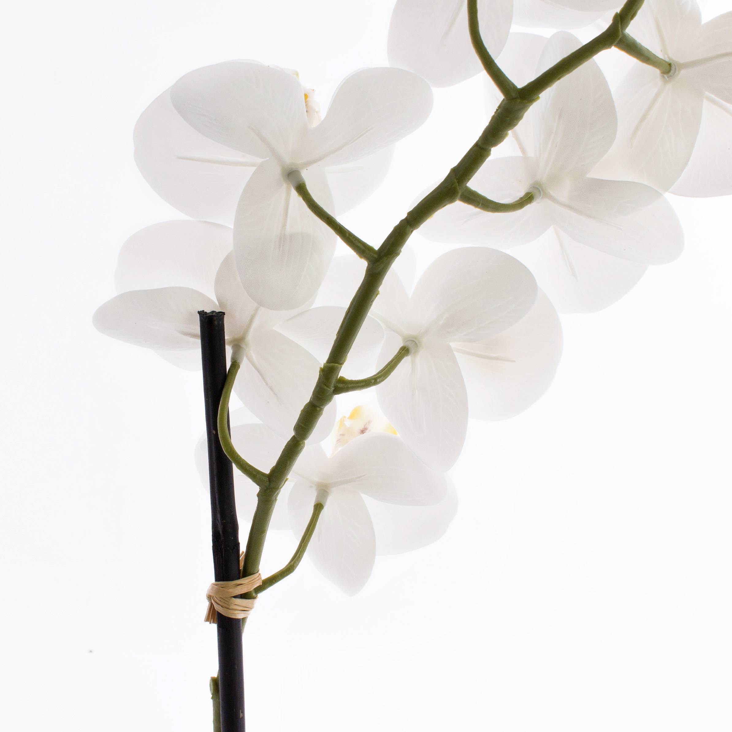 - Pourvue de 7 fleurs, au toucher naturel (real touch) de couleur blanche et de 4 boutons, le pot est rempli de terre décorative et quelques racines aériennes, le tout solidement fixé ensemble