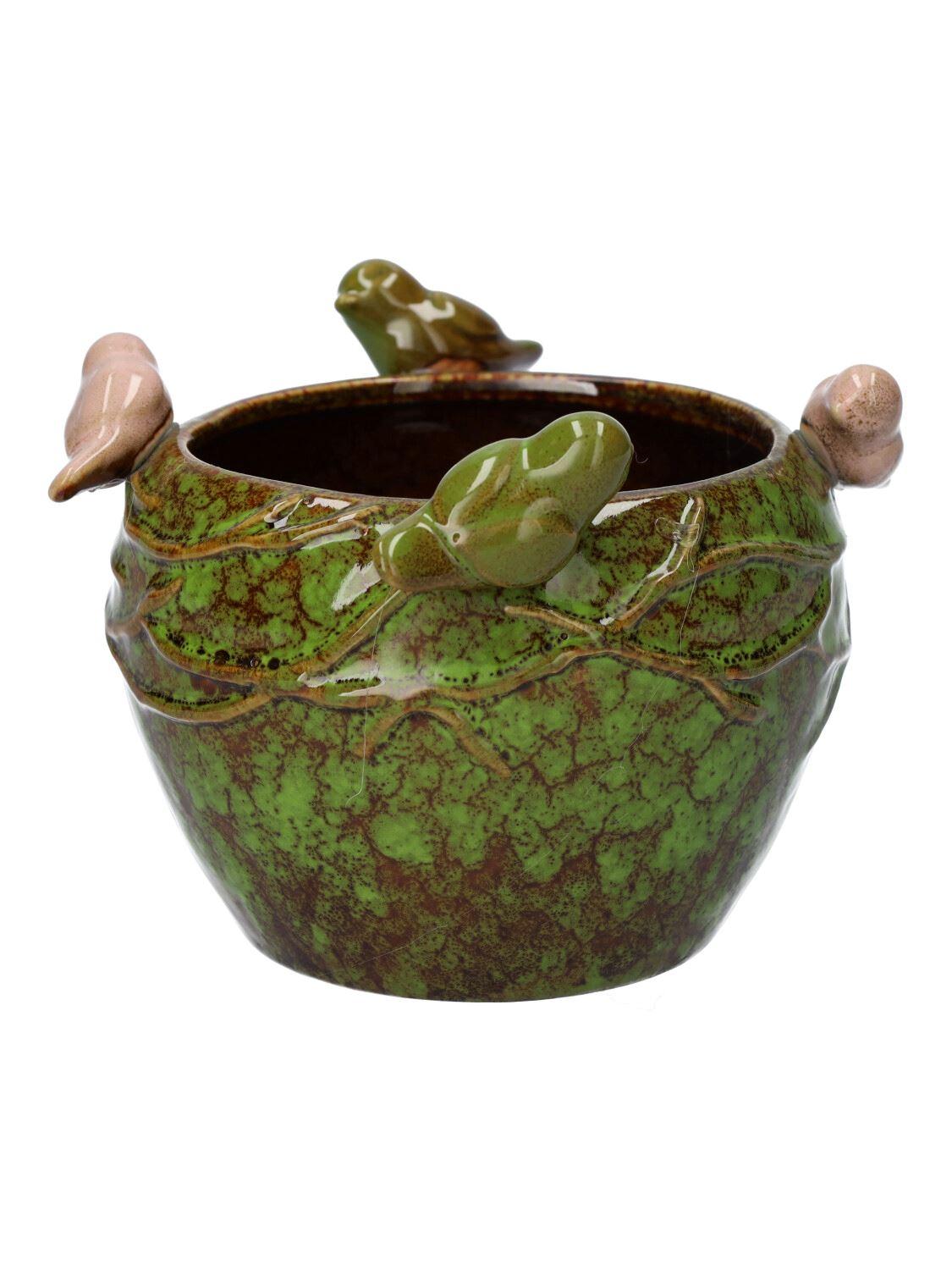 Pot à plantes rond SARINO en céramique, avec des oiseaux en 3D, vert-brun-beige, 10,5cm, Ø14cm