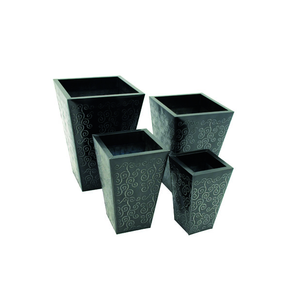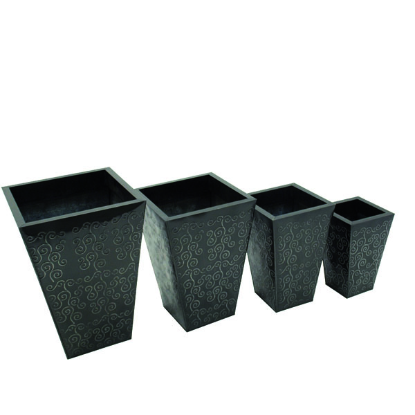 Le bac à fleurs noir PILAR possède une base carrée et est décoré d'un motif de vrilles de couleur blanche. Le pot de fleurs d'environ 31 cm de haut est en zinc et est très décoratif.