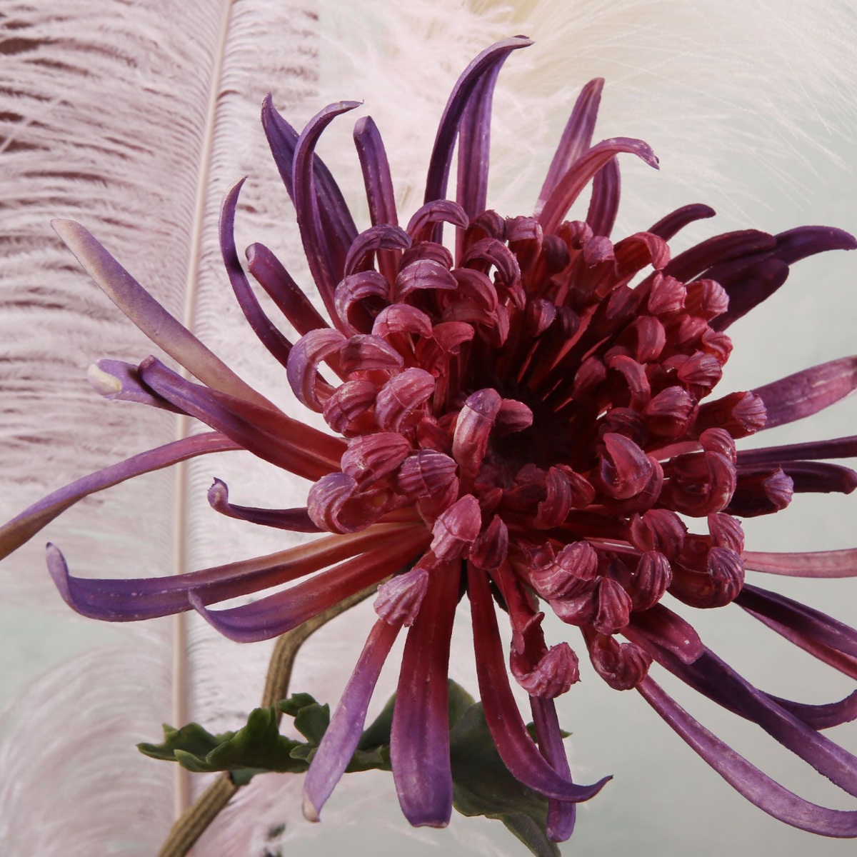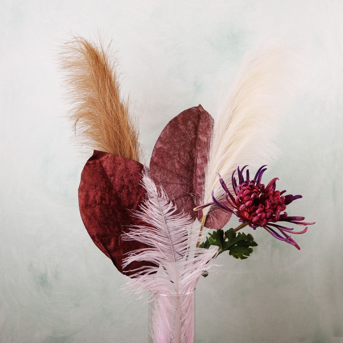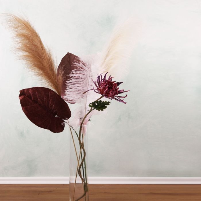 Conseil d'aménagement : Plier la tige du chrysanthème en spirale pour qu'il soit bien adapté au vase. Plier les feuilles légèrement vers l'extérieur. Mettre la plume et le stipa simplement comme ça.