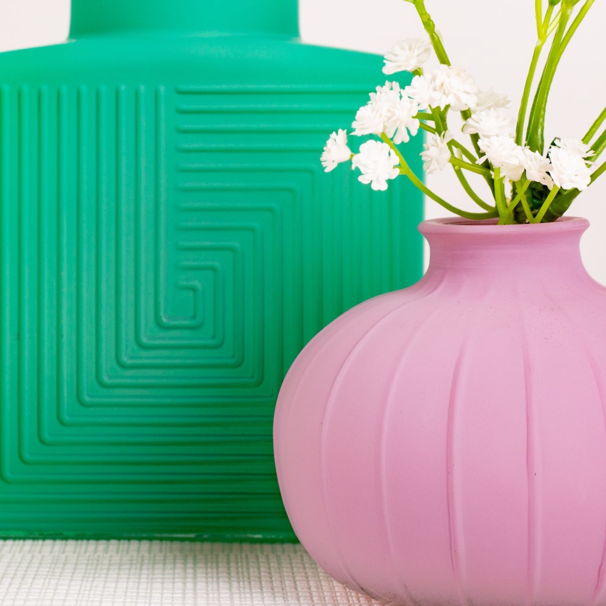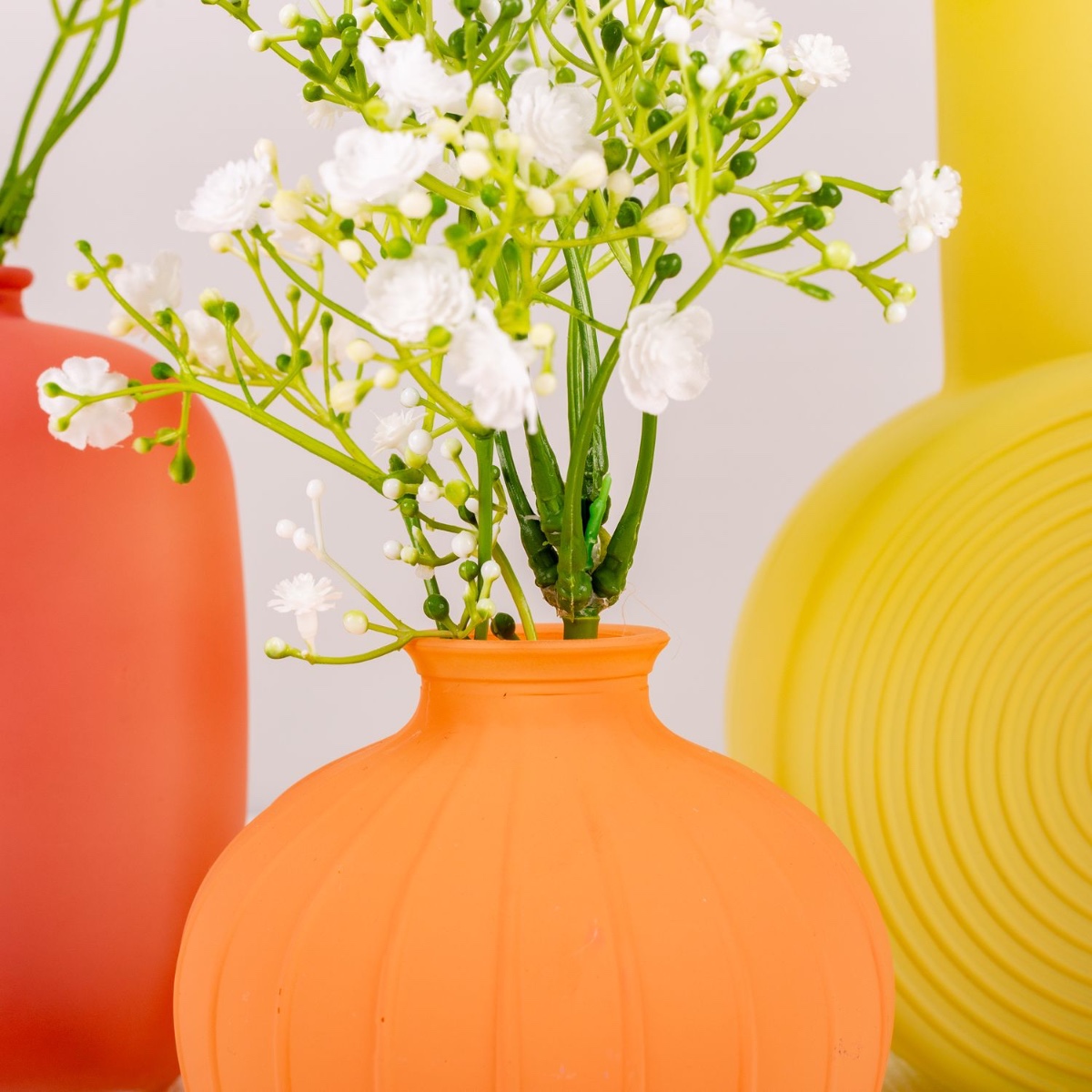 Conseil d'aménagement : Placer les vases à égale distance les uns des autres. Raccourcir au préalable le gypsophile à la longueur souhaitée à l'aide d'une pince coupante. Ensuite, garnir les vases et les plier.