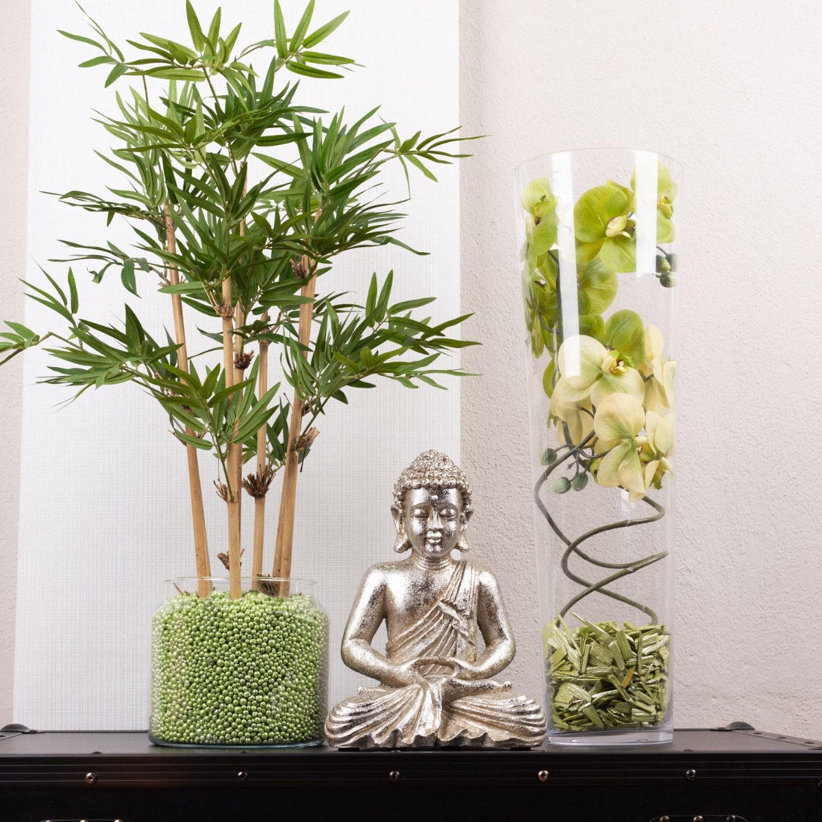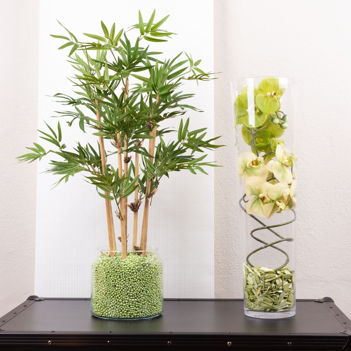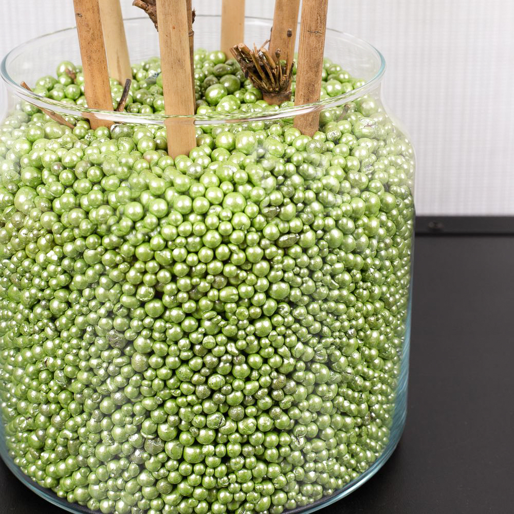 Conseil d'aménagement : Placer le bambou dans le verre et le remplir de perles décoratives colorées. Plier les orchidées en spirale et les adapter au grand vase. Le paillis d'écorce coloré cache les extrémités des branches d'orchidées.