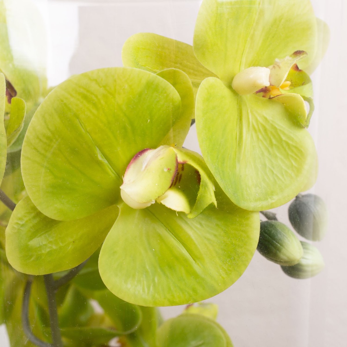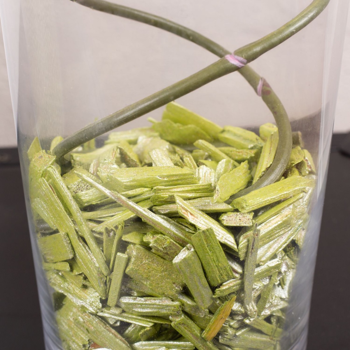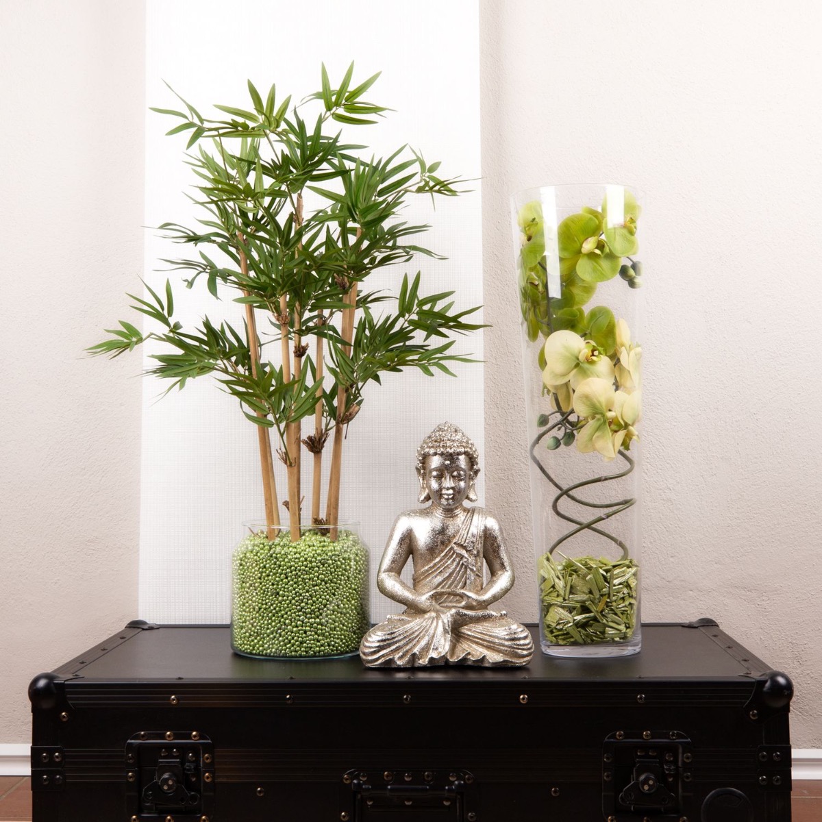Conseil d'aménagement : Placer le bambou dans le verre et le remplir de perles décoratives colorées. Plier les orchidées en spirale et les adapter au grand vase. Le paillis d'écorce coloré cache les extrémités des branches d'orchidées.