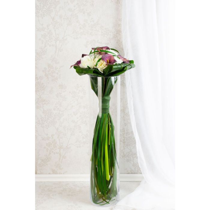 Le bouquet de mariage pour l'éternité! Par téléphone, Janine nous a contactés. Elle nous a parlé de son bouquet de mariée et de son souhait de le refaire en souvenir de son grand jour avec des fleurs artificielles. Elle nous a envoyé une photo de son extravagant bouquet de sceptre. Comme c'est typiquement le cas pour ce type de bouquet, il se présente avec des tiges et des brins d'herbe remarquablement longs, qui forment un sceptre grâce à un large ruban serré. Le choix des fleurs utilisées s'est porté sur de nobles callas, des roses classiques et des œillets blancs en signe de fidélité. Des feuilles de cordyline rabattues complétaient le bouquet. Nous avons pu reprendre le choix des fleurs artificielles comme décrit précédemment. La confection de notre premier bouquet de sceptre nous a d'abord posé un défi. En raison de la surface artificielle lisse, les feuilles glissaient lorsqu'elles étaient attachées. Les brins d'herbe n'ont pu être intégrés que difficilement, brin par brin. Nous avons fièrement présenté notre première proposition à Janine. Elle était ravie de notre travail, mais souhaitait des fleurs plus petites, car elles n'étaient pas aussi grandes dans l'original. Nous avons rapidement trouvé des roses et des œillets dans notre stock, mais nous n'avions pas d'autre calla violet dans notre assortiment. Nous avons alors cherché une telle fleur dans de nombreuses listes de fournisseurs. Cela nous a pris beaucoup de temps, mais nous avons été récompensés de manière positive. Nous avons rapidement commandé le petit calla et l'avons ajouté à notre assortiment. En remplaçant les fleurs, le bouquet a rapidement perdu en diamètre. Maintenant, la taille correspondait également à l'original, ce qui nous a permis d'accepter la commande de cette cliente. Vous aussi, vous aimeriez un bouquet de mariage artificiel pour l'éternité ? Shop the Look!