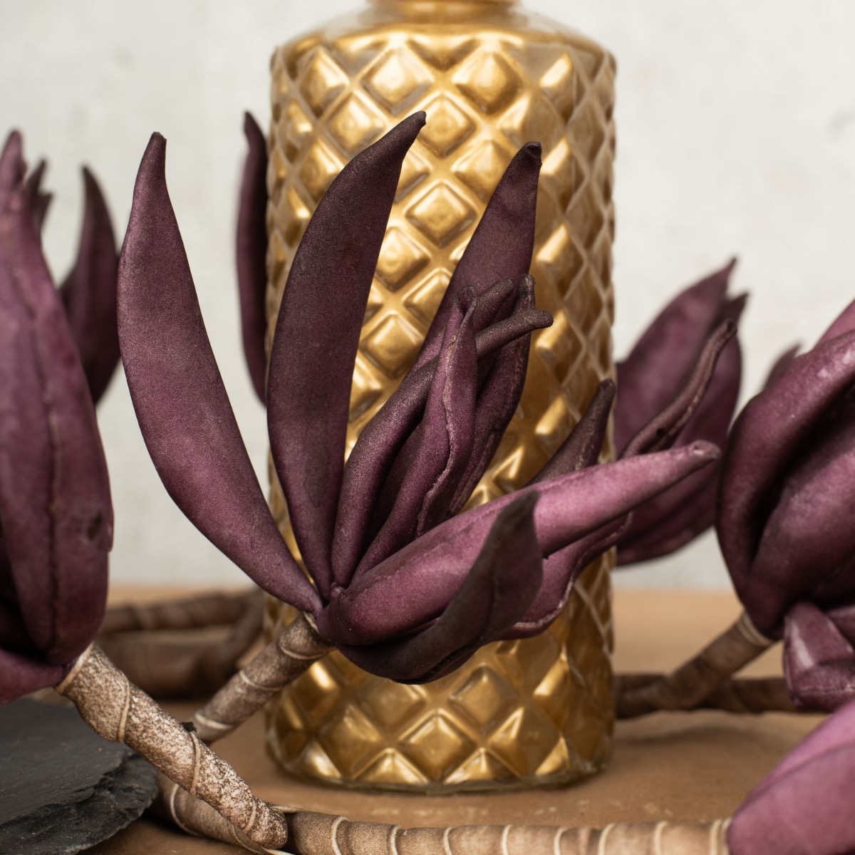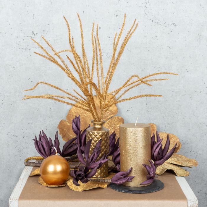 Le violet et l'or ! Une combinaison de couleurs atmosphérique qui convient particulièrement bien à la période hivernale. Quand il fait froid dehors, on a envie d'apporter de la chaleur dans sa maison. Les tons chauds de l'or sont particulièrement appréciés ici, car ils créent également une ambiance festive pour la période de Noël qui approche. Les fleurs en mousse artificielle de couleur lilas dépassent entre les décorations de table et entourent les éléments dorés sur la table. Enchantez vous aussi vos invités avec cette déco de rêve. Shop the look!