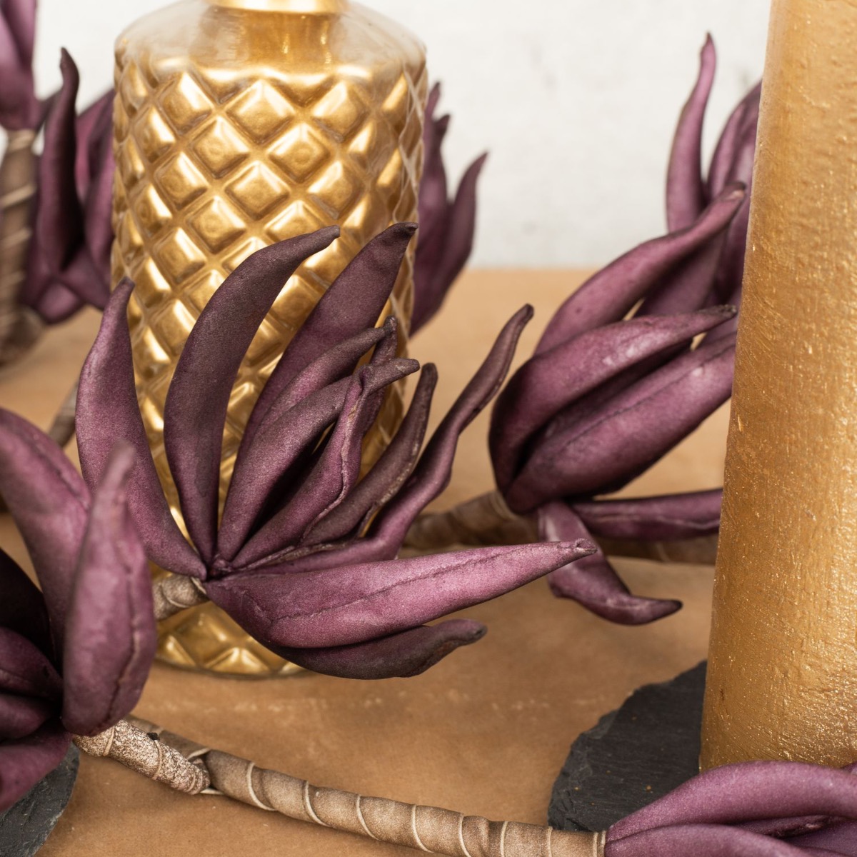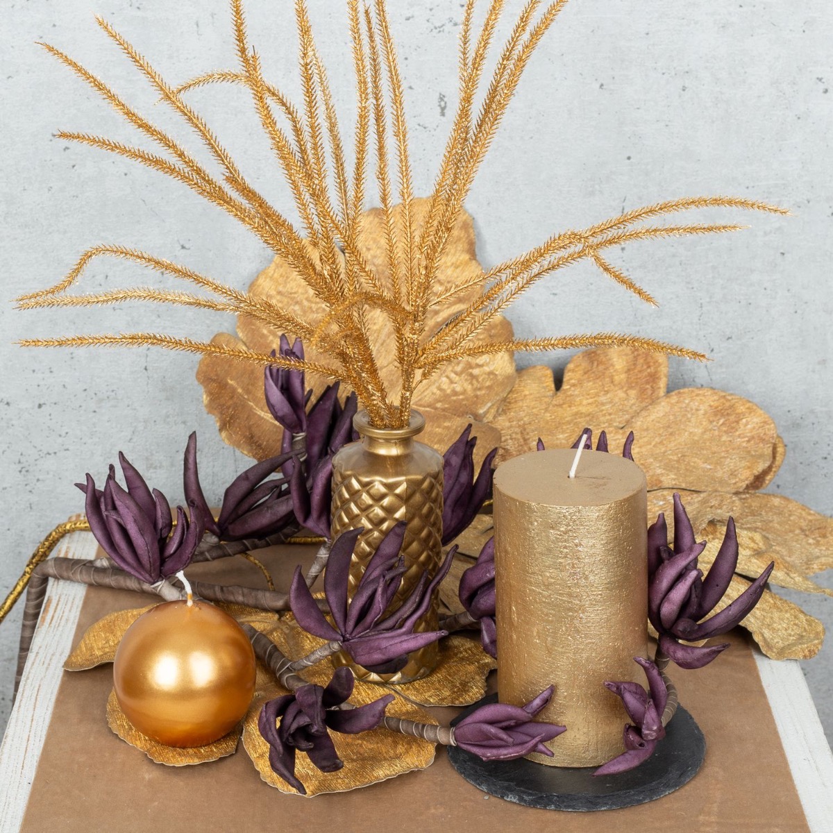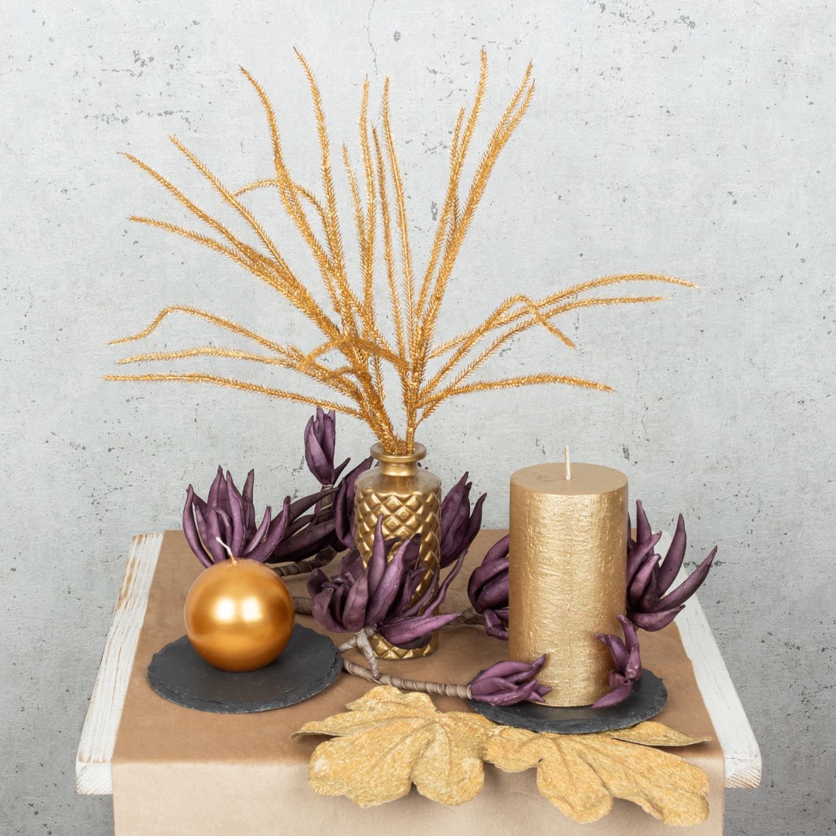 Conseil d'aménagement : La feuille de figuier dorée a d'abord été posée sur la table. Les feuilles servent en partie de support pour les bougies et les vases. On peut aussi enlever les feuilles de la tige, ce qui facilite la création. La branche de fleurs en mousse synthétique de couleur violette est posée à plat sur la table et les fleurs sont recourbées vers le haut. Il suffit de couper la tige ou de la plier autour des éléments de décoration.