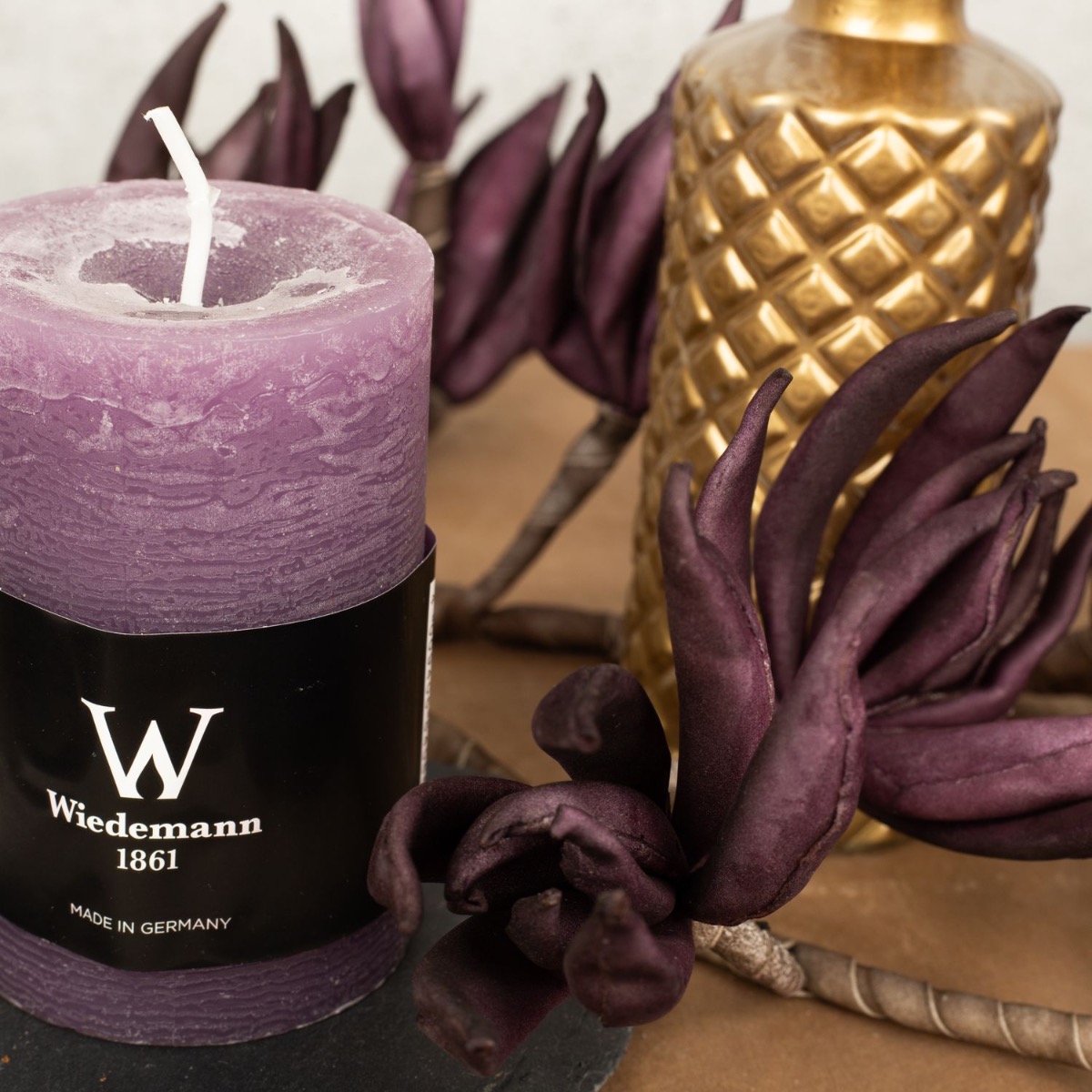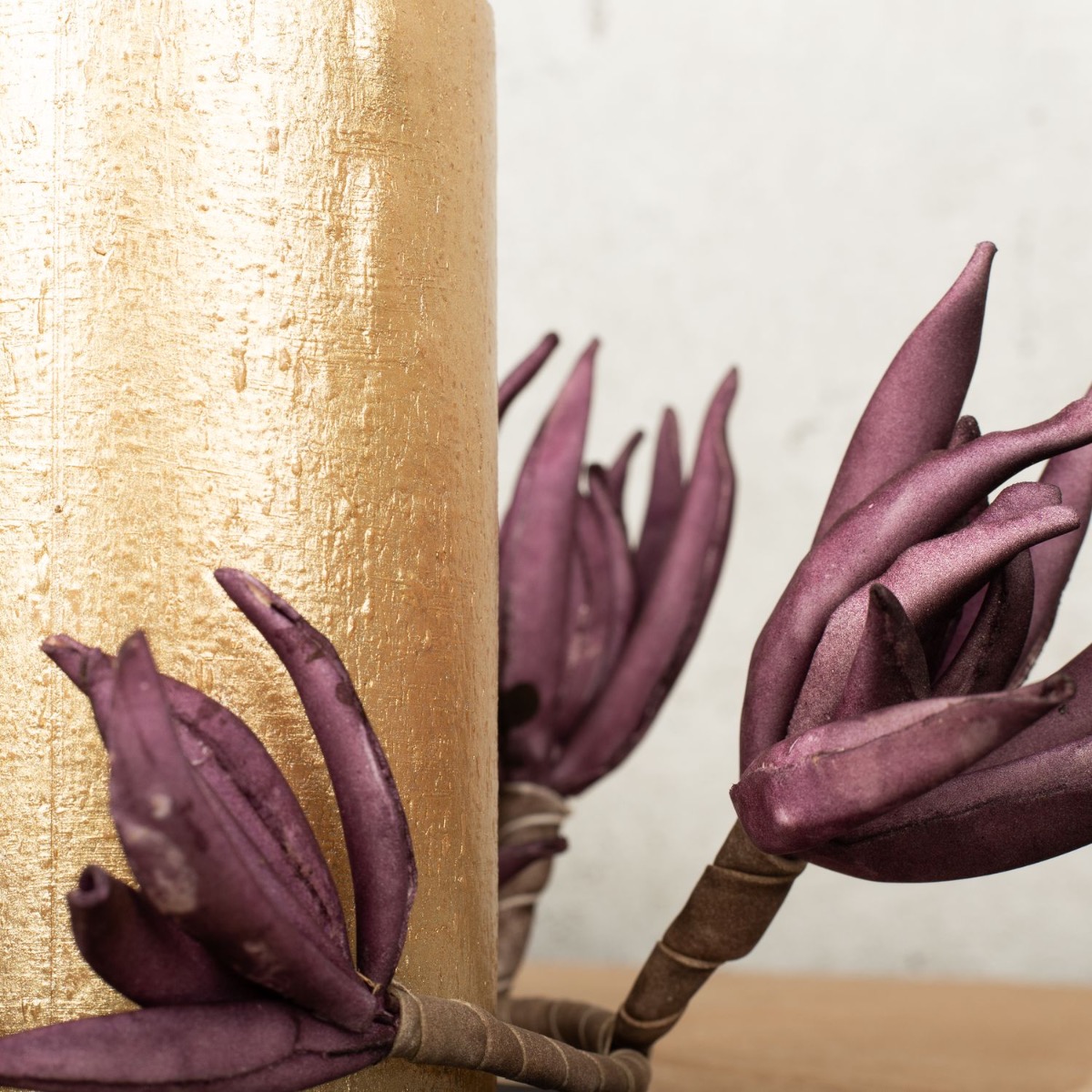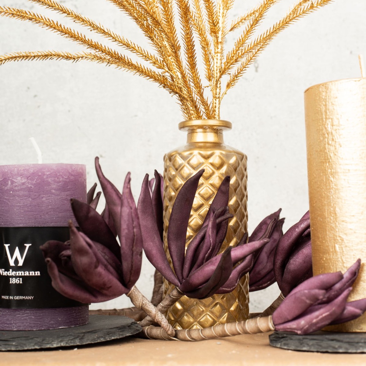 Conseil d'aménagement : La feuille de figuier dorée a d'abord été posée sur la table. Les feuilles servent en partie de support pour les bougies et les vases. On peut aussi enlever les feuilles de la tige, ce qui facilite la création. La branche de fleurs en mousse synthétique de couleur violette est posée à plat sur la table et les fleurs sont recourbées vers le haut. Il suffit de couper la tige ou de la plier autour des éléments de décoration.