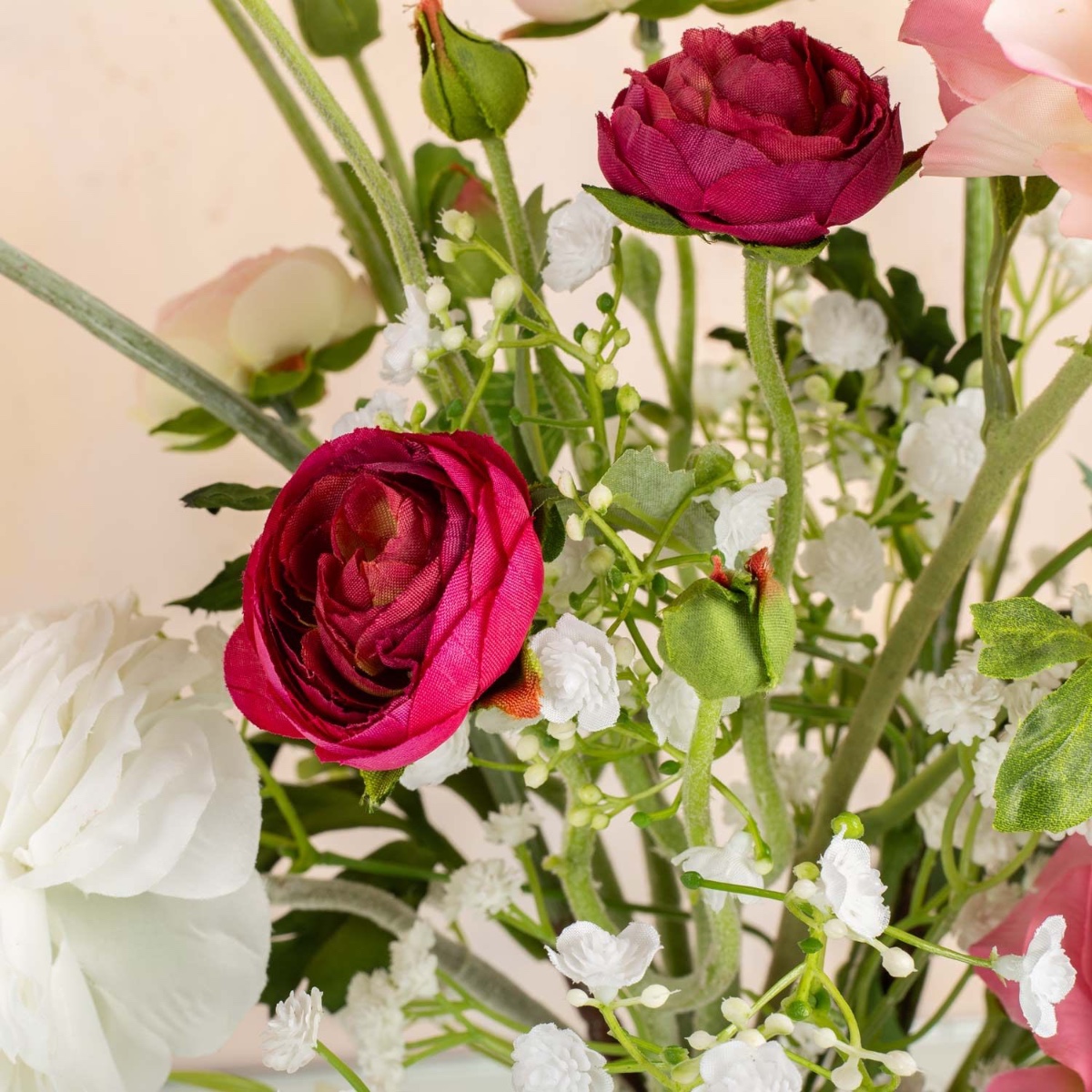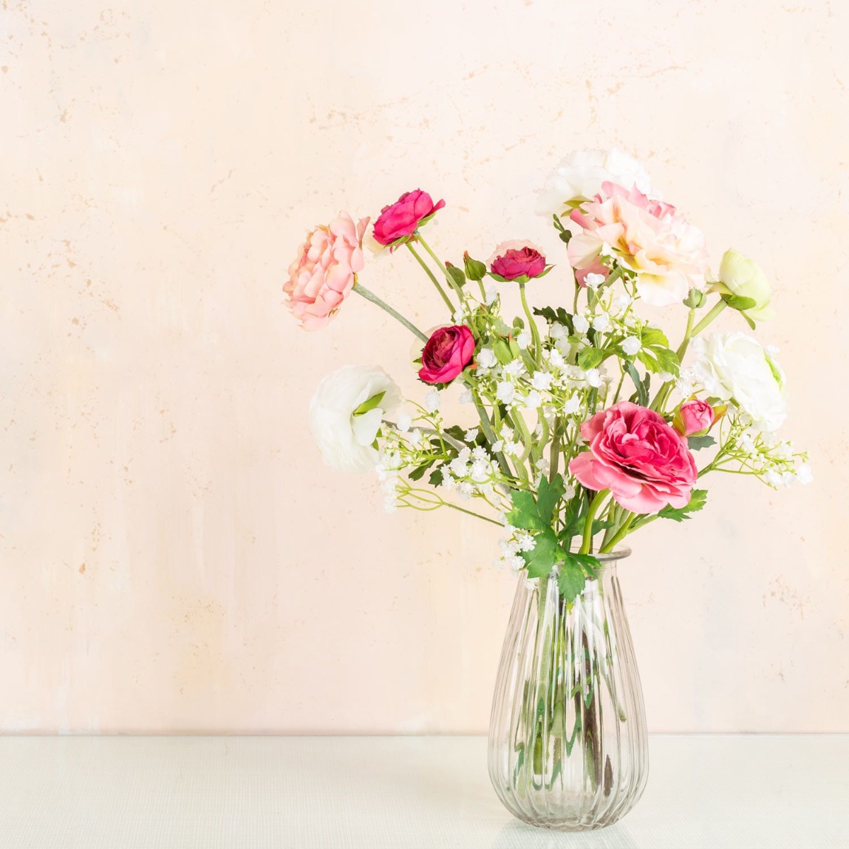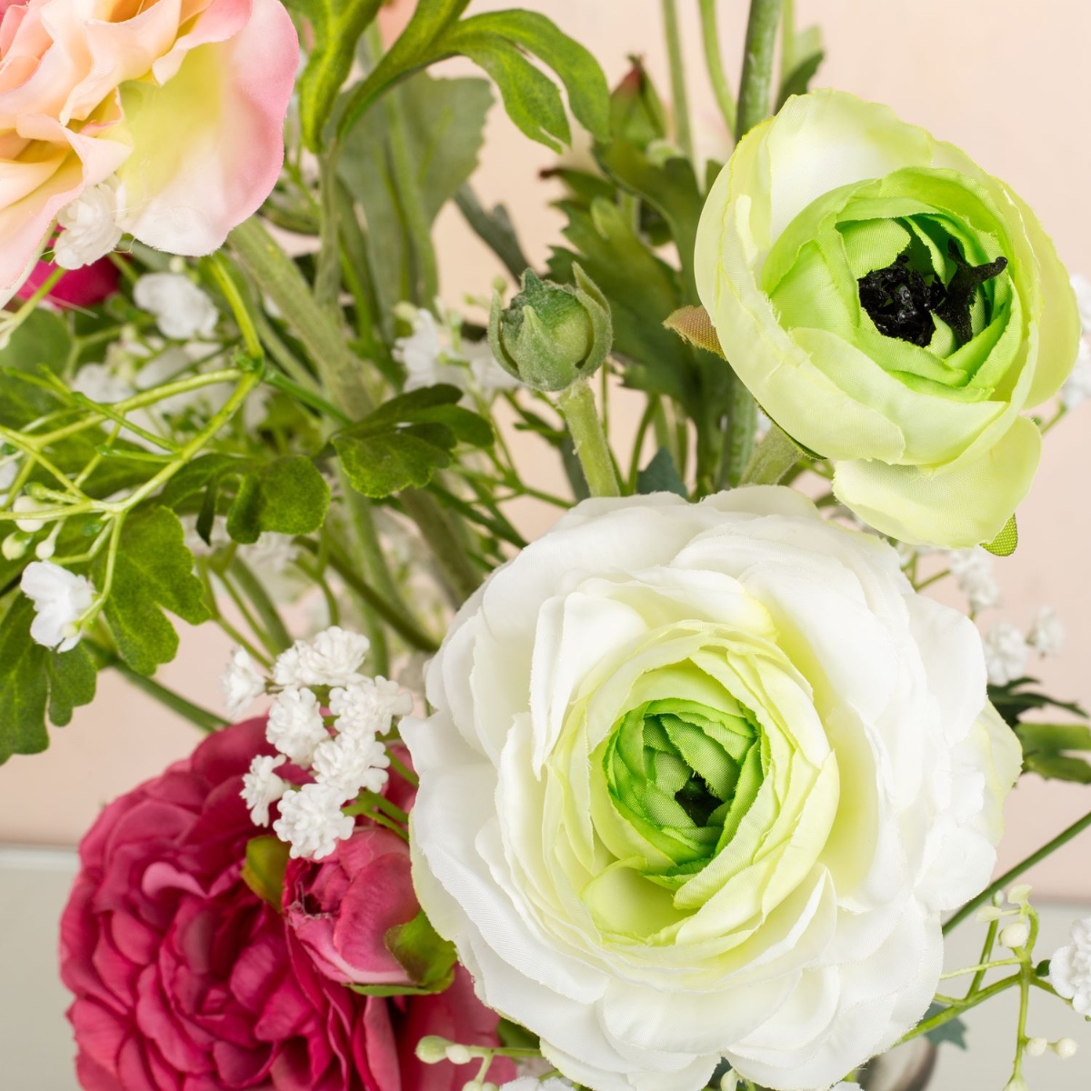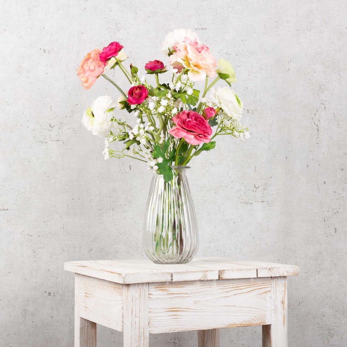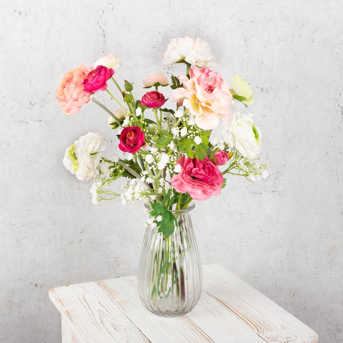 Le rose et le blanc ! Une combinaison de couleurs qui promet romantisme et harmonie. Les renoncules de différentes tailles, associées à un gypsophile délicat, produisent un effet tout simplement féerique. Un bouquet de renoncules symbolise la beauté et le caractère unique d'une personne. Un beau cadeau pour une personne exceptionnelle ! Shop the Look!