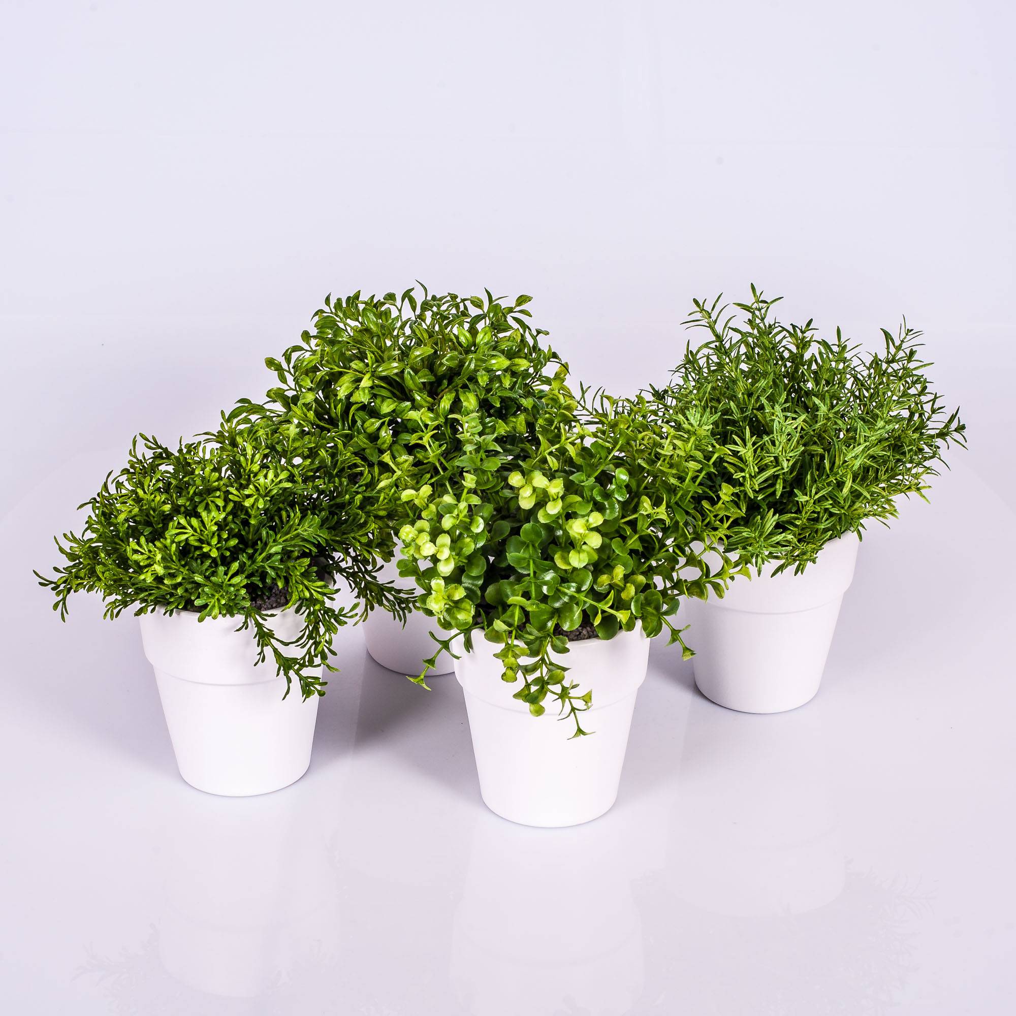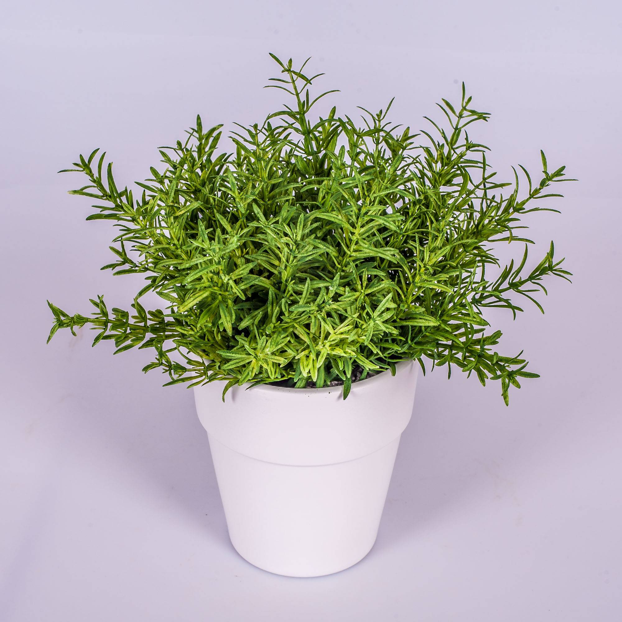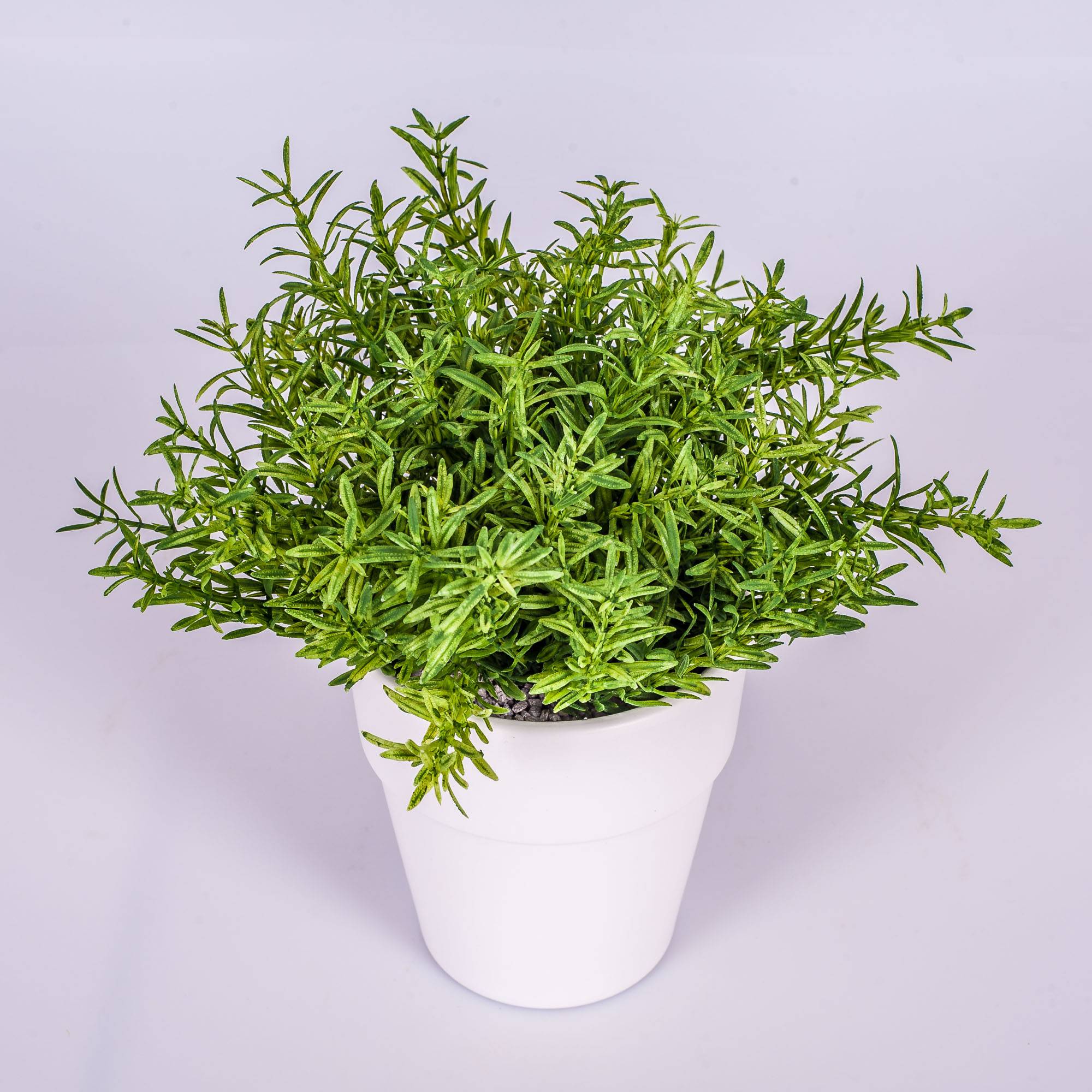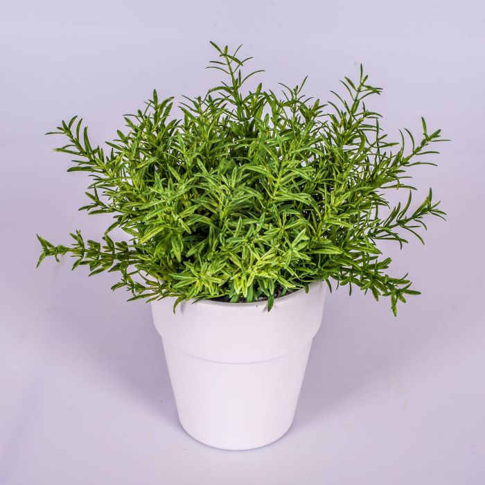 Pousse de romarin dans un petit pot en céramique blanc. La petite plante artificielle mesure environ 23 cm de haut et sera parfaite pour décorer la cuisine, dans une cantine ou une épicerie.
