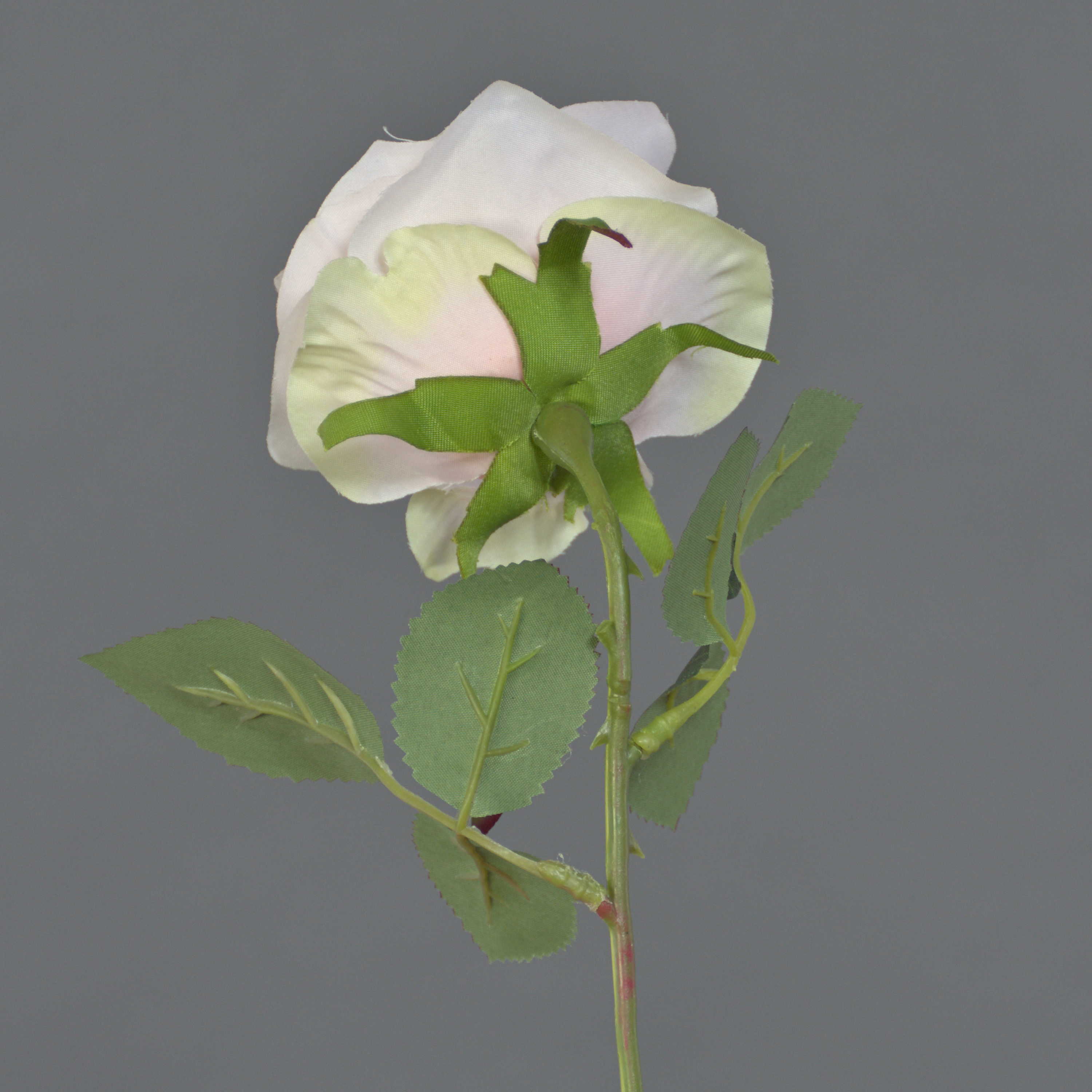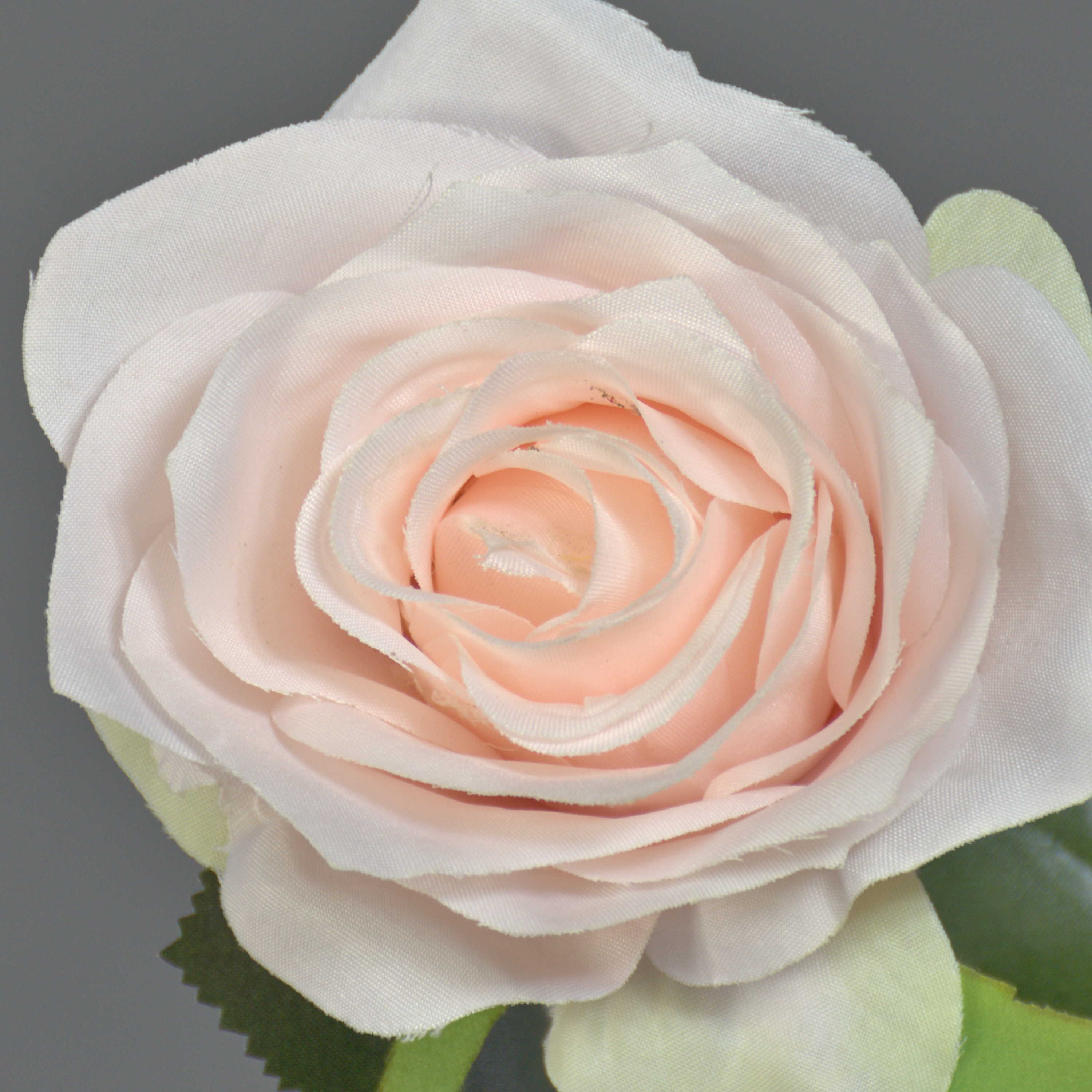 - Constituée d'une fleur ouverte aux finitions soignées et minutieuses de couleur rose pâle et de beaucoup de feuilles vertes, le tout est fabriqué à partir de fibre textile