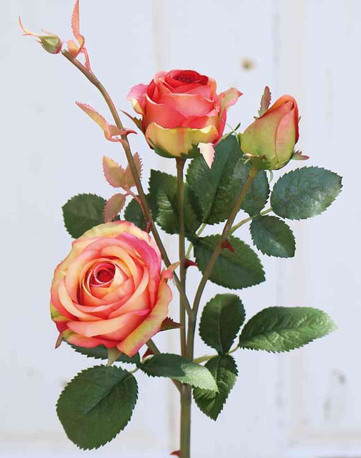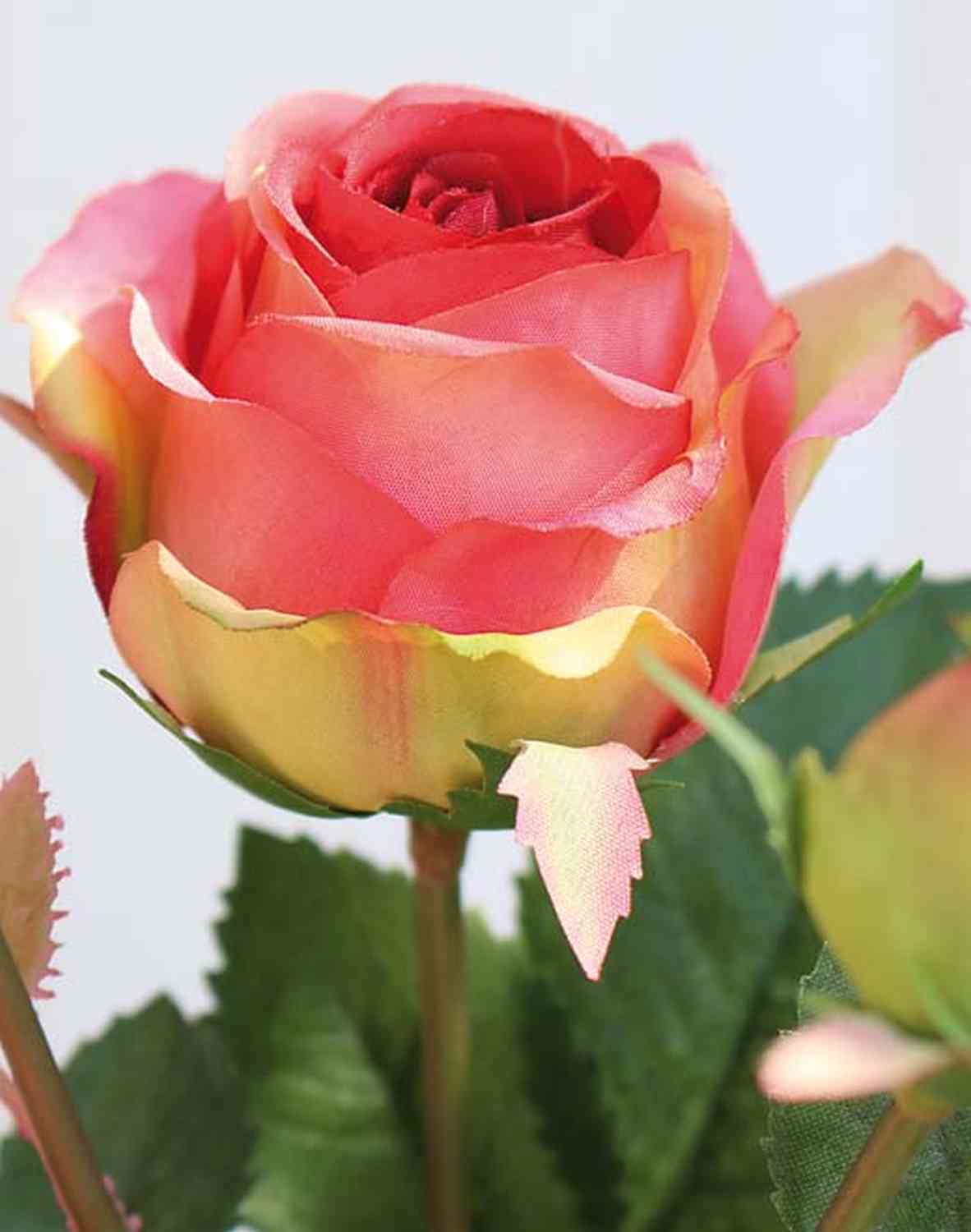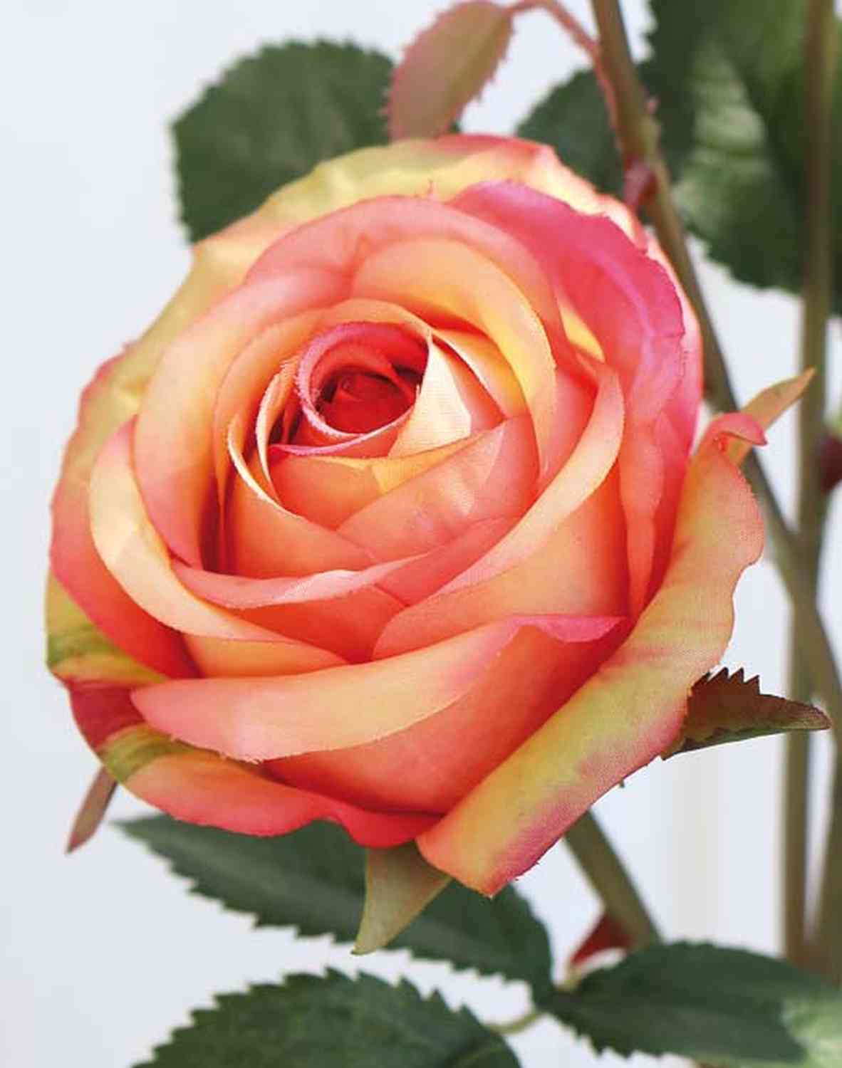 Rose artificielle DELILAH avec quelques feuilles et des épines sur la tige.