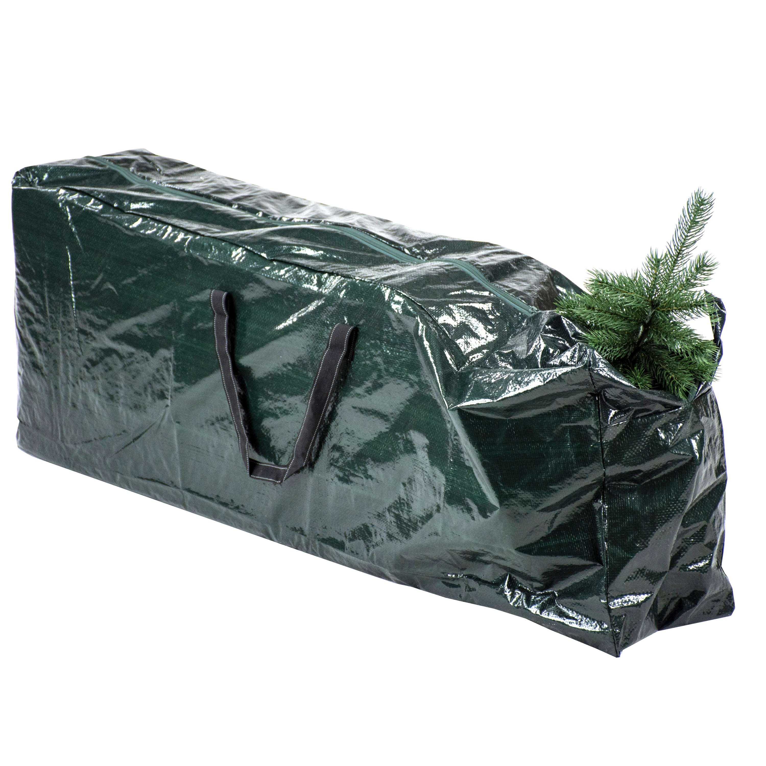 Sac vert en fibre polypropylène avec fermeture éclair et pourvu de 2 anses pour le rangement d’arbres mesurant jusqu’à 120 cm.